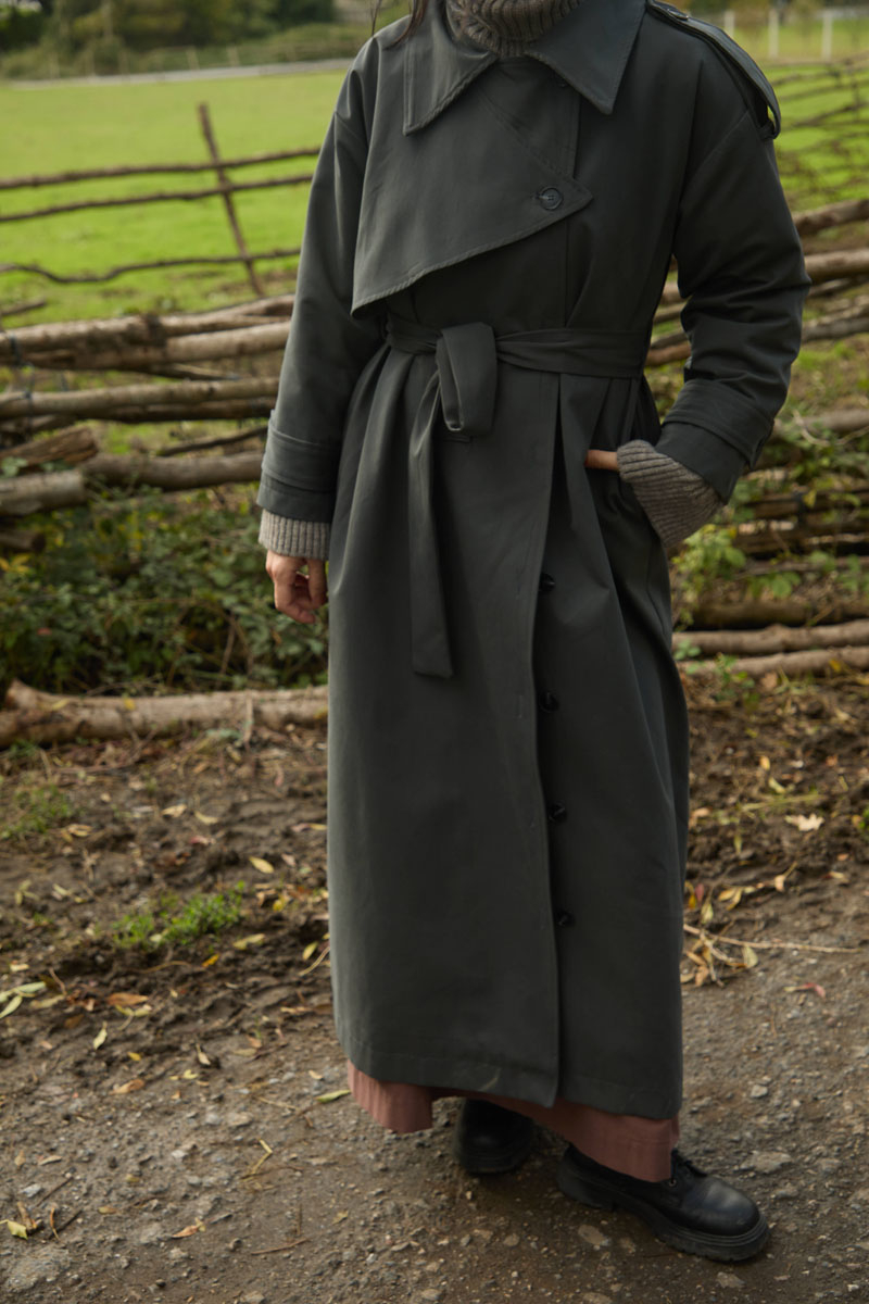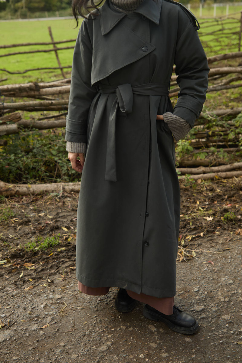 With its clean lines and modern details, this trenchcoat is one of the most stylish outerwear pieces for transitional seasons. The drop-shoulder design offers a relaxed and effortless silhouette, while the asymmetrical front closure gives a contemporary twist to the classic trenchcoat style. The waist belt allows for an adjustable fit, highlighting the figure and creating a feminine shape. Thanks to its lightweight textured fabric, it ensures comfort whether worn in the city or for everyday outings.