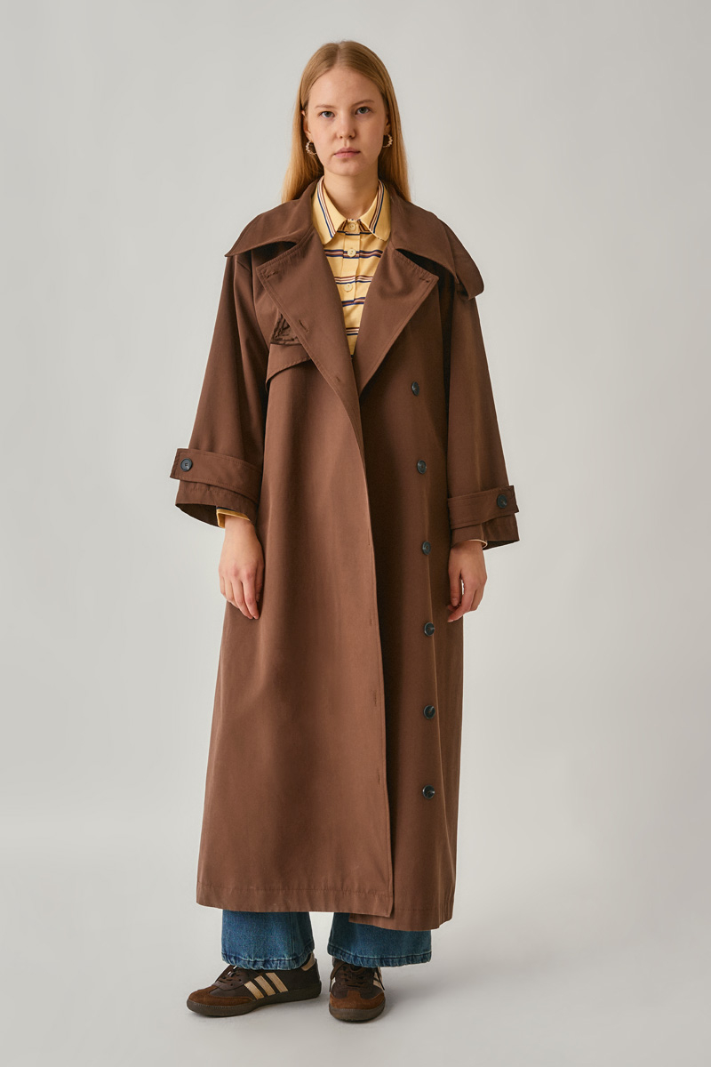 With its clean lines and modern details, this trenchcoat is one of the most stylish outerwear pieces for transitional seasons. The drop-shoulder design offers a relaxed and effortless silhouette, while the asymmetrical front closure gives a contemporary twist to the classic trenchcoat style. The waist belt allows for an adjustable fit, highlighting the figure and creating a feminine shape. Thanks to its lightweight textured fabric, it ensures comfort whether worn in the city or for everyday outings.