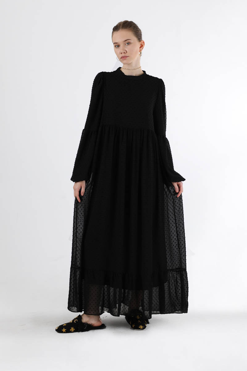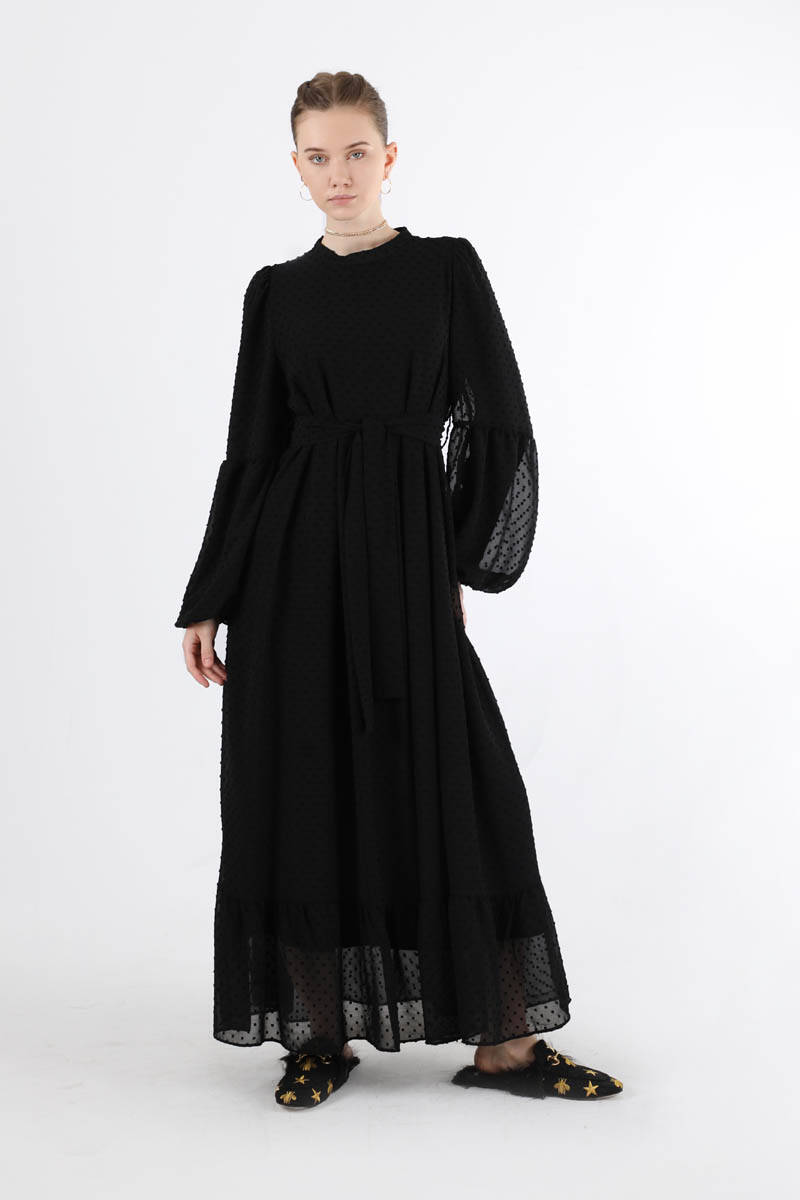 Avril Chiffon Dress Black. It is lined. Balloon sleeves. The cuff is elastic. The hem is pleated. The middle of the sleeve is shirred. The judge is lame. It is belted. It has a back zipper. The fabric is speckled cut chiffon.