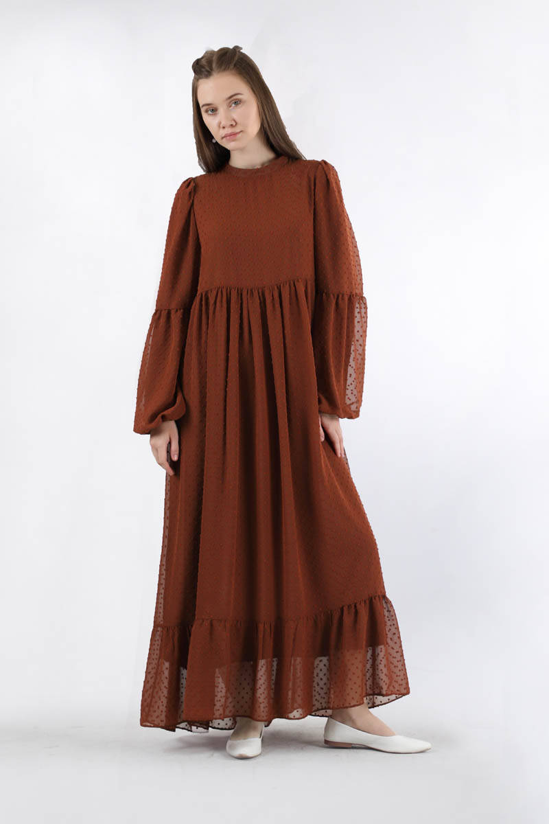 Avril Chiffon Dress Brown. It is lined. Balloon sleeves. The cuff is elastic. The hem is pleated. The middle of the sleeve is shirred. The judge is lame. It is belted. It has a back zipper. The fabric is speckled cut chiffon.