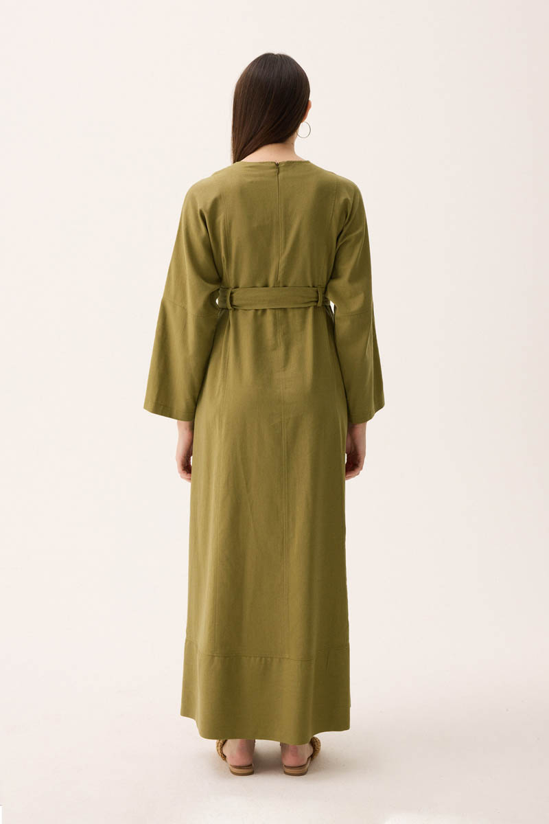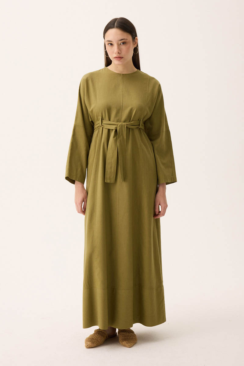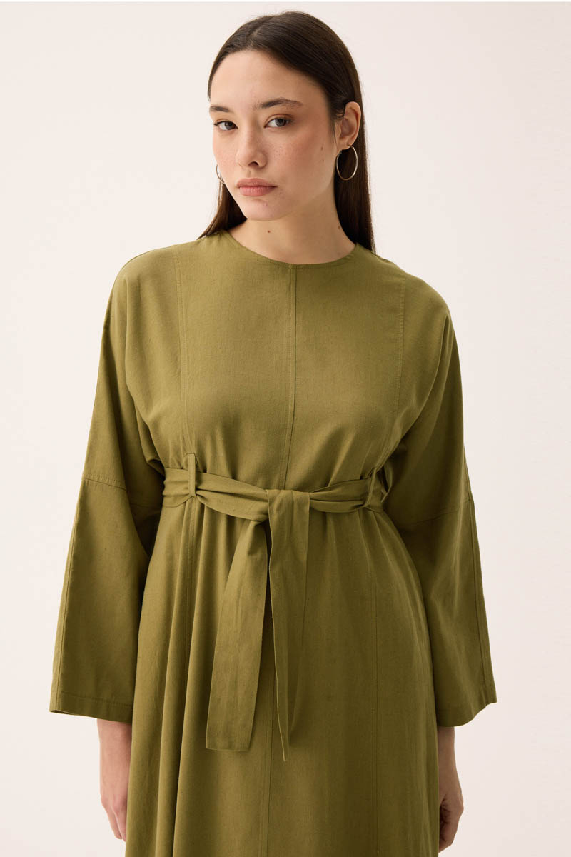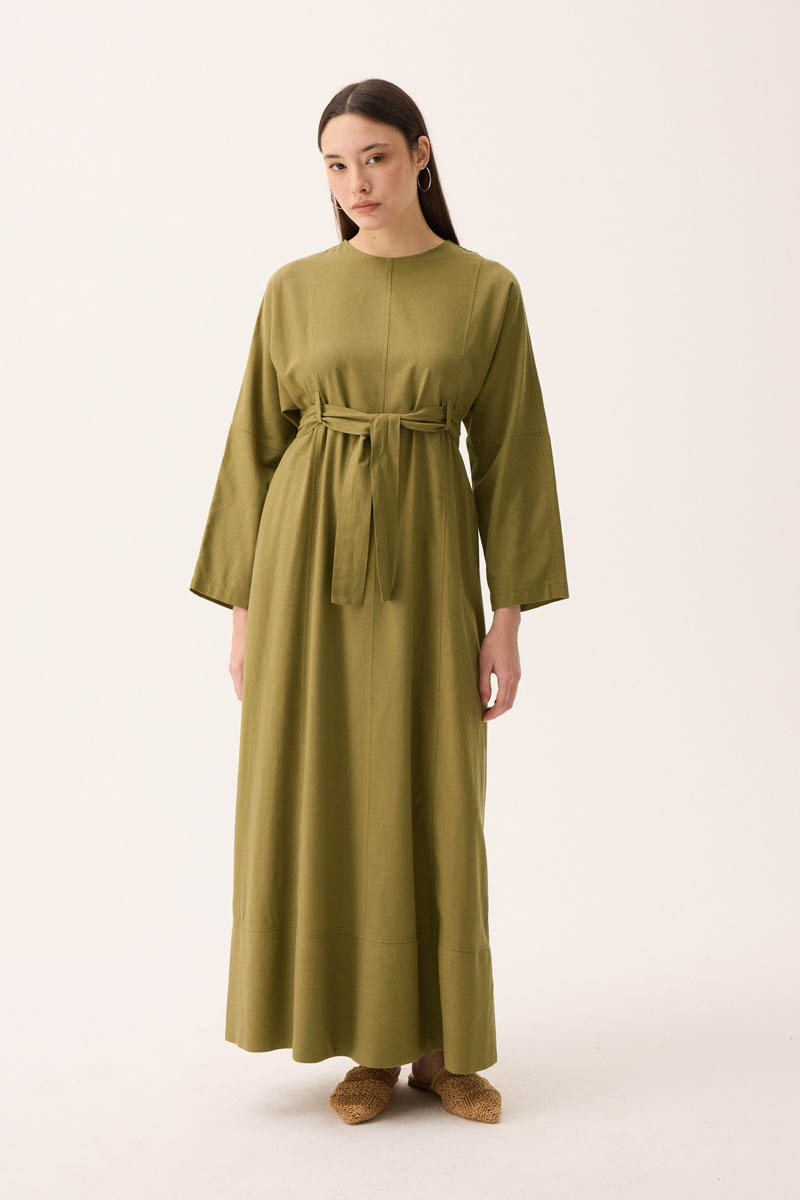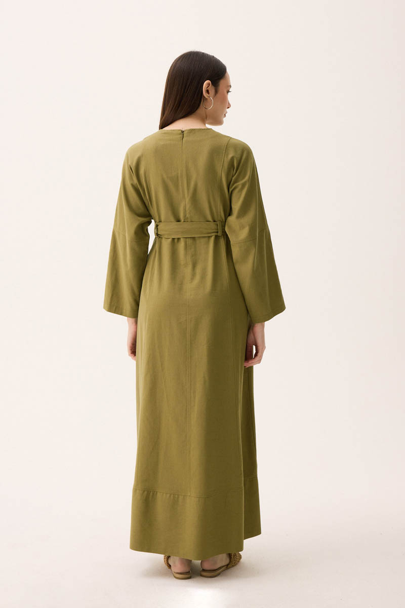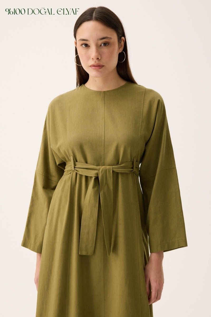 Ayana Keten Elbise Haki. Bisiklet yakadır, düşük kolludur, kol dikiş detaylıdır, Önü kup parça dikiş detaylıdır, köprülü ve kemerlidir astarsızdır. Günlük kullanım için uygundur.