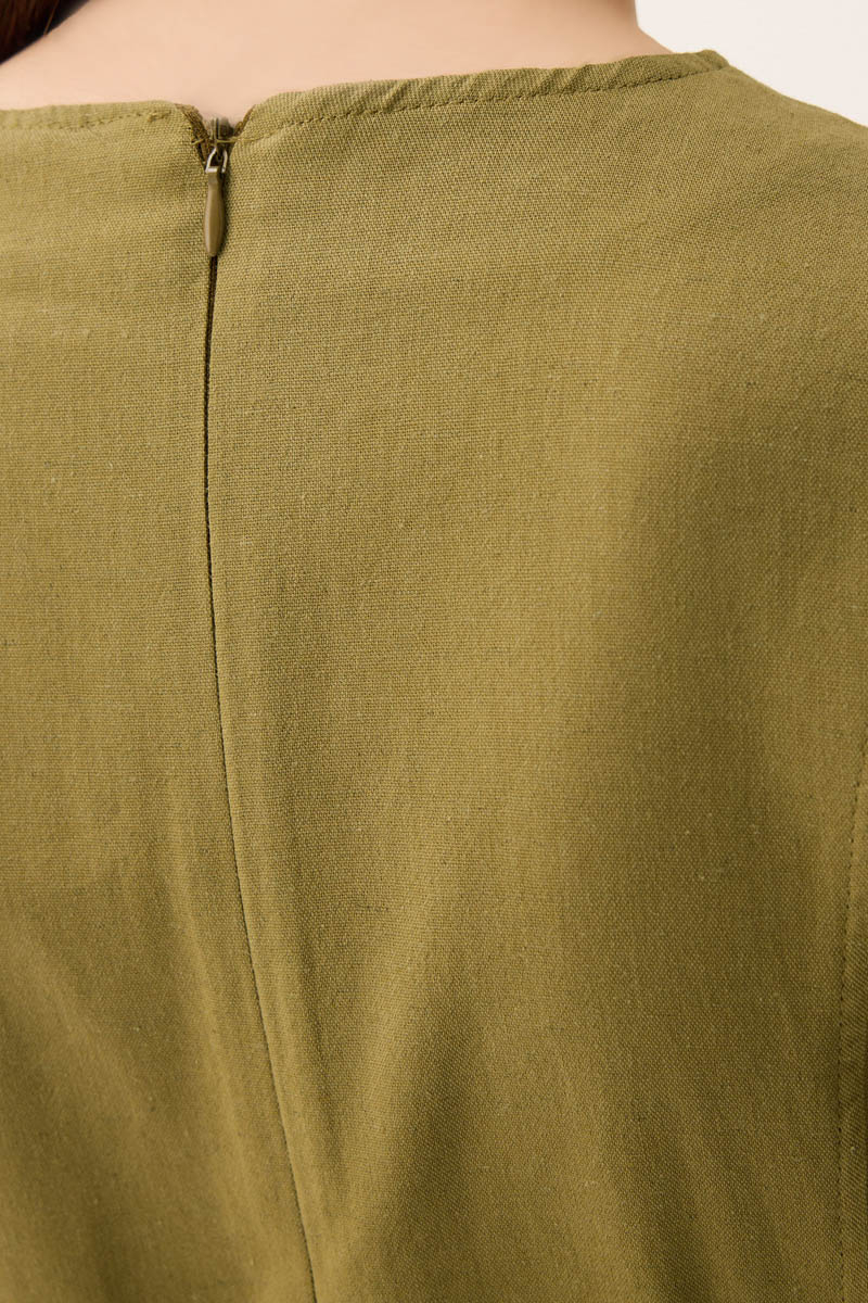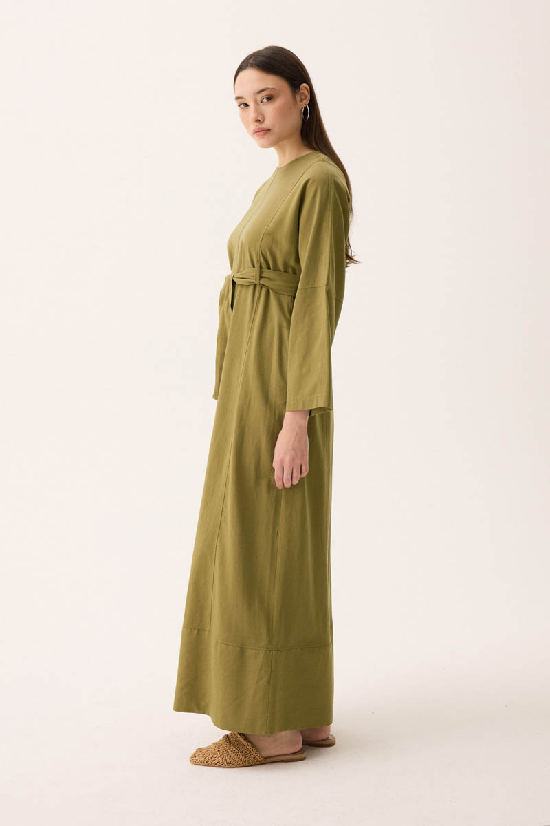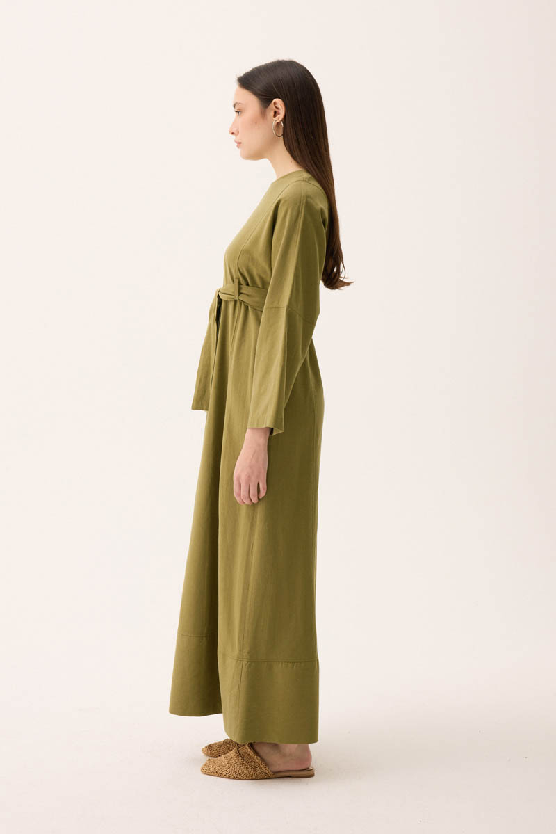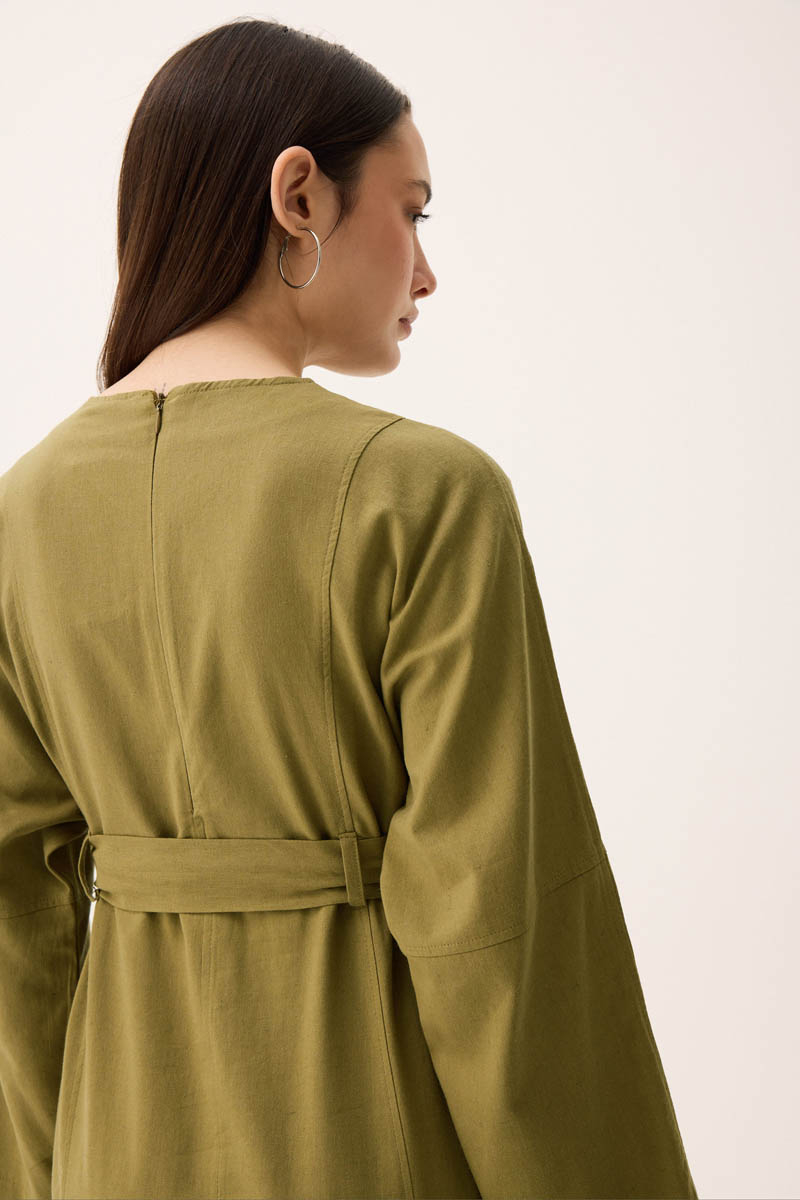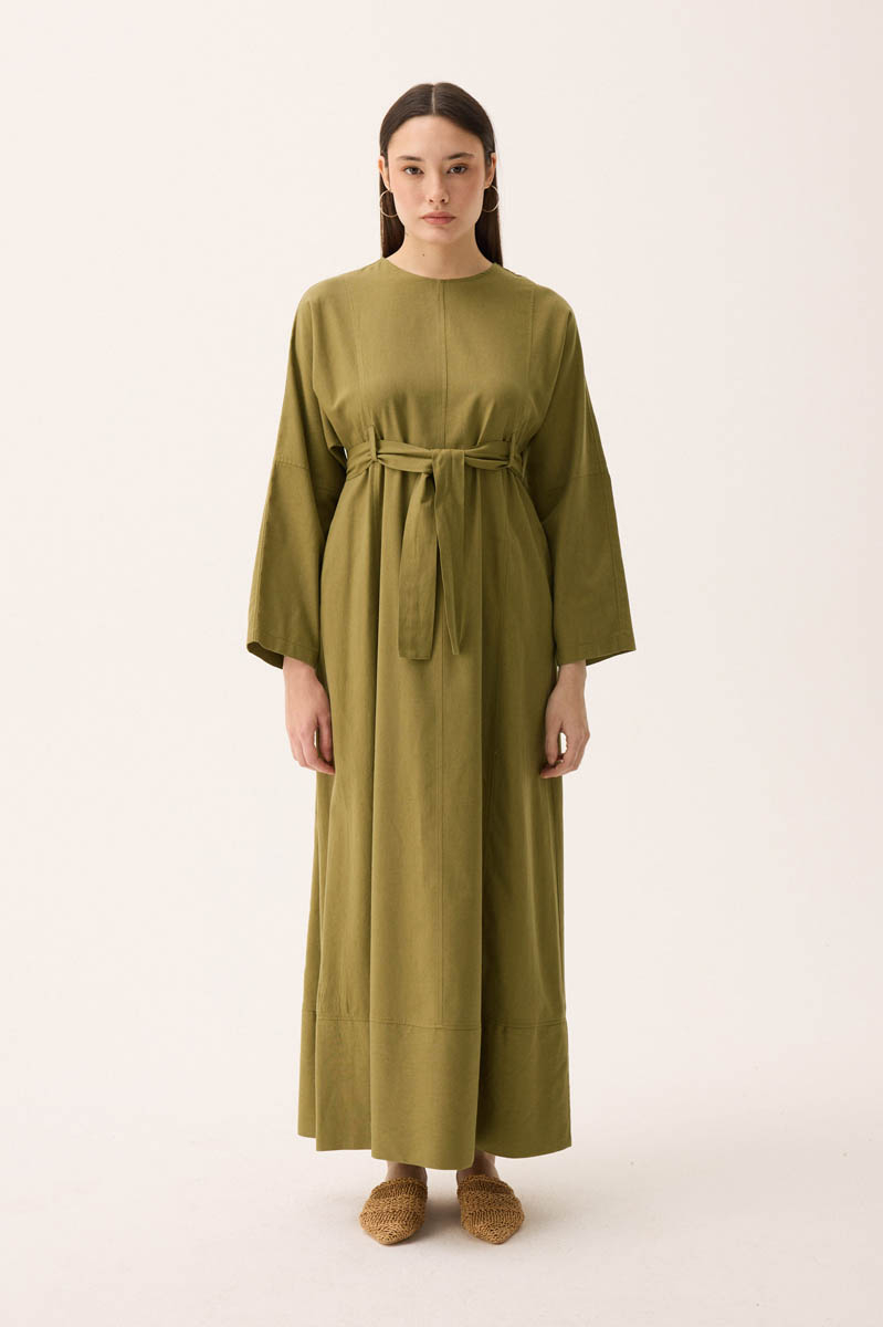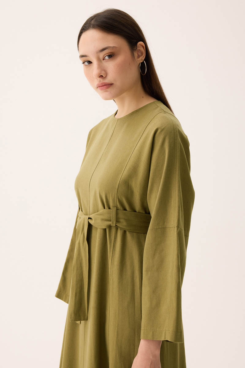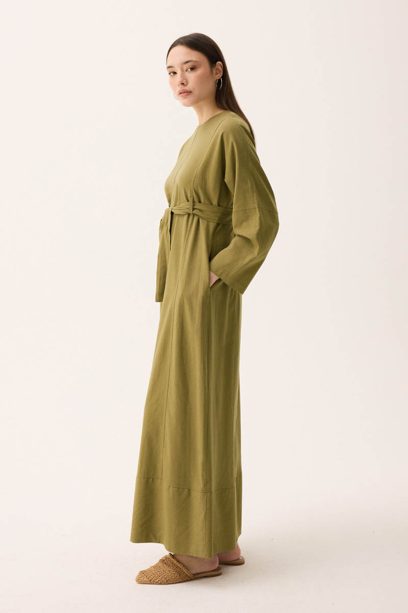 Ayana Keten Elbise Haki. Bisiklet yakadır, düşük kolludur, kol dikiş detaylıdır, Önü kup parça dikiş detaylıdır, köprülü ve kemerlidir astarsızdır. Günlük kullanım için uygundur.