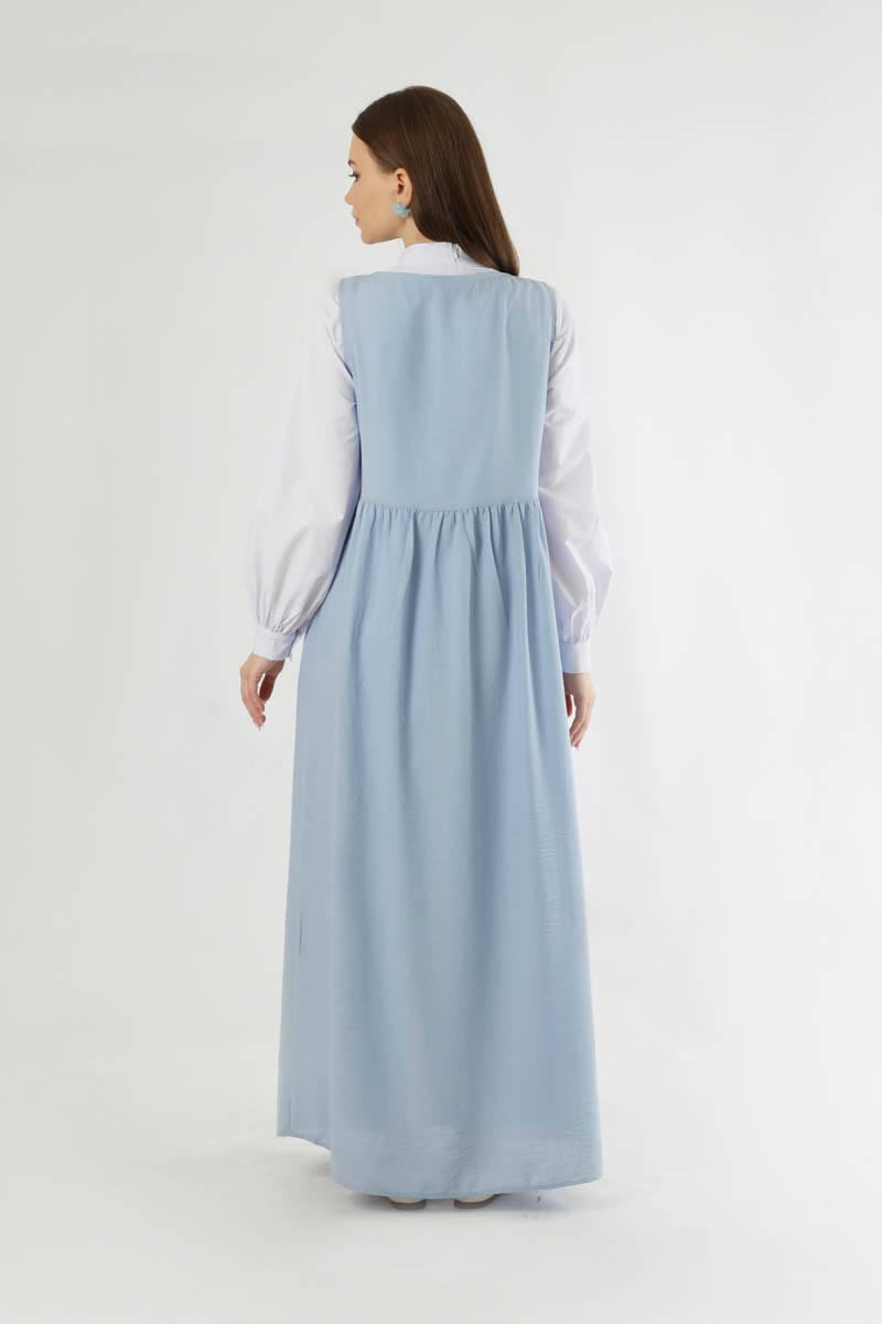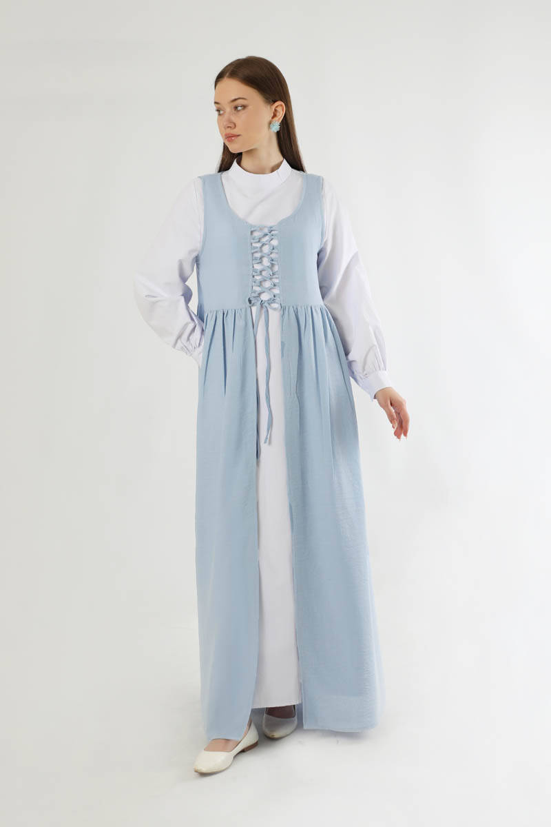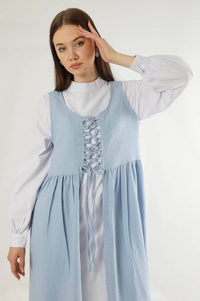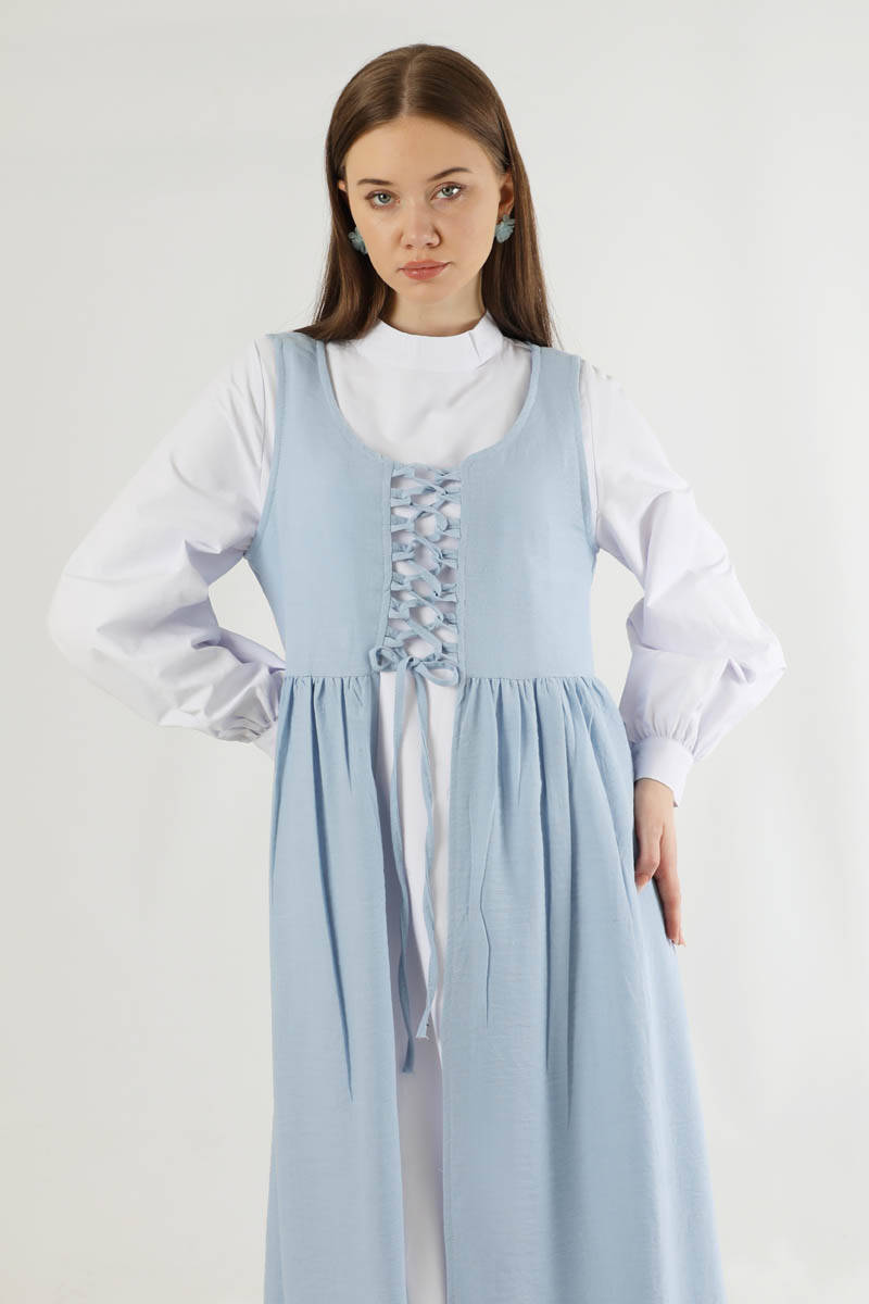 Lace-up Gilet Set Baby Blue. Gilet lace detail. The waist is shirred. The dress has a judge collar. It has a back zipper. the cuff is buttoned. You can choose it for your daily use and special occasions.