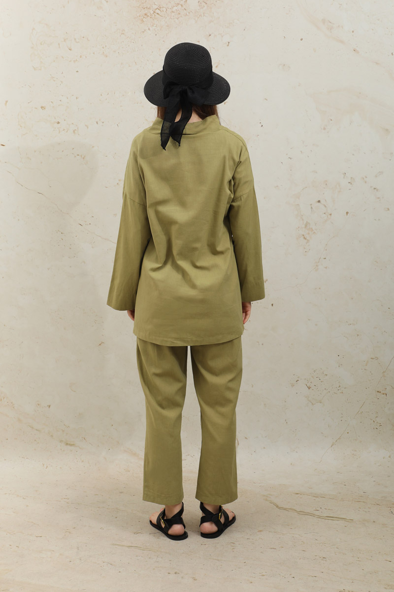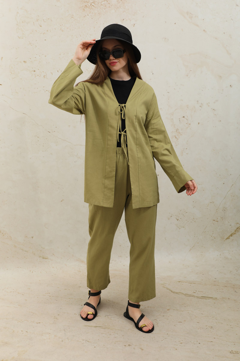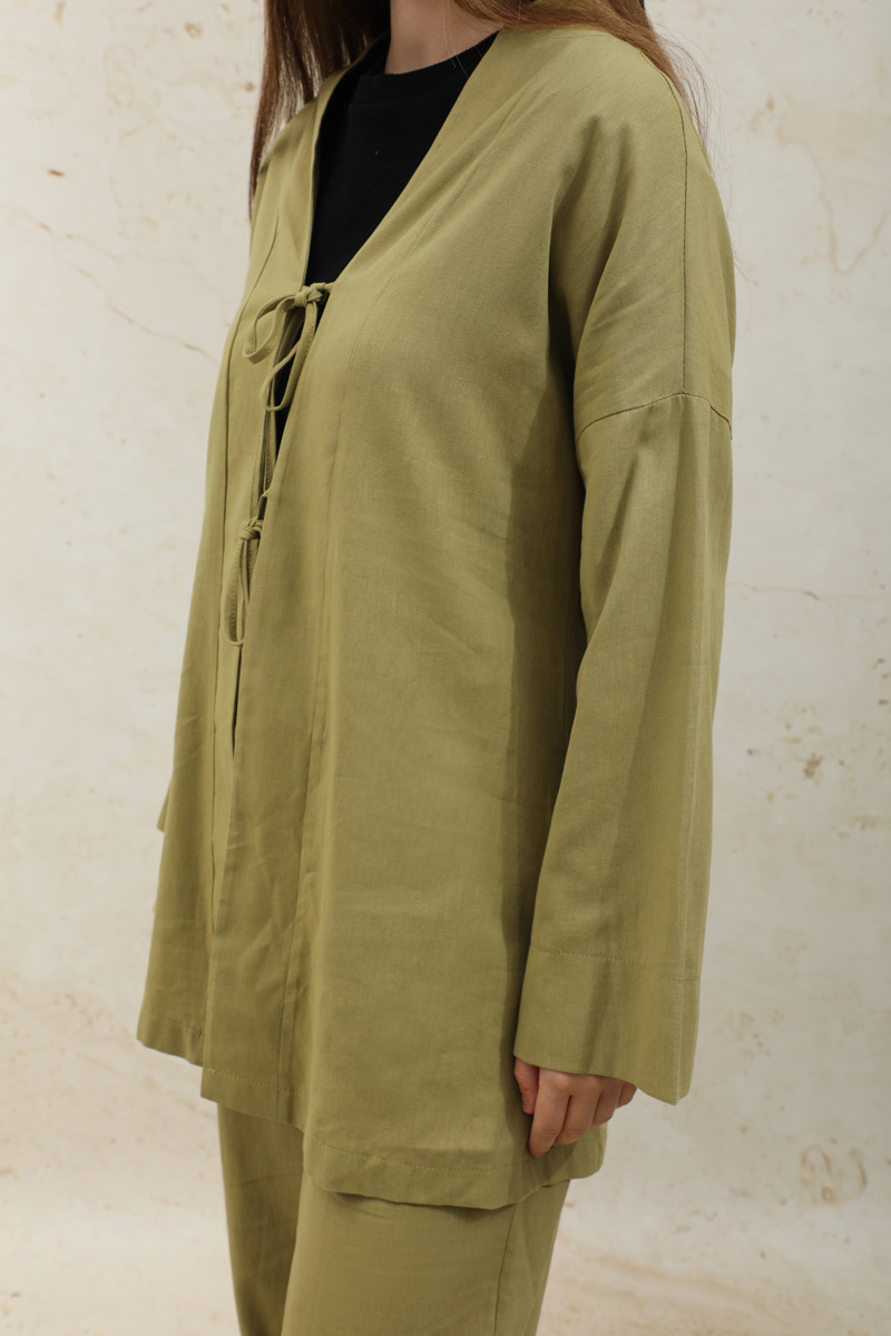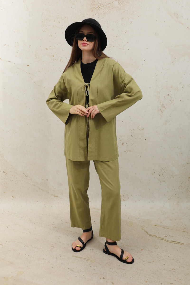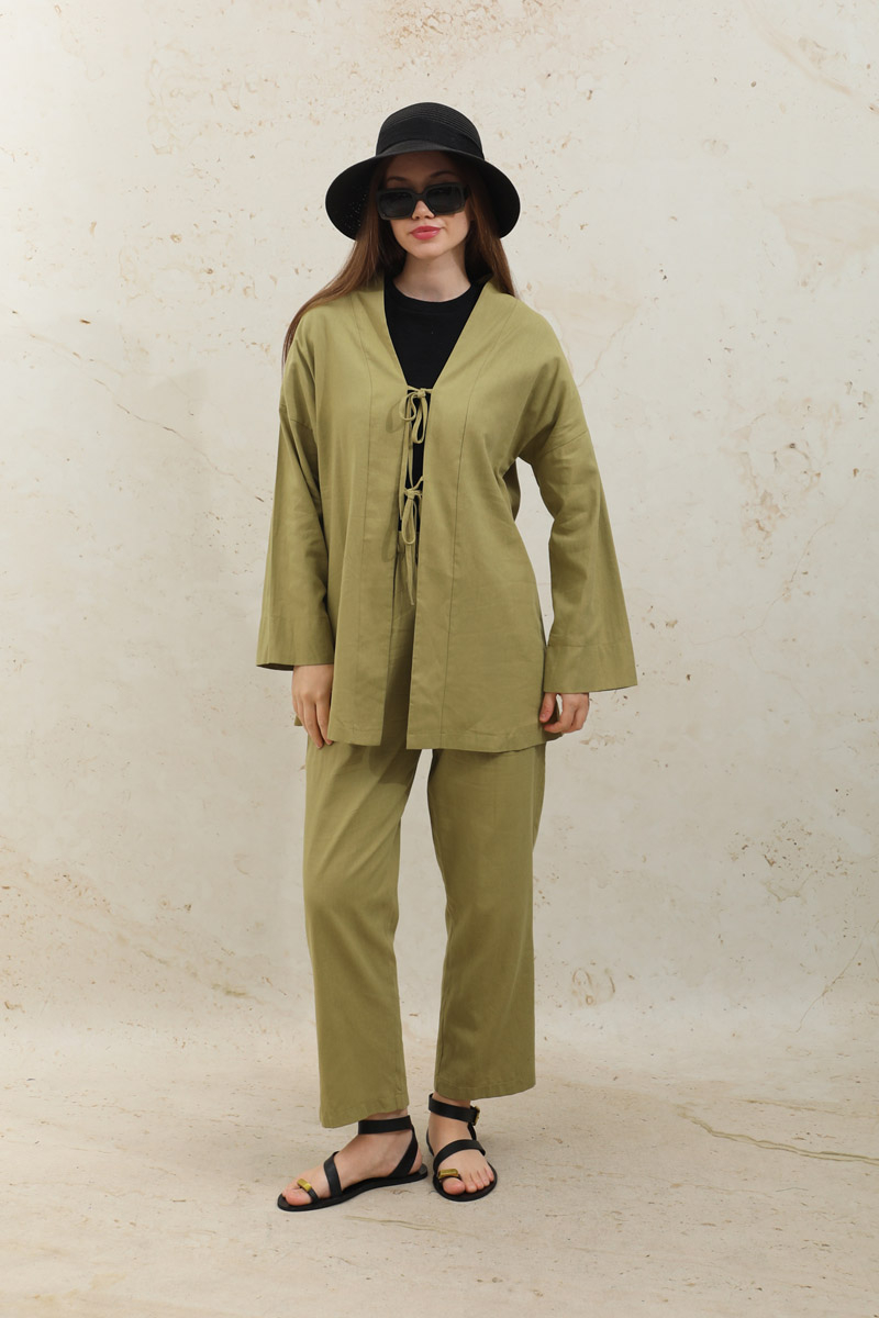 Bağcıklı Kimona Takım Yağ Yeşili.Kimona, önden çift bağcıklıdır, şal yakalıdır, düşük omuzludur, kalın manşetlidir, cepsizdir. Pantolon beli lastiklidir, düz paçadır, cepsizdir.