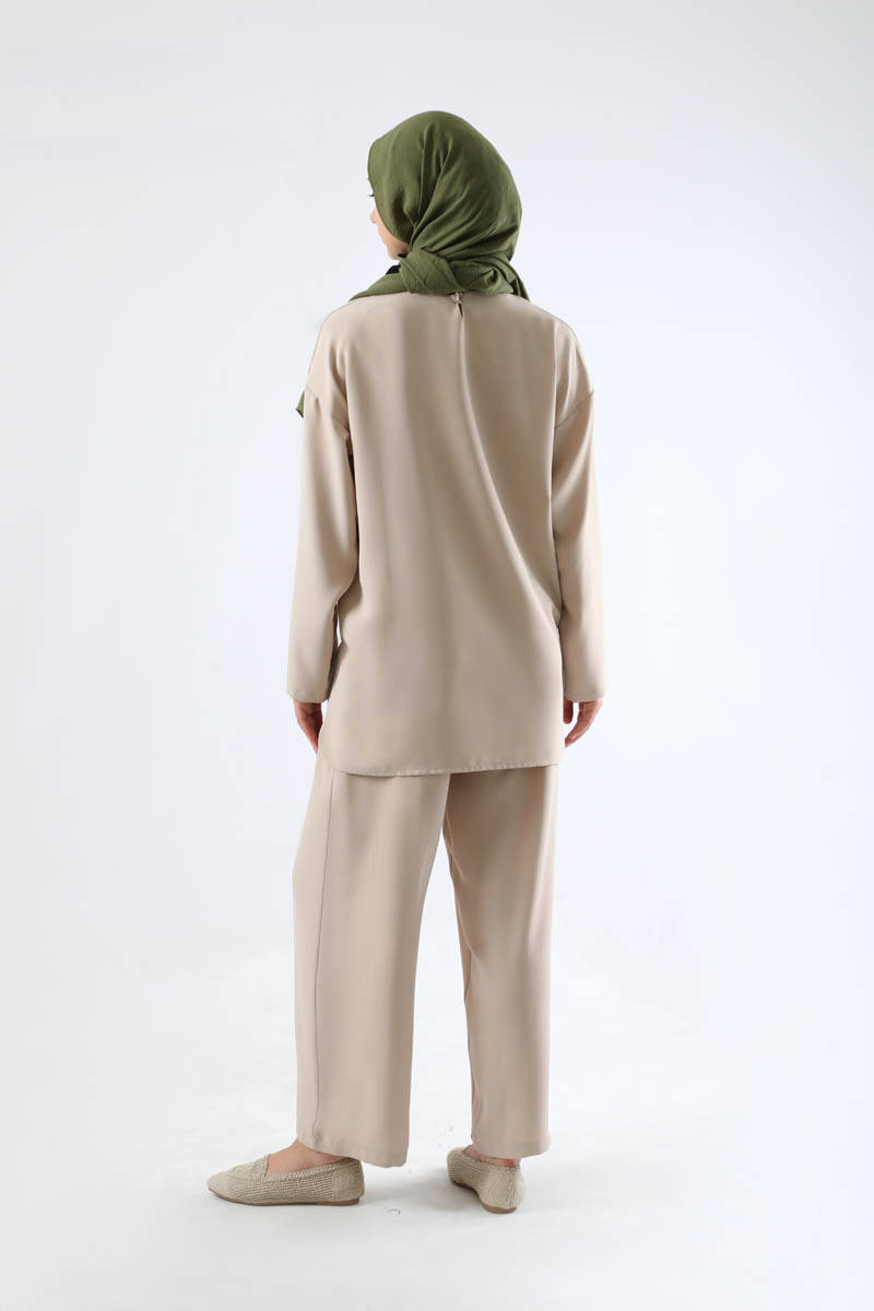 Büzgü detaylı. Kuşaklı. Cepli. Pantolon ile takım olarak satılmaktadır.