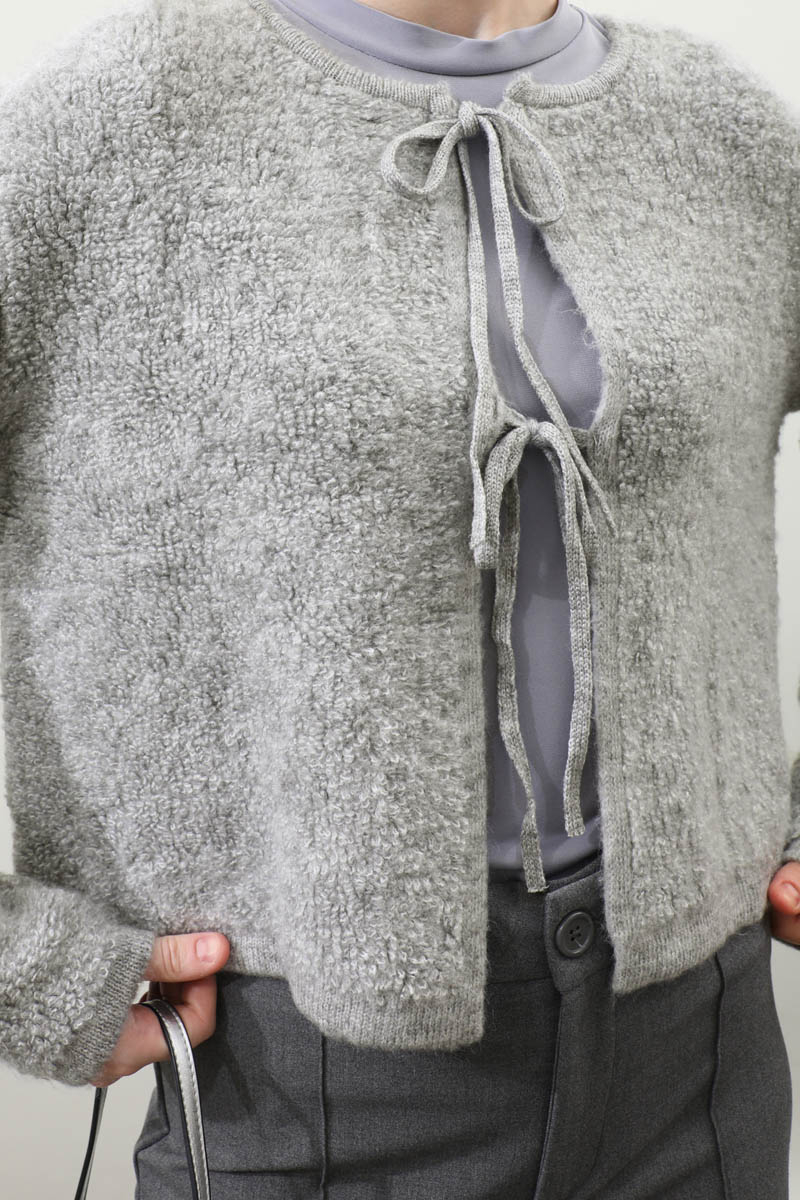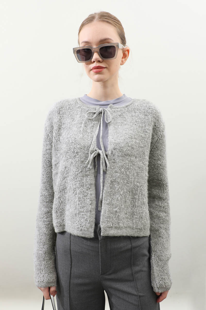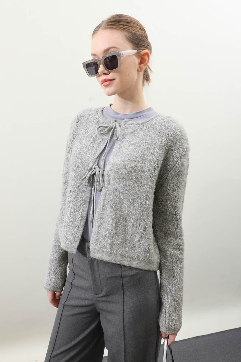 Bağlamalı Peluş Triko Kazak Gri. Bisiklet yakadır. önden bağcık bağlamalıdır, düşük omuzludur, maşet ve etek ucu kısa ribanalıdır, cepsizdir. Günlük kullanım ve özel günlerinizde tercih edebilirsiniz.
