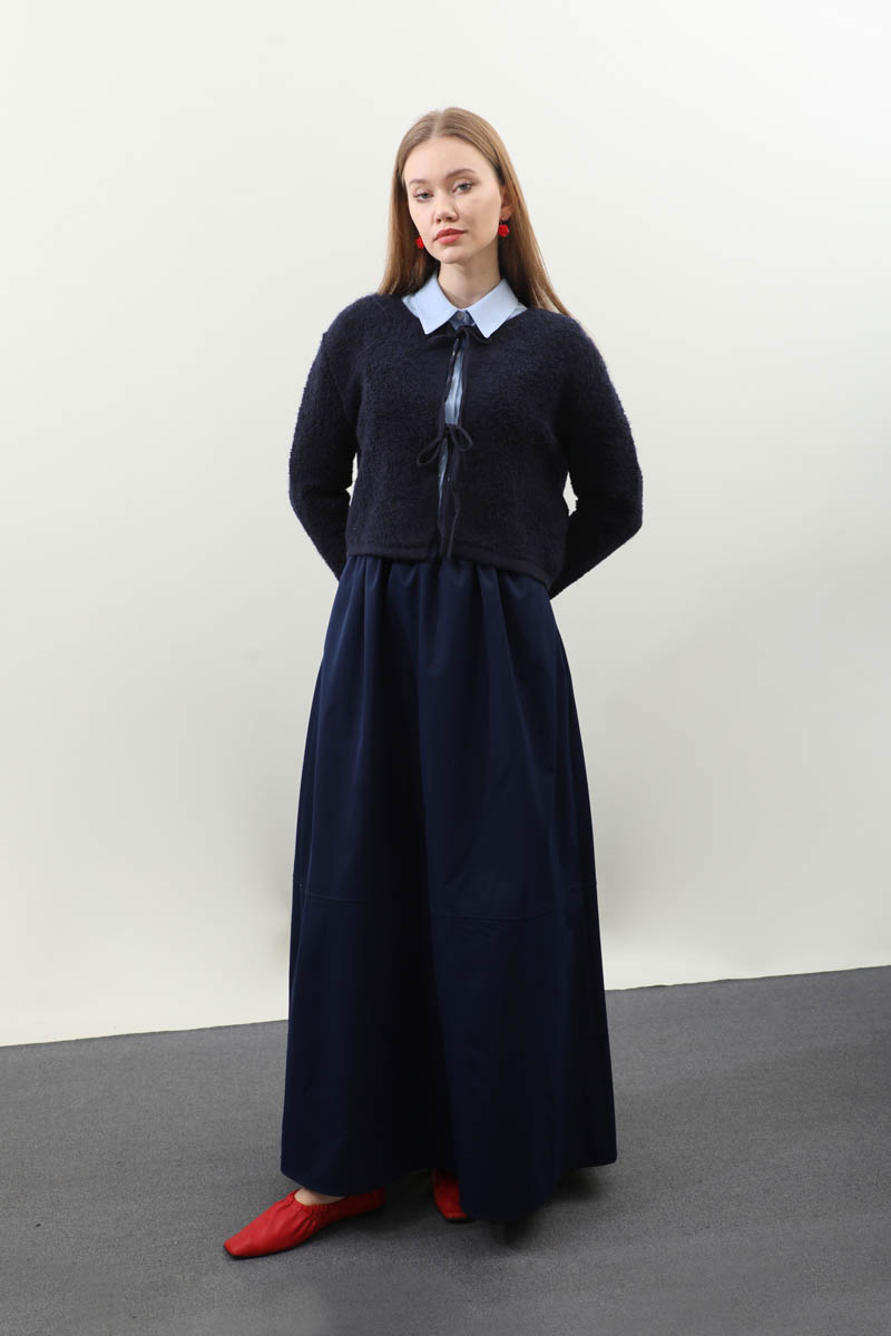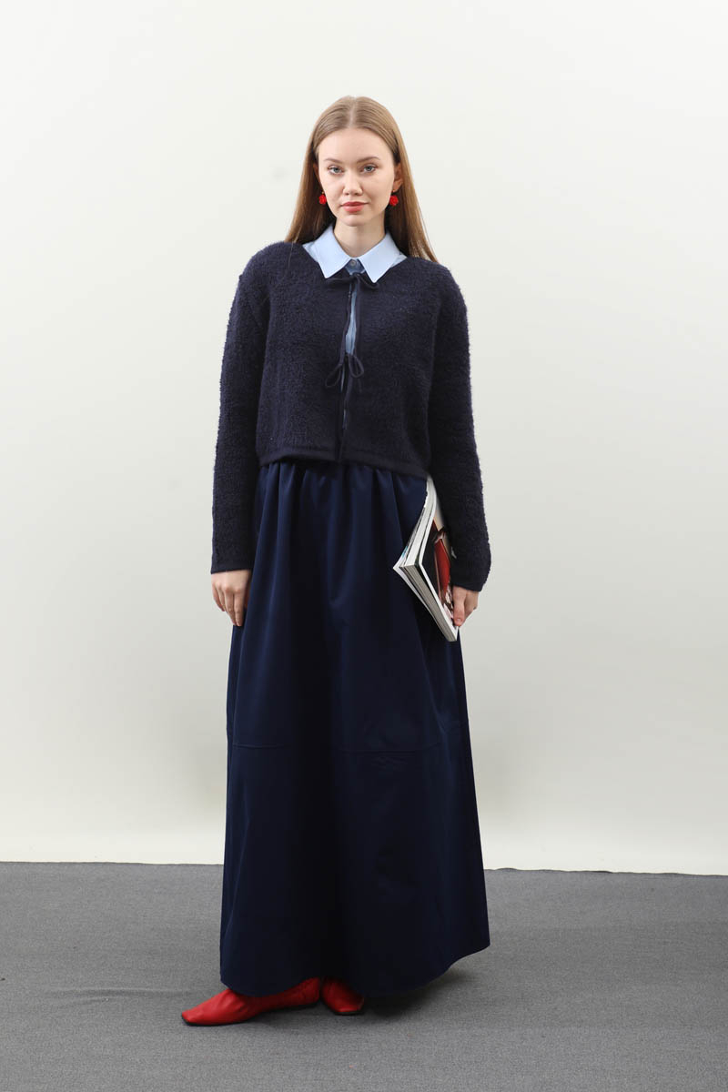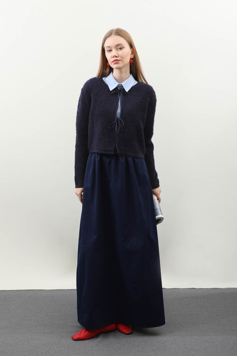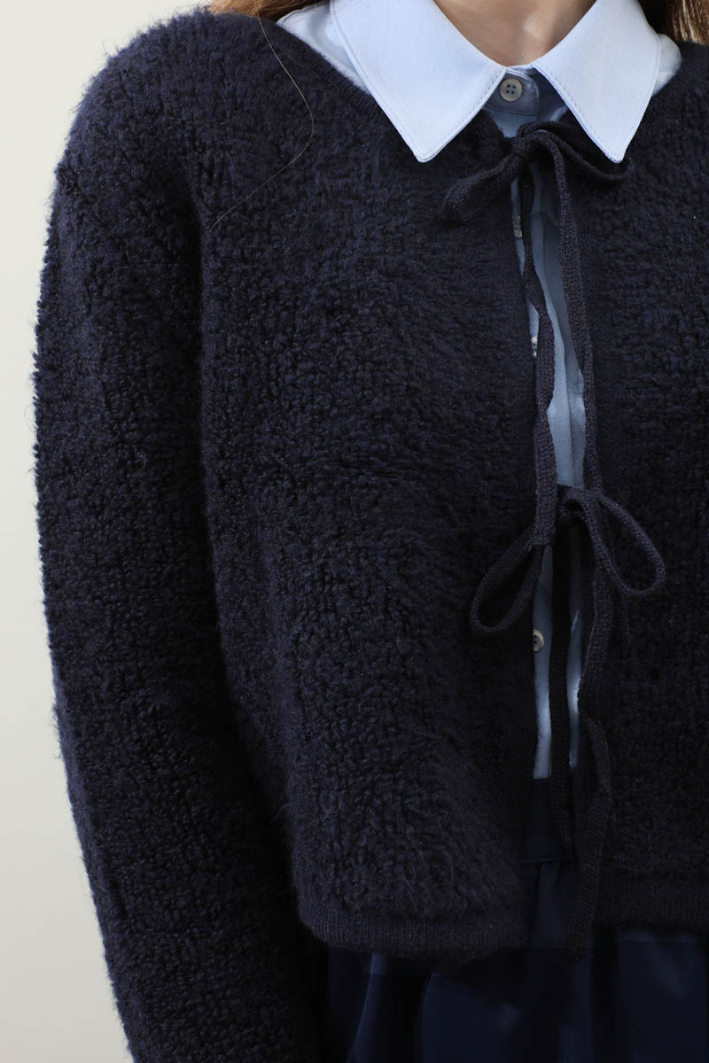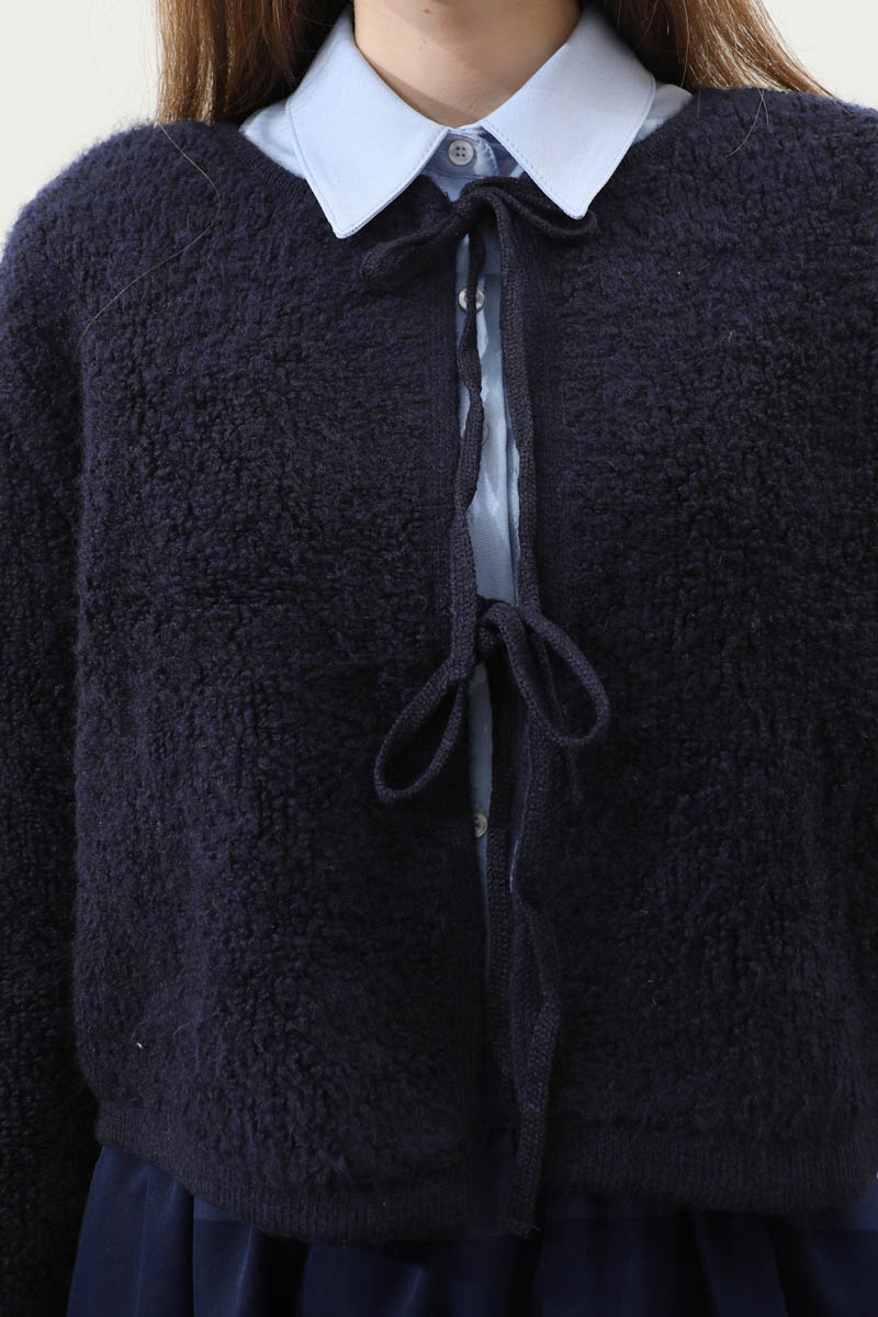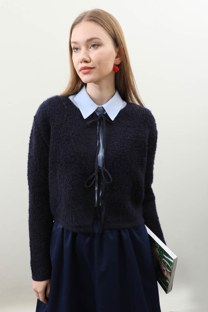 Bağlamalı Peluş Triko Kazak Lacivert. Bisiklet yakadır. önden bağcık bağlamalıdır, düşük omuzludur, maşet ve etek ucu kısa ribanalıdır, cepsizdir. Günlük kullanım ve özel günlerinizde tercih edebilirsiniz.
