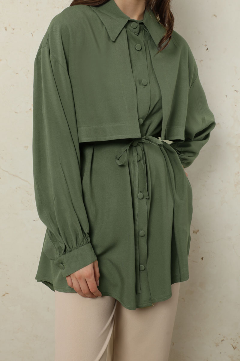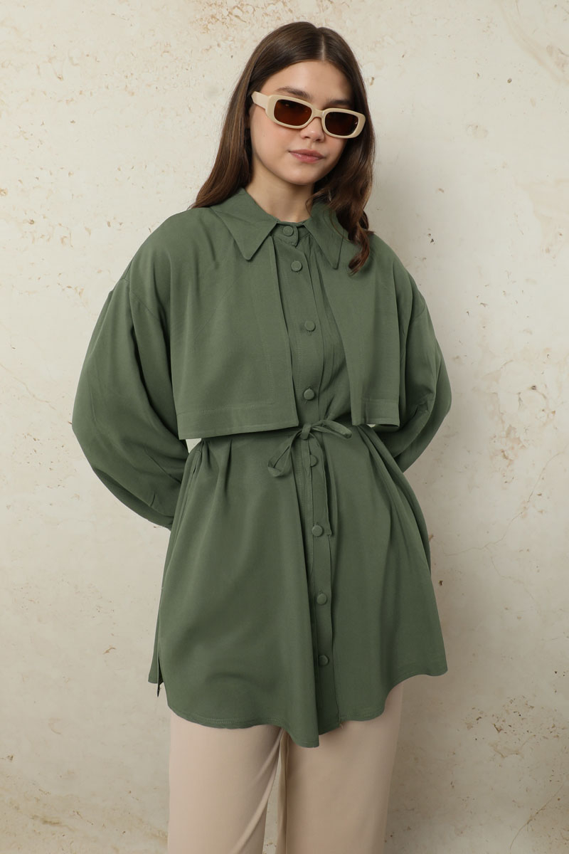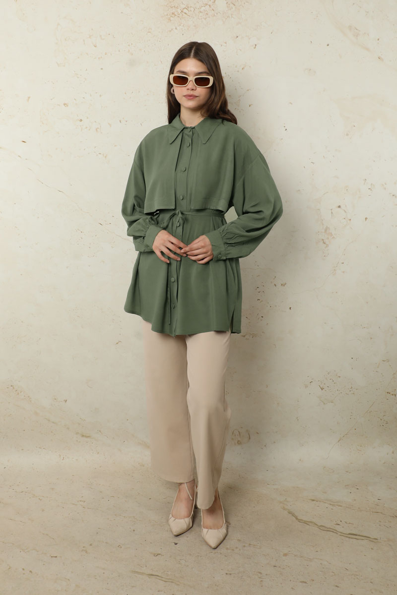 Bağlamalı Tunik Gömlek Haki. Önü düğmelidir. Gömlek yakalıdır. Manşeti büzgülüdür. Düşük omuzludur. İnce kuşaklıdır. Yandan ceplidir. Yanda küçük yırtmaç detayı mevcuttur. Arkası robalıdır ve pilelidir. İç göstermez.