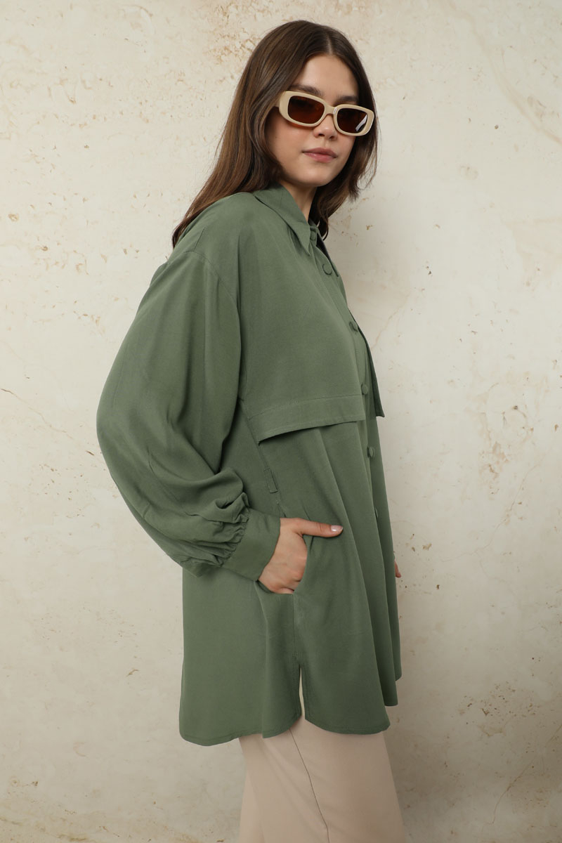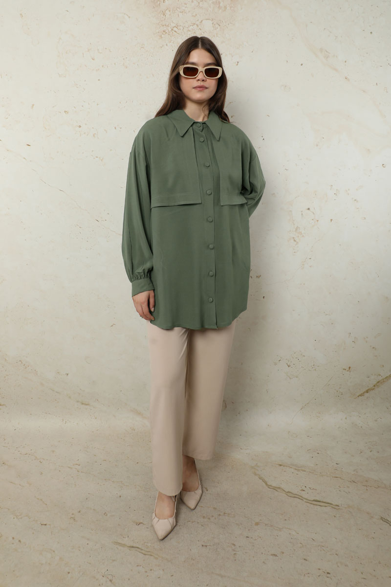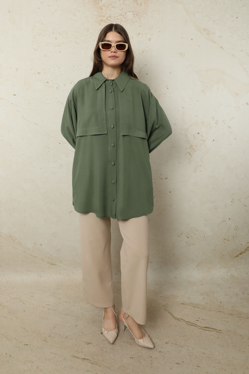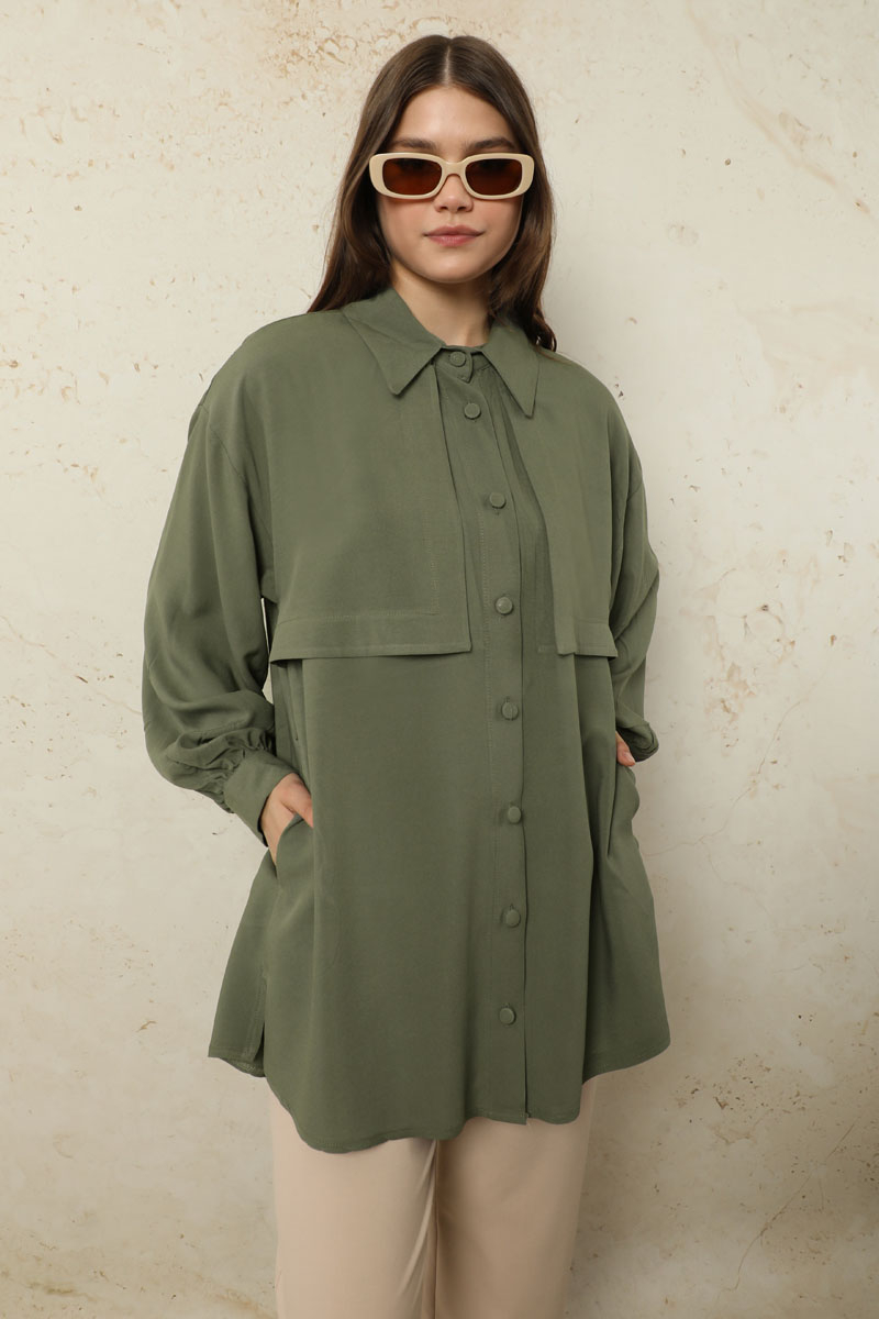 Bağlamalı Tunik Gömlek Haki. Önü düğmelidir. Gömlek yakalıdır. Manşeti büzgülüdür. Düşük omuzludur. İnce kuşaklıdır. Yandan ceplidir. Yanda küçük yırtmaç detayı mevcuttur. Arkası robalıdır ve pilelidir. İç göstermez.