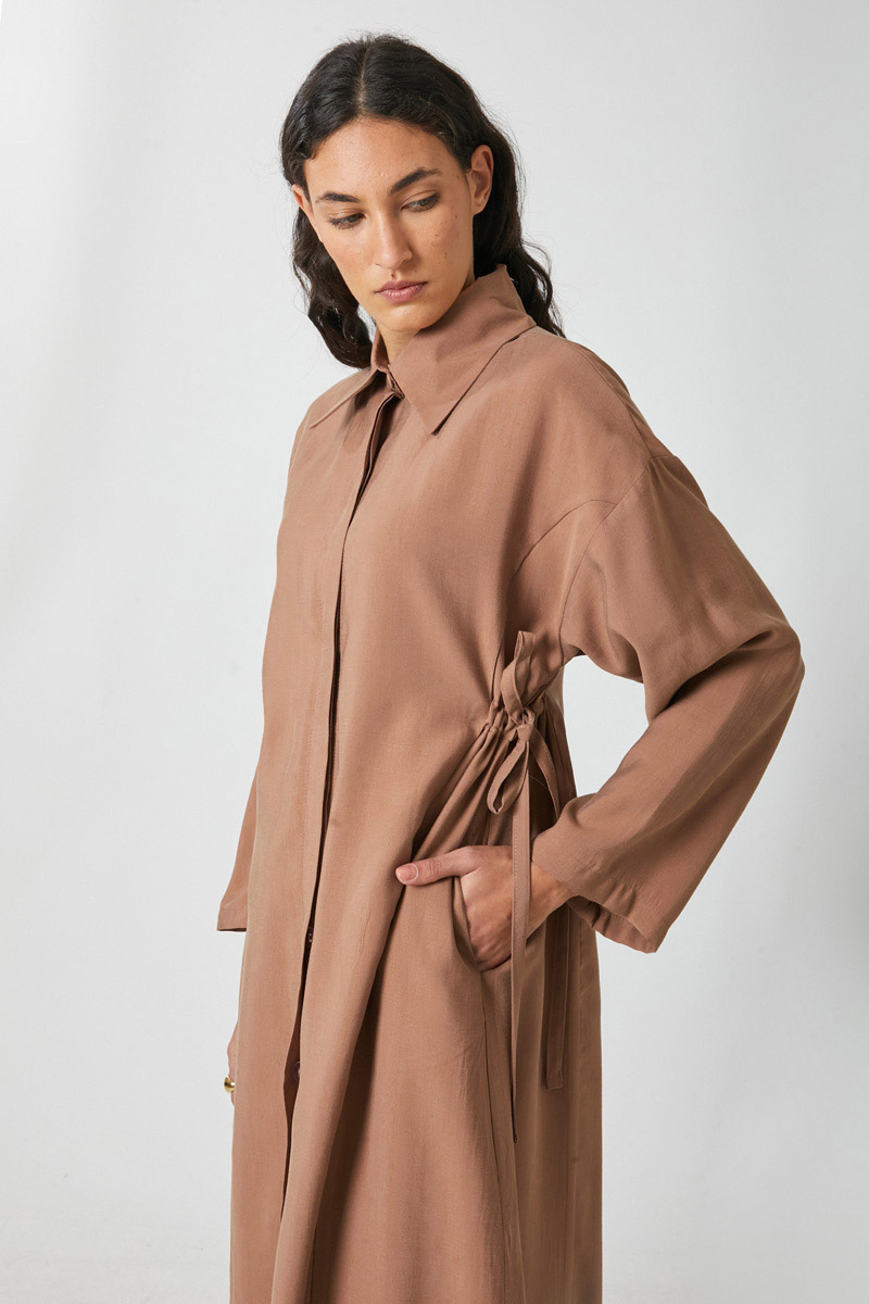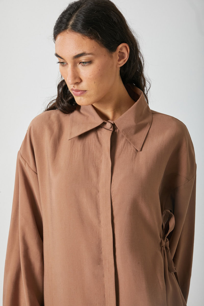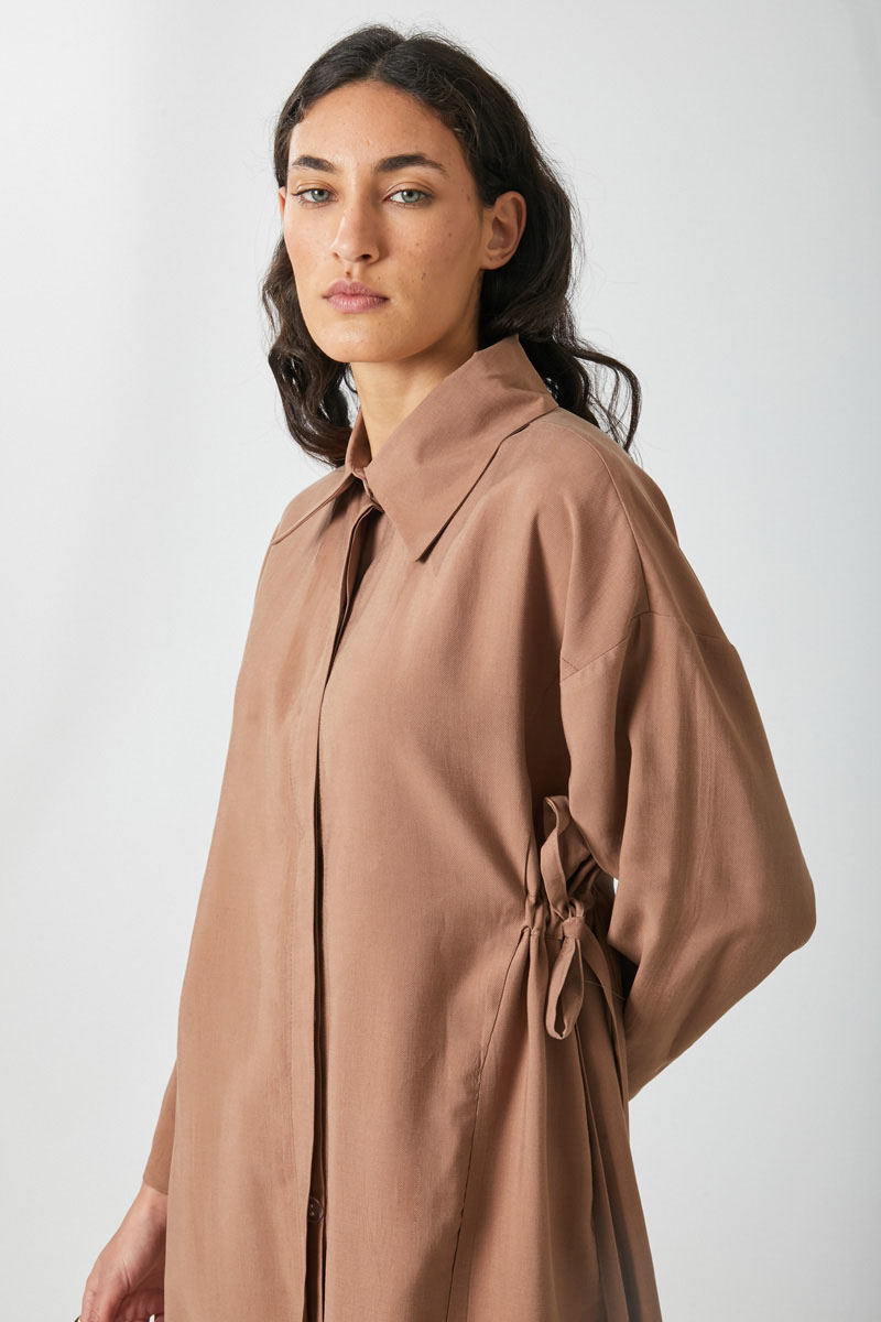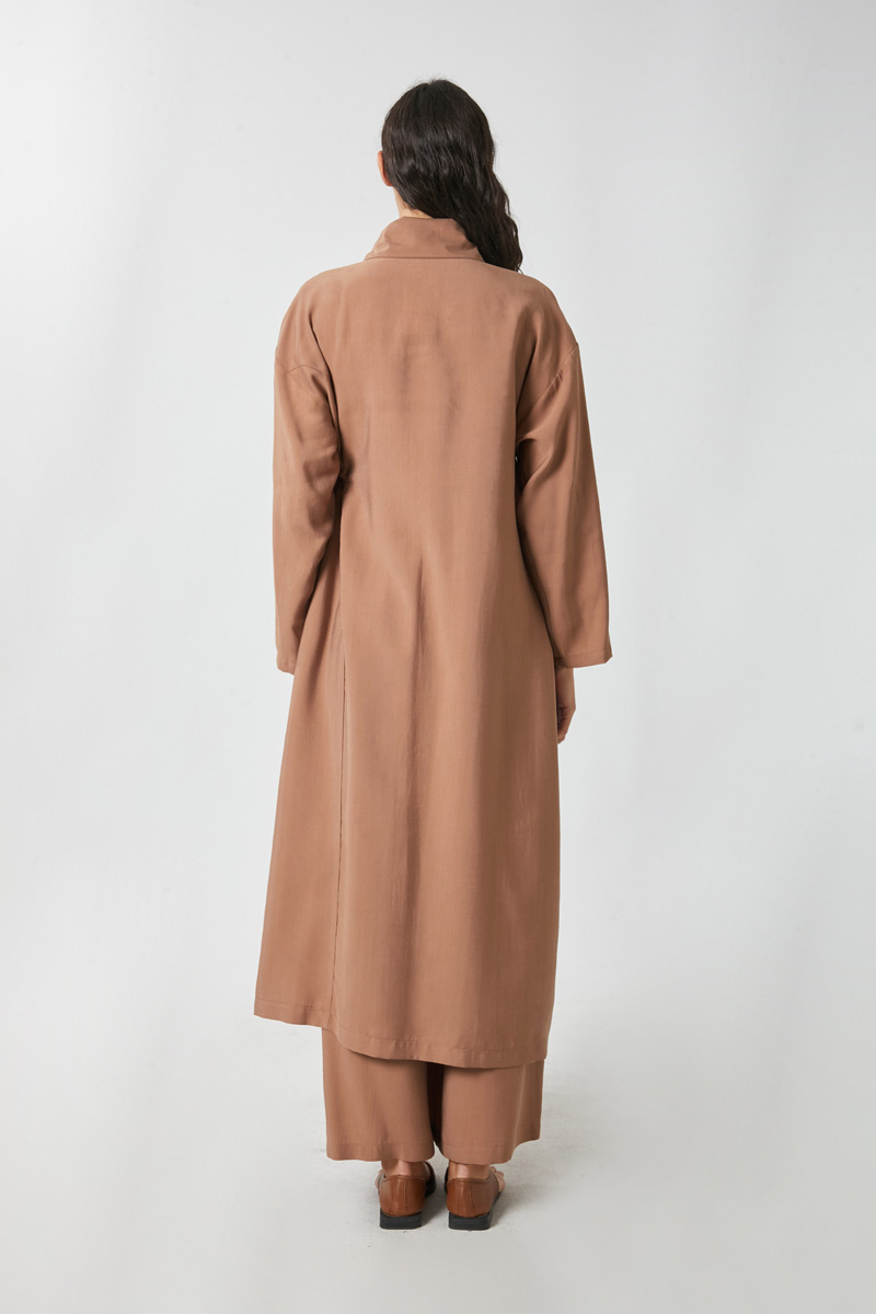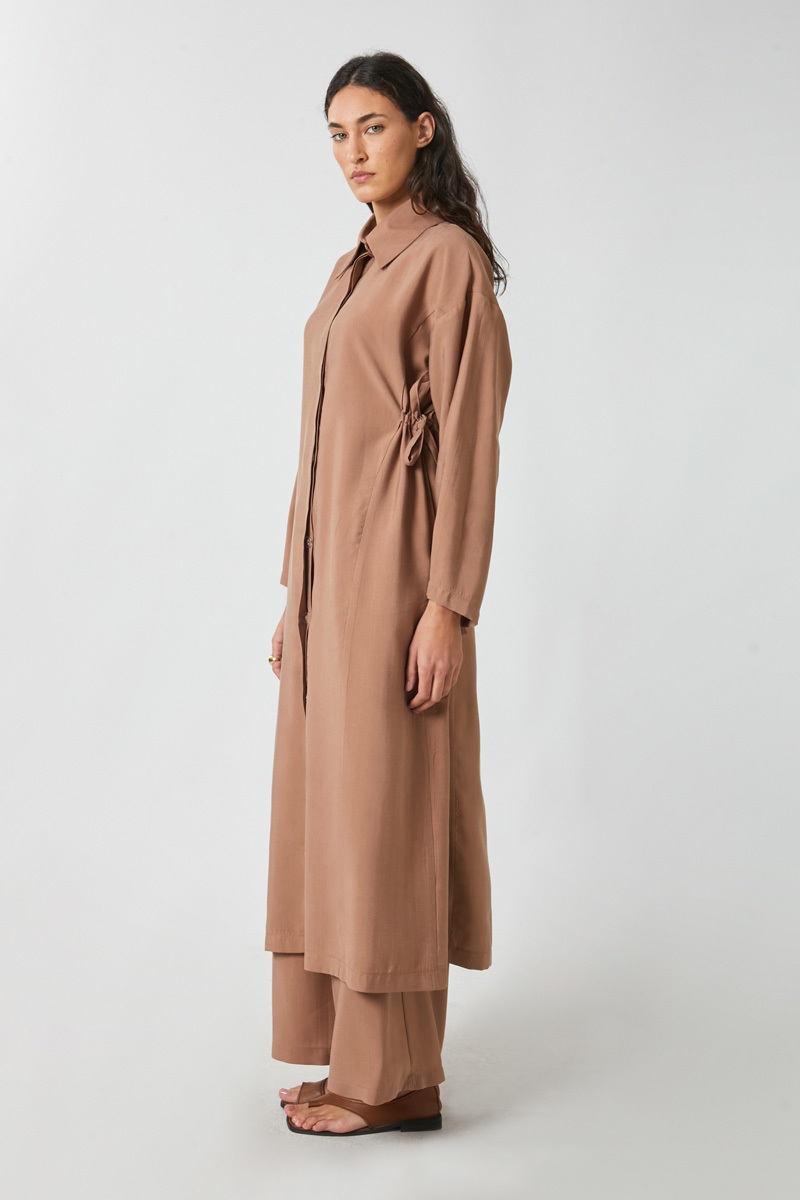 Bağlamalı Uzun Tunik Takım Açık Taba. Gömlek yakadır, önden gizli düğmelidir, düşük kolludur, sol beden yandan bağlamalıdır, parça dikiş detaylıdır, Pantolon: belden büzgülü olup arka belden lastiklidir, yandan gizli fermuarlıdır. Günlük kullanım ve özel günlerinizde tercih edebilirsiniz.