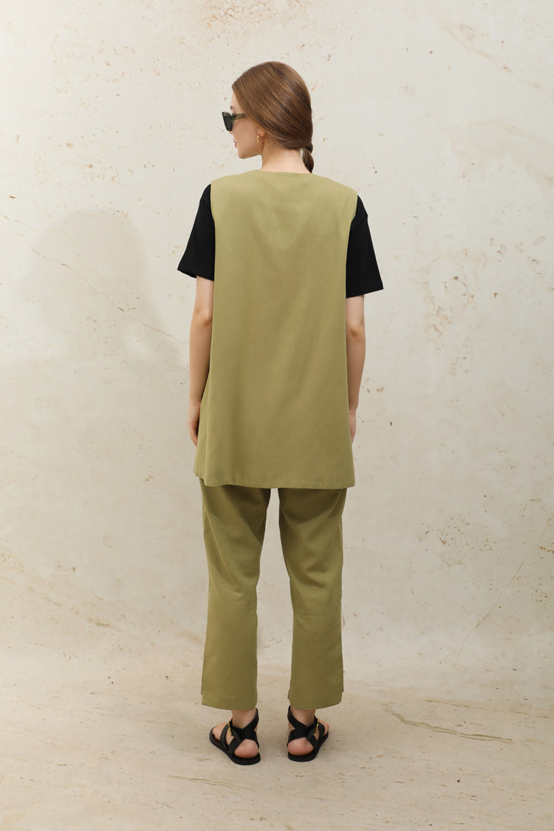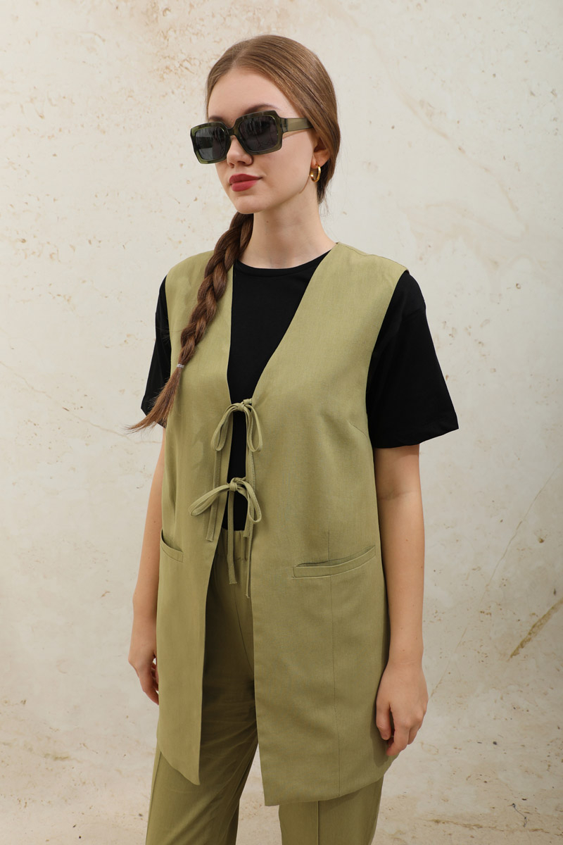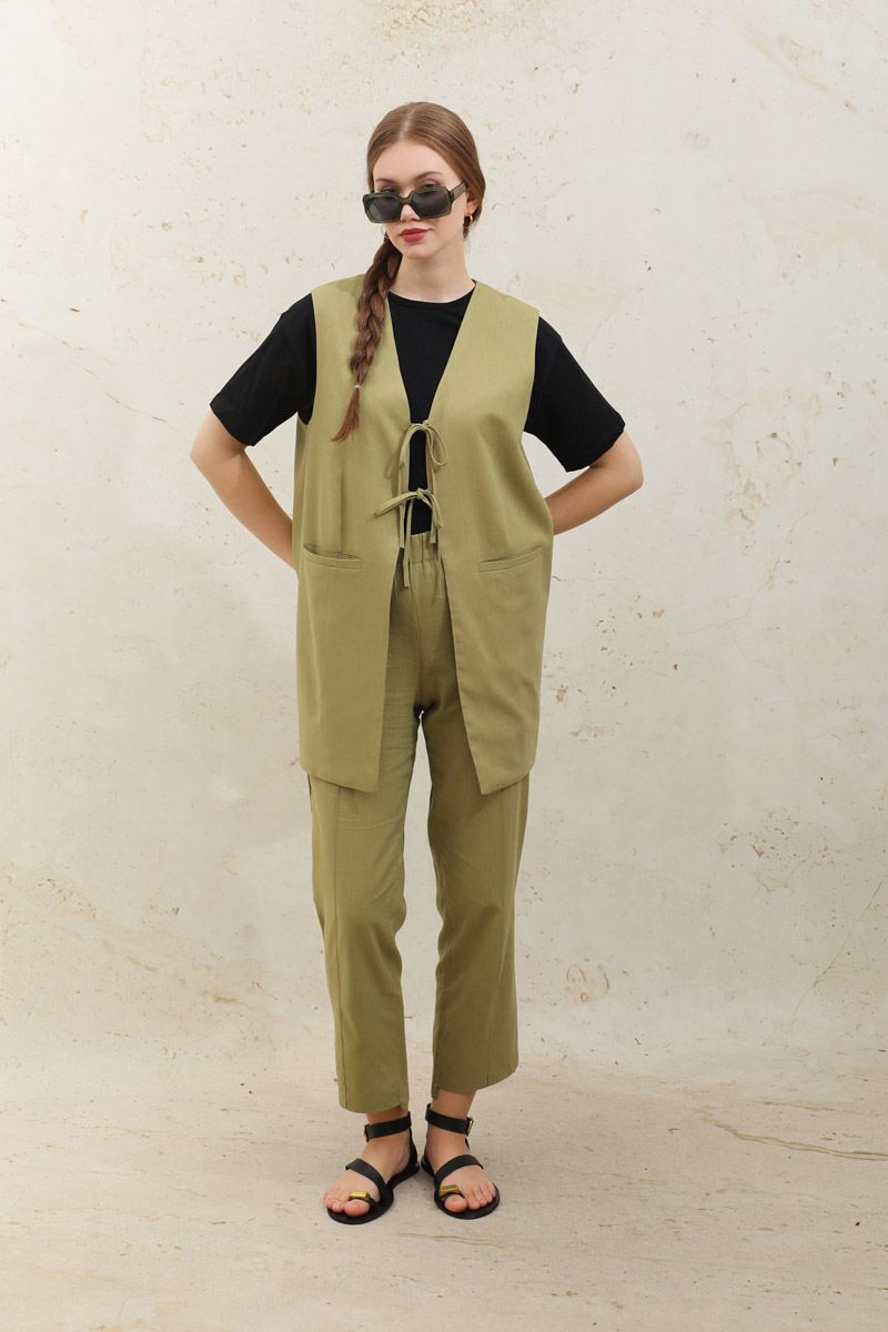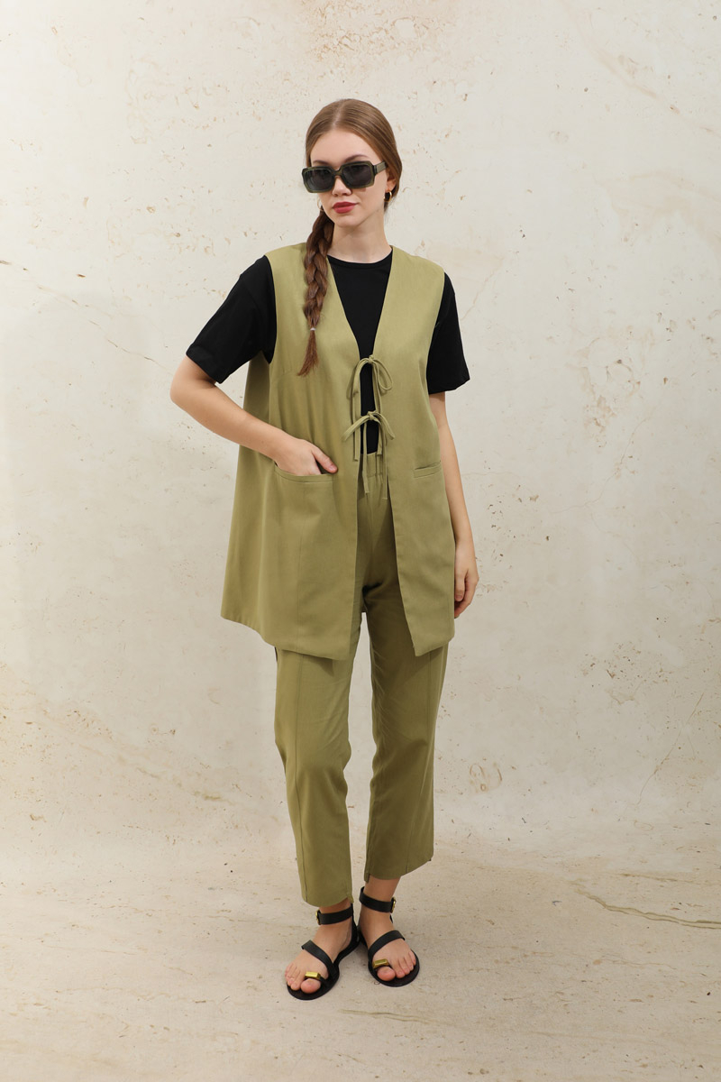 Bağlamalı Uzun Yelek Takım Yağ Yeşili. Yelek önden bağcık detaylıdır. Tek Fileto ceplidir. Pens detaylıdır. Astarsızdır. Pantolonun beli lastiklidir, cepsizdir, arka bilek kısmı ön bilekten uzundur. Astarlıdır. Önden dikiş detaylıdır. Günlük kullanım ve özel günlerinizde tercih edebilirsiniz.