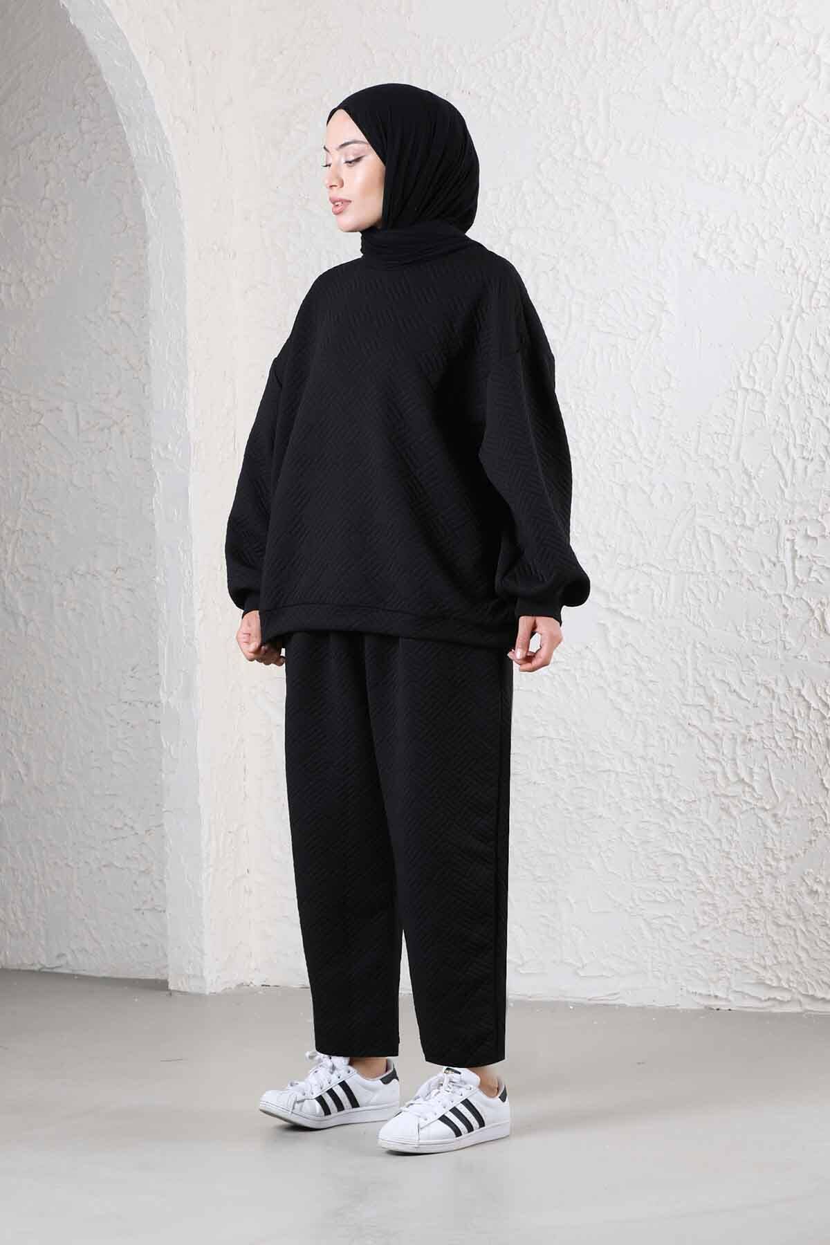 Baklava Patterned Sweat Suit Black. Quilted diamond pattern. It has a soft texture and wool inside. Bicycle collar. The sweatpants have pockets and an elastic waistband. comfortable fit