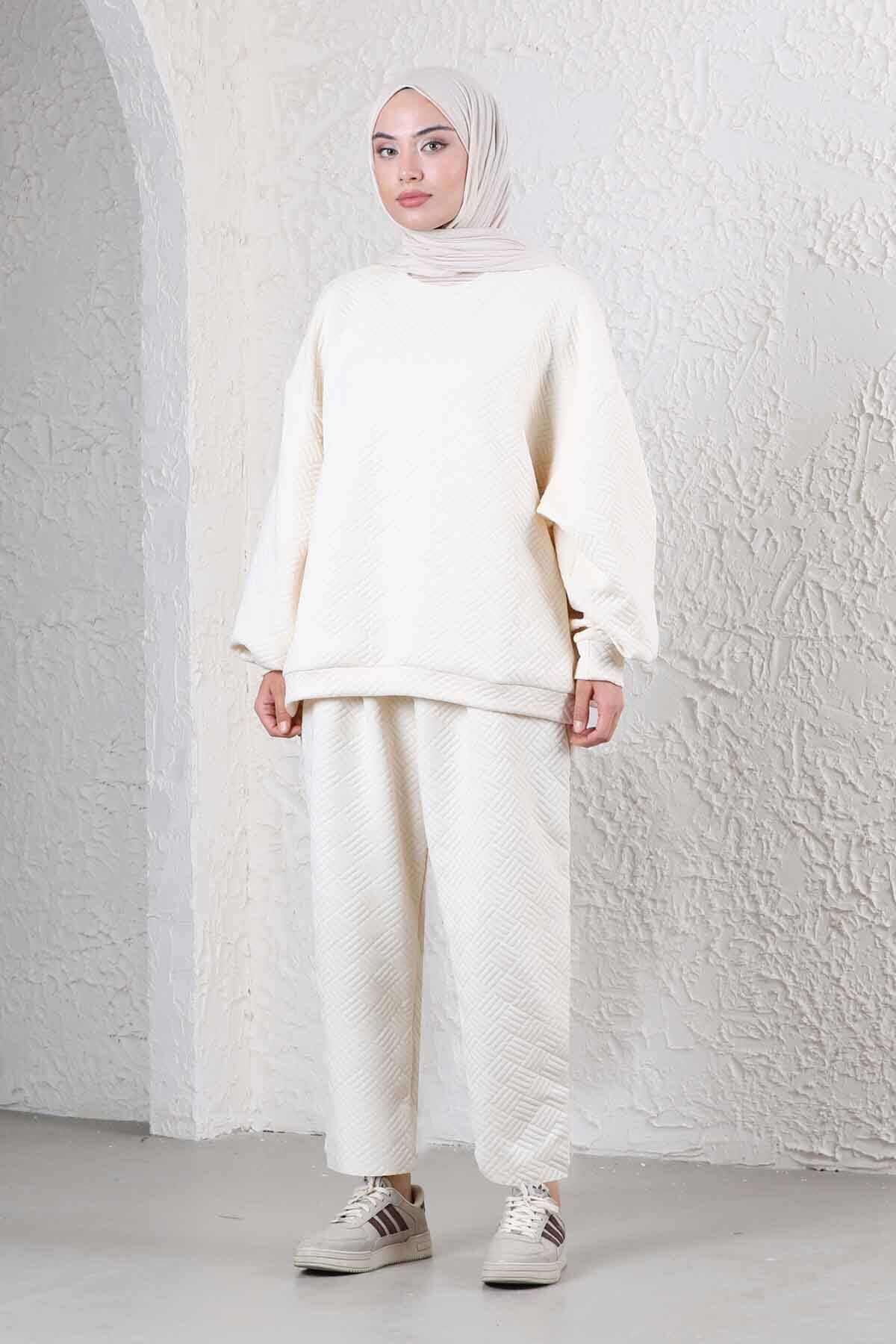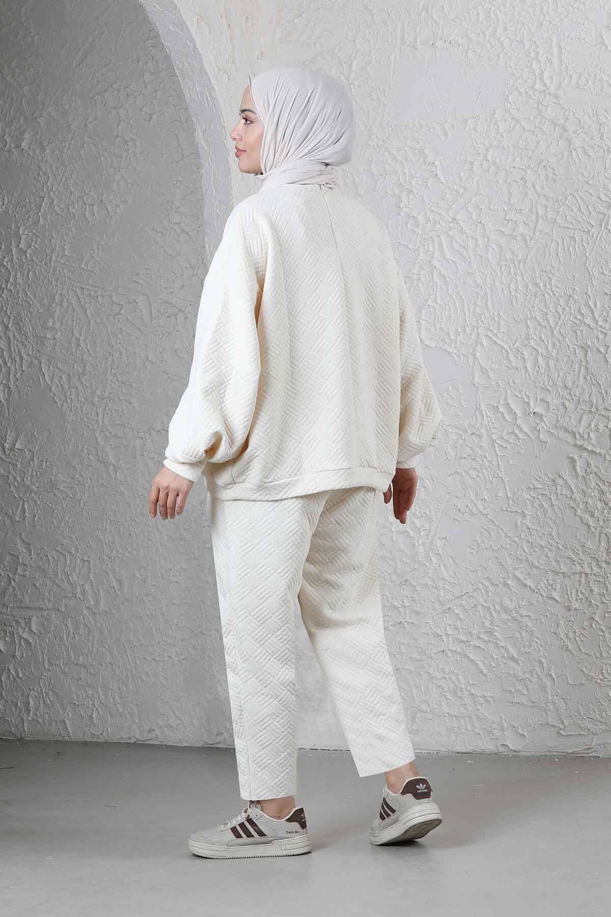 Baklava Patterned Sweat Suit Ecru. Quilted diamond pattern. It has a soft texture and wool inside. Bicycle collar. The sweatpants have pockets and an elastic waistband. comfortable fit