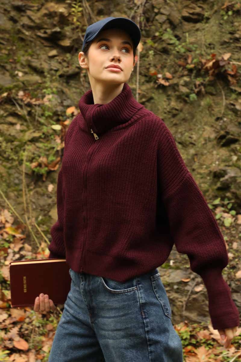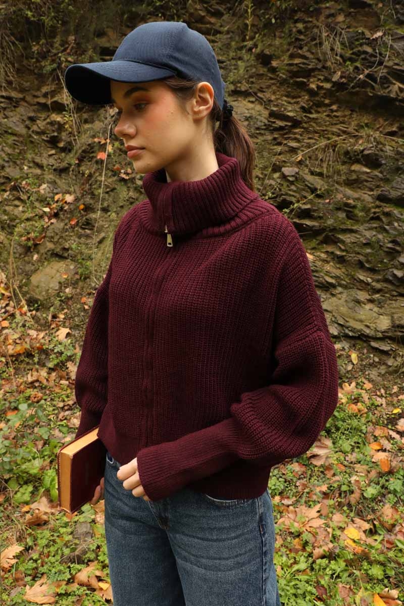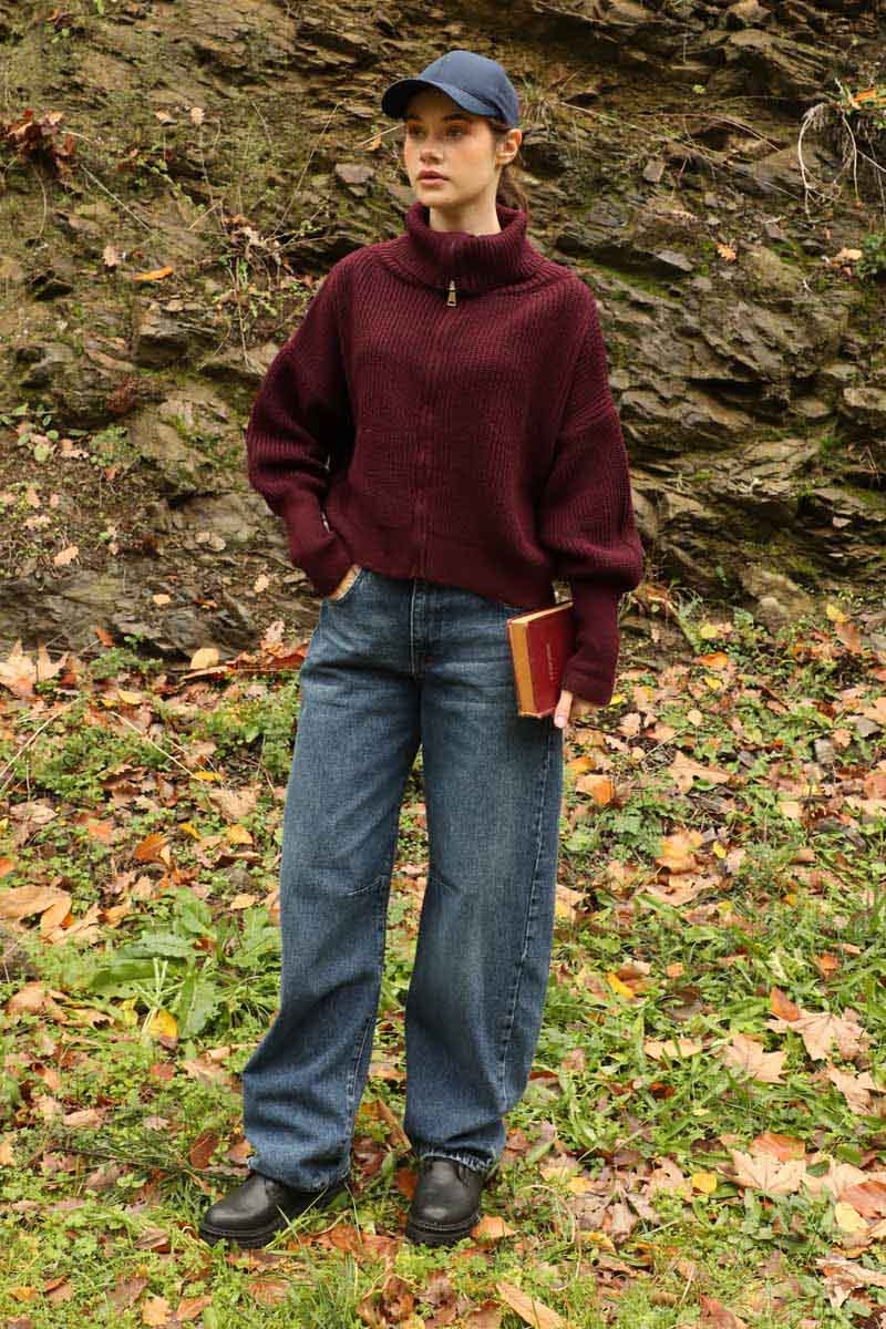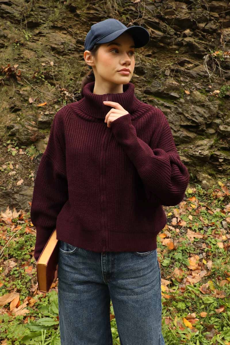 Balıkçı Yaka Fermuarlı Kazak Bordo