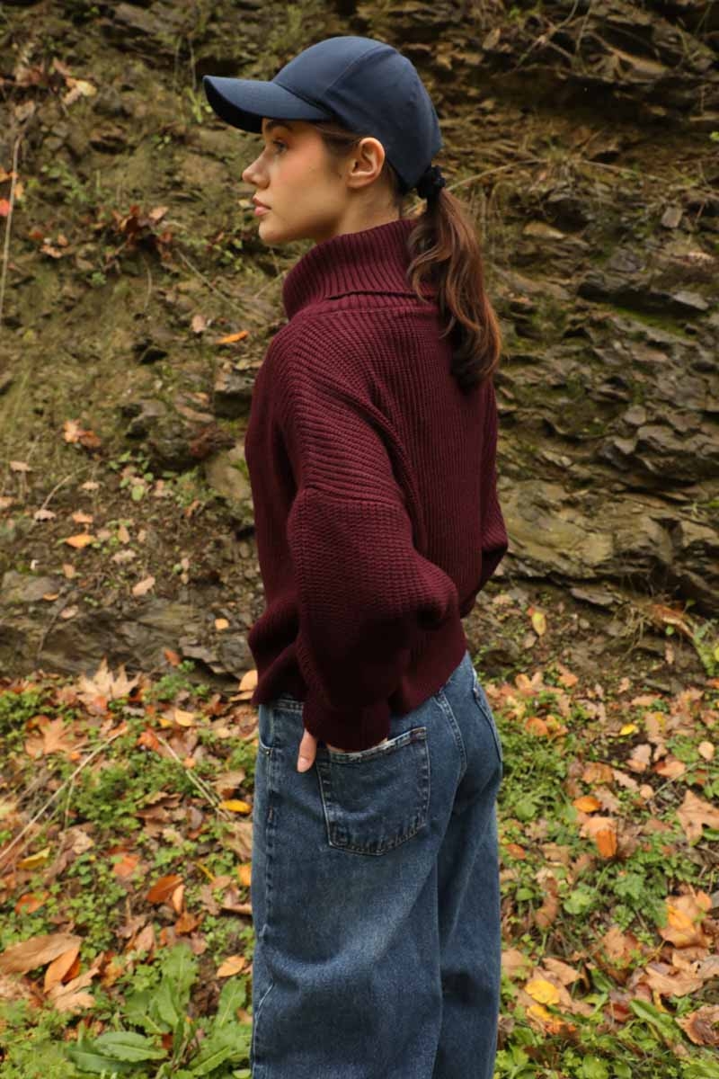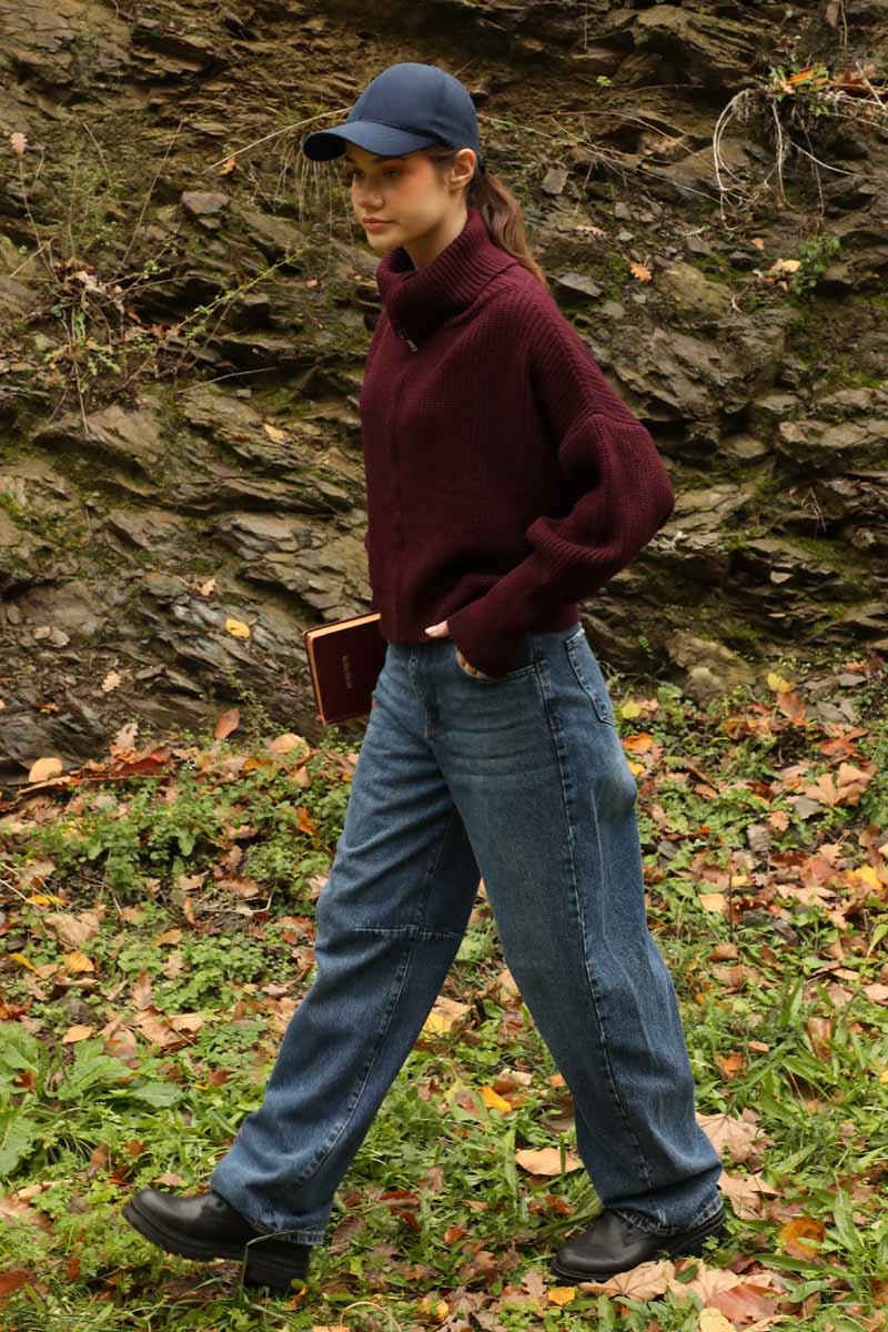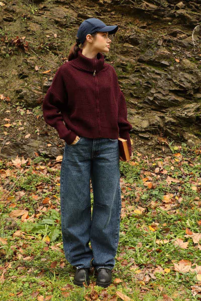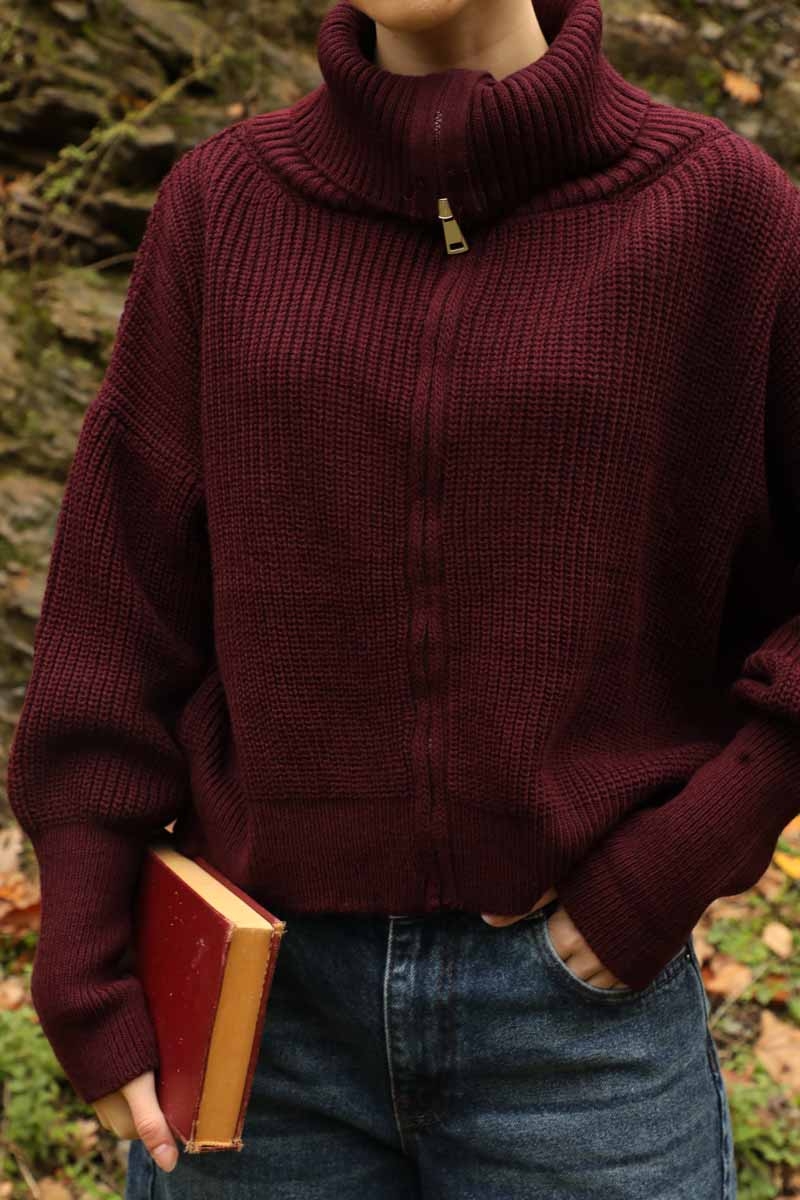 Balıkçı Yaka Fermuarlı Kazak Bordo, önden fermuarlı, düşük omuz, manşetleri geniş ve ribanalıdır. Etek, elbise ve pantolon üzerine tercih edilebilir. Kalın örme triko kumaşıyla kış aylarında tercih edebilirsiniz.