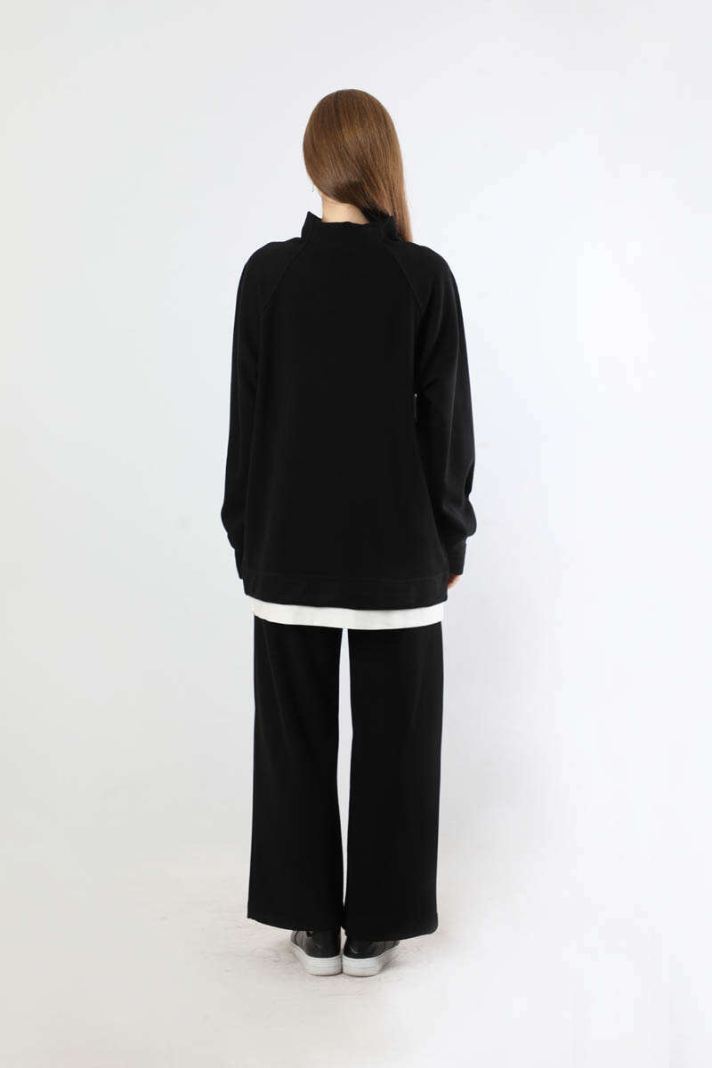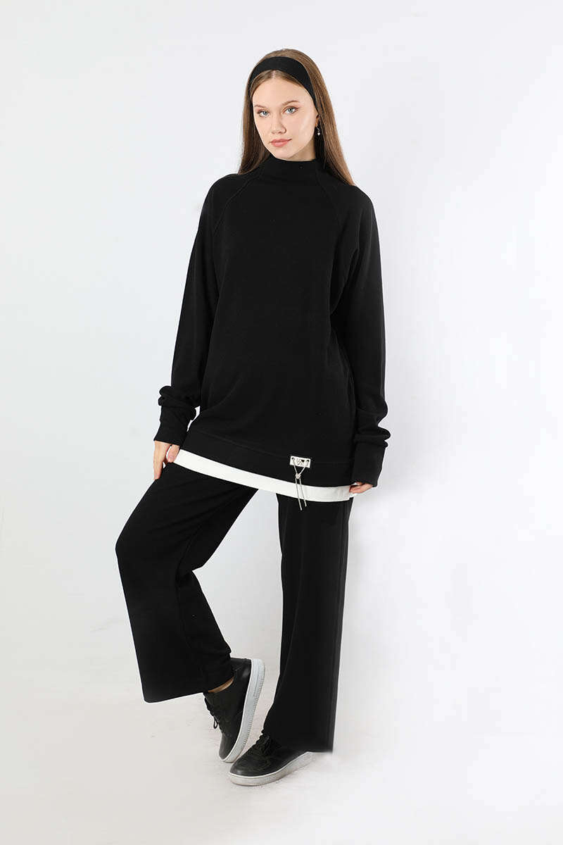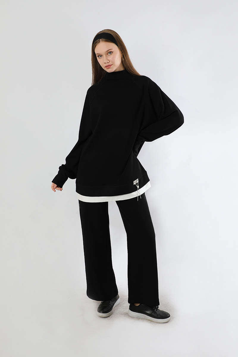 Balıkçı Yaka Triko Takım Siyah. Reglan kolludur. Balıkçı yakalıdır. Modelin eteğinde etiket detayı mevcuttur. Pantolon beli lastiklidir. Bol paçadır. Günlük kullanım ve özel günlerinizde tercih edebilirsiniz.