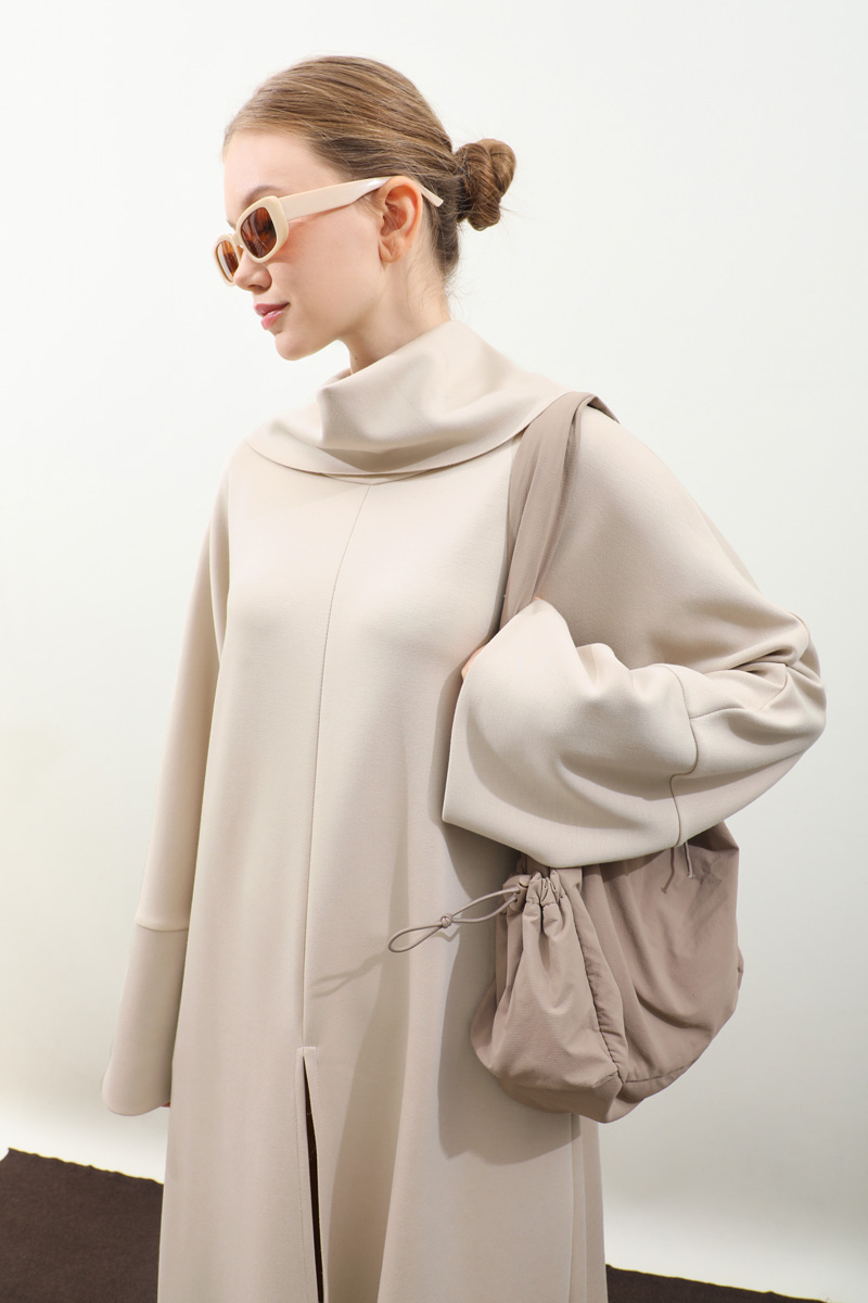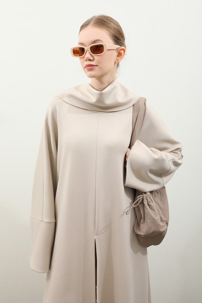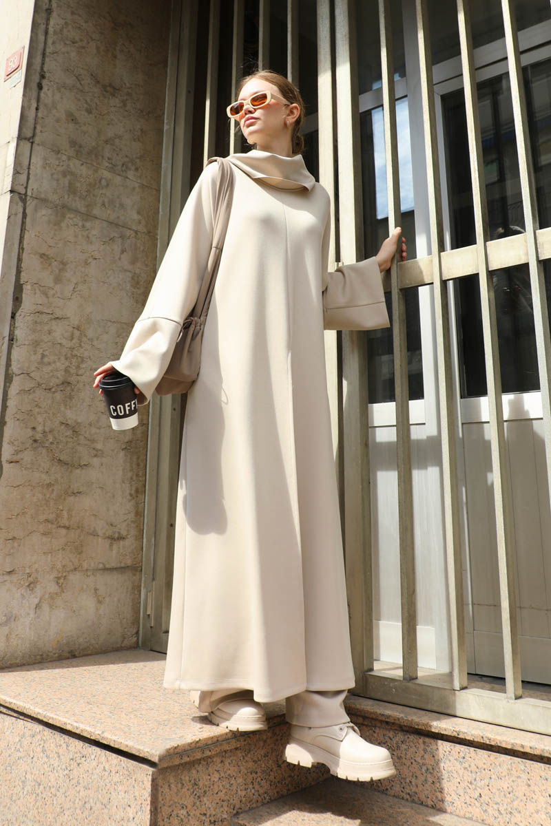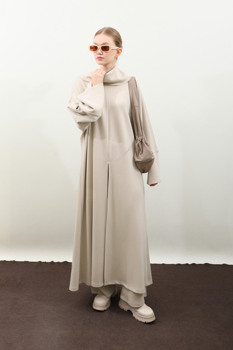 Balıkçı Yaka Tunik Takım Taş. Dökümlü balıkçı yaka, geniş kol ve kalın maşetli, önden yırtmaç detaylıdır. Üst tunik cepsizdir, pantolon beli lastikli, yandan ceplidir. Salaş kalıbı ve yumuşak dokulu kumaşı ile rahatlığına önem verenler için tasarlanmıştır.