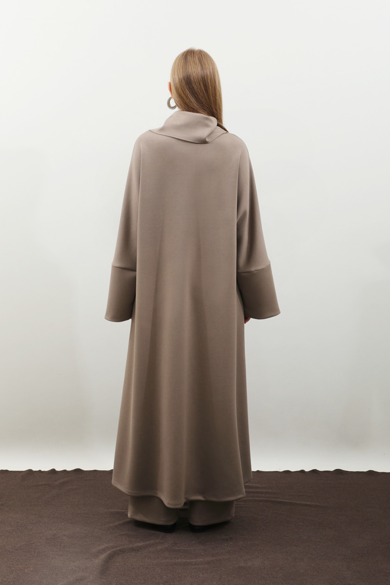 Balıkçı Yaka Tunik Takım Toprak. Dökümlü balıkçı yaka, geniş kol ve kalın maşetli, önden yırtmaç detaylıdır. Üst tunik cepsizdir, pantolon beli lastikli, yandan ceplidir. Salaş kalıbı ve yumuşak dokulu kumaşı ile rahatlığına önem verenler için tasarlanmıştır.