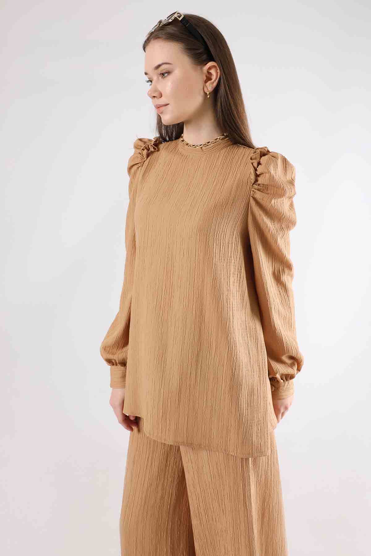 Balloon Sleeve Pants Suit Camel. Tunic is frill detailed. The waist of the trousers is elastic. It's a normal pattern. Two Pants are sold as a set. Trend colors of the season are used. You can choose it on your special days.