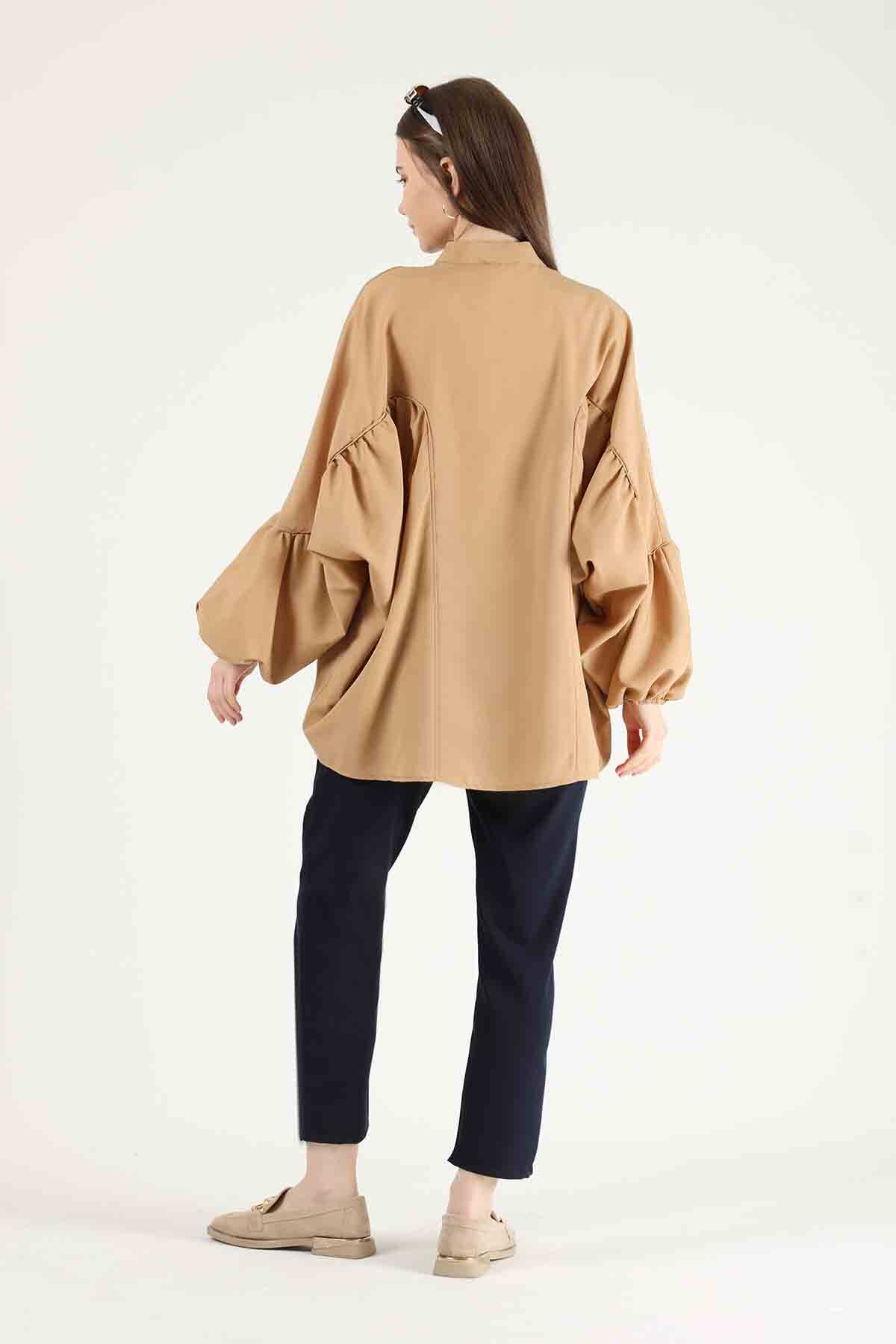 Balloon Sleeve Shirt Camel. It is upright. It is frontal. It is shirred. It should be buttoned. You can choose it for your daily use and special days.