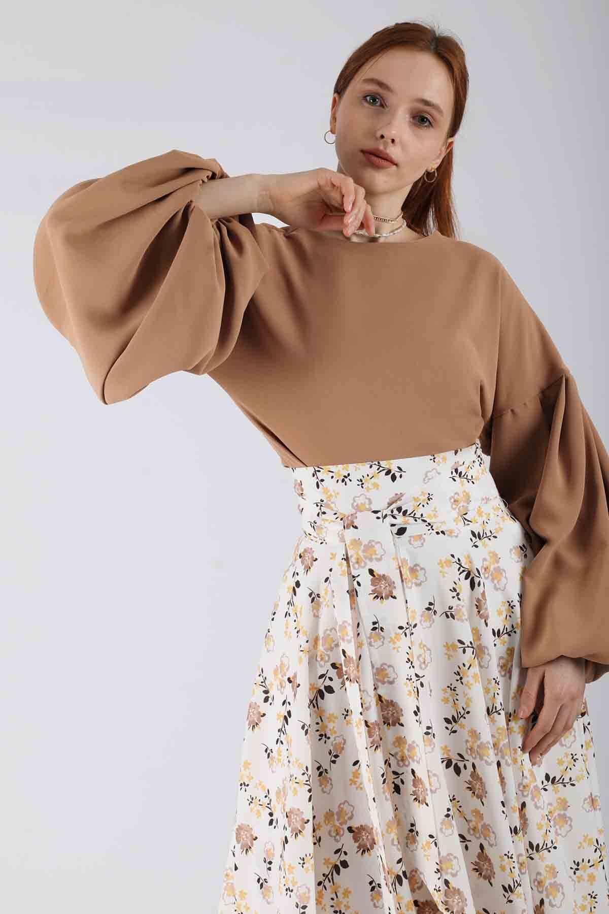 Balloon Sleeve Skirt Set Camel. It is a double suit as tunic and skirt. It is lined. It doesn't show inside. It is one of the favorite products of the new season.