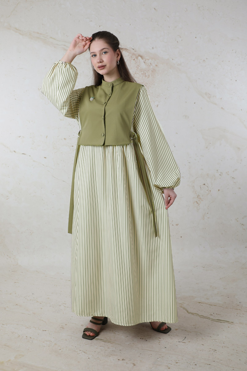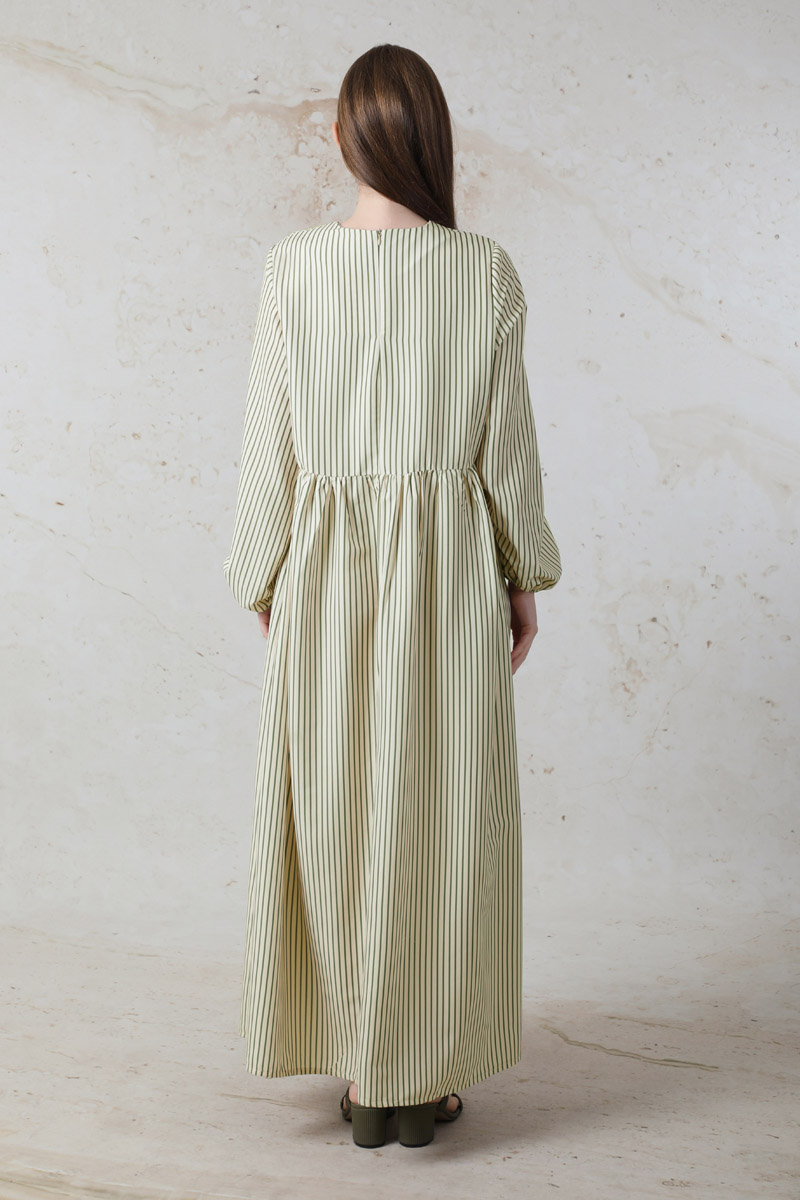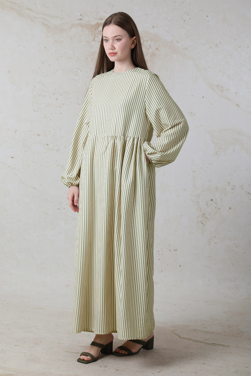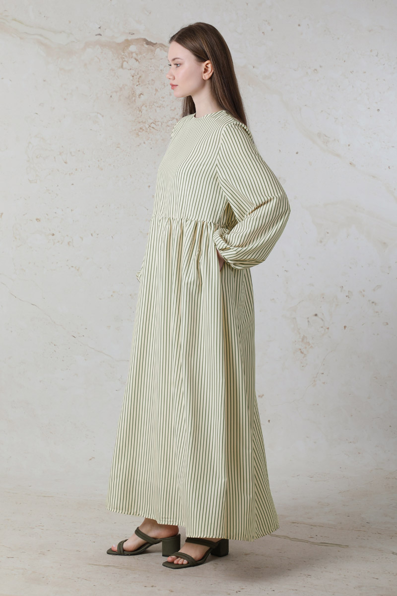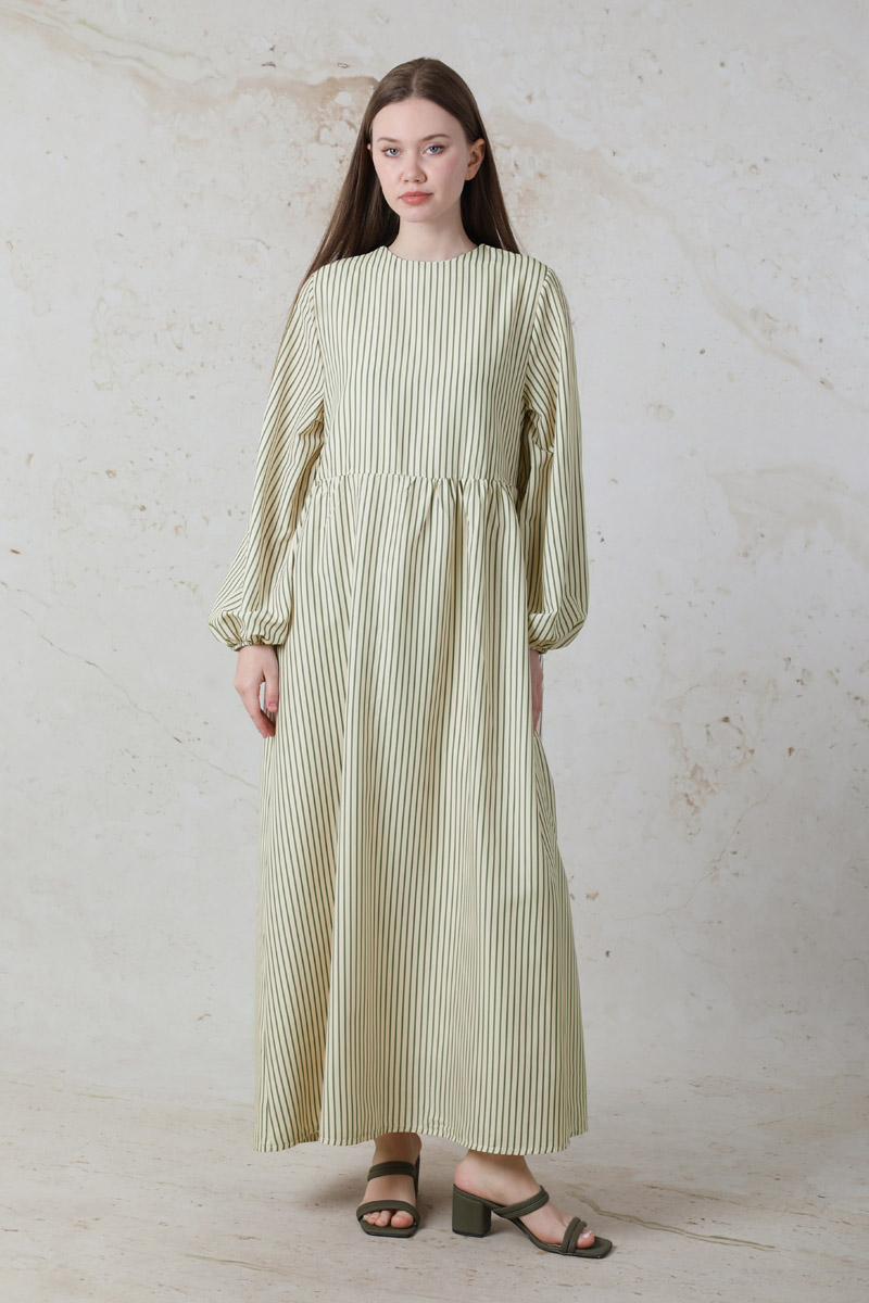 Balon Kol Çizgili Elbise Haki