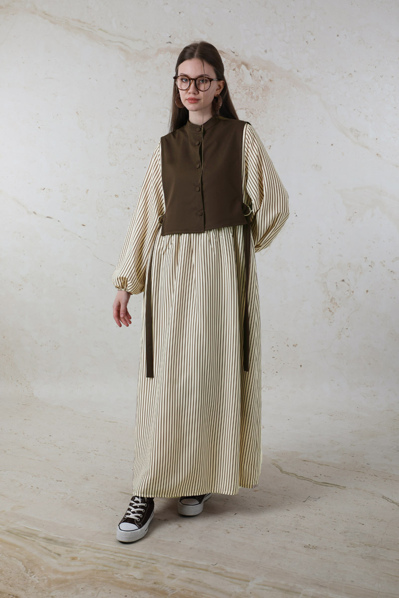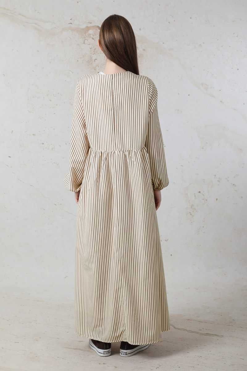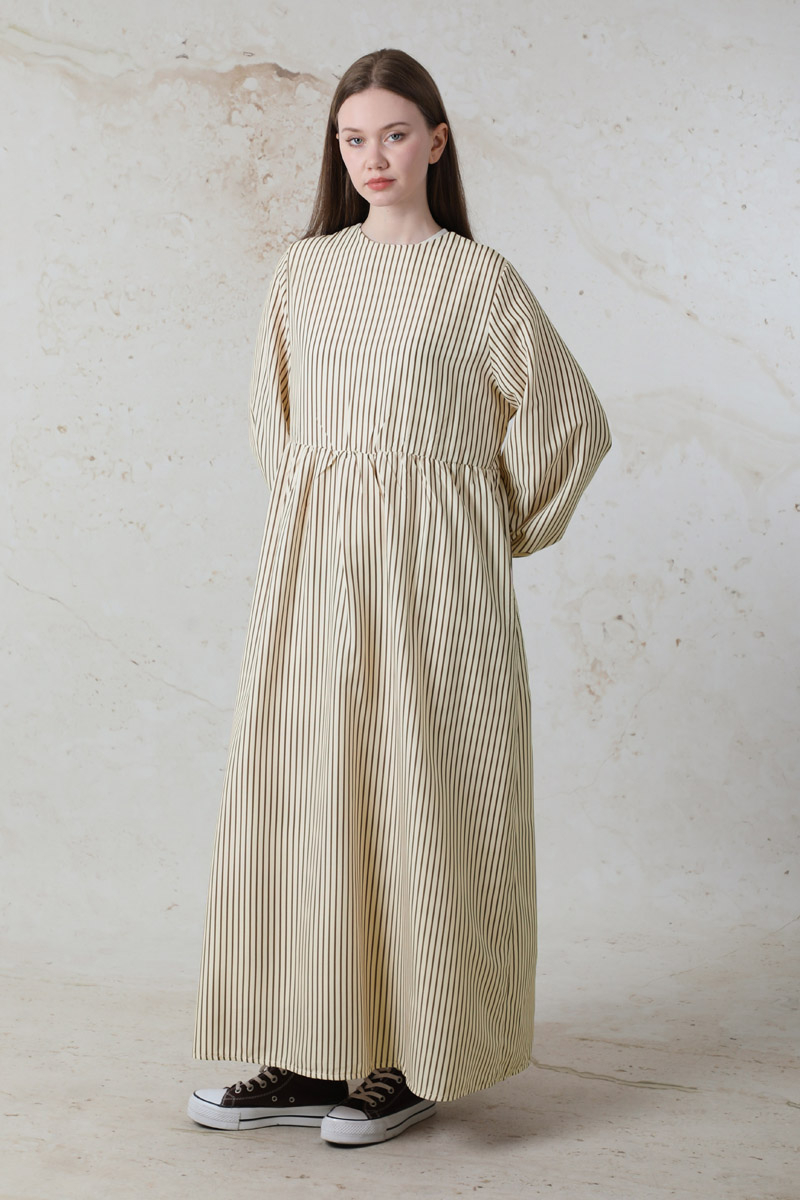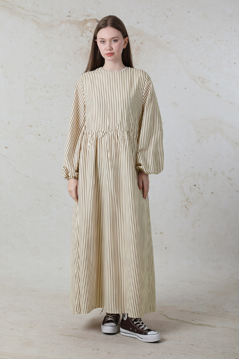Balon Kol Çizgili Elbise Kahve