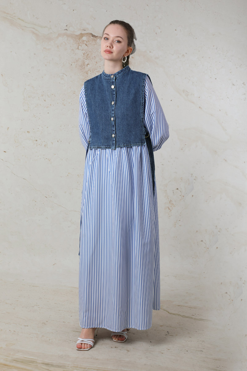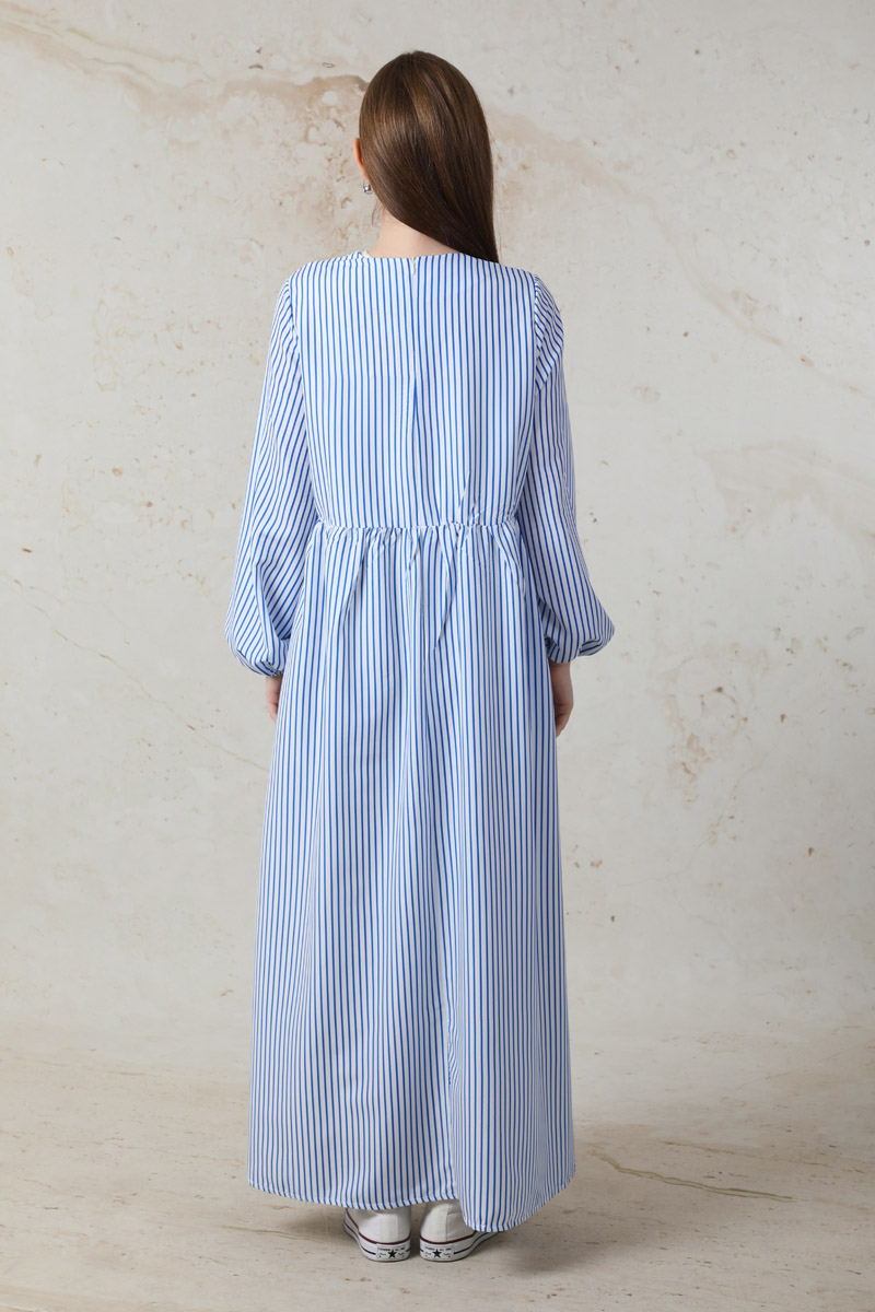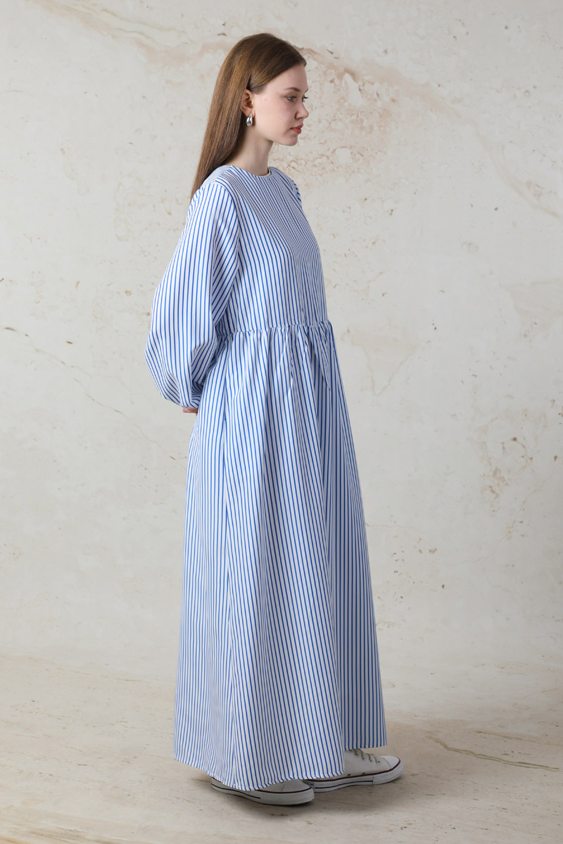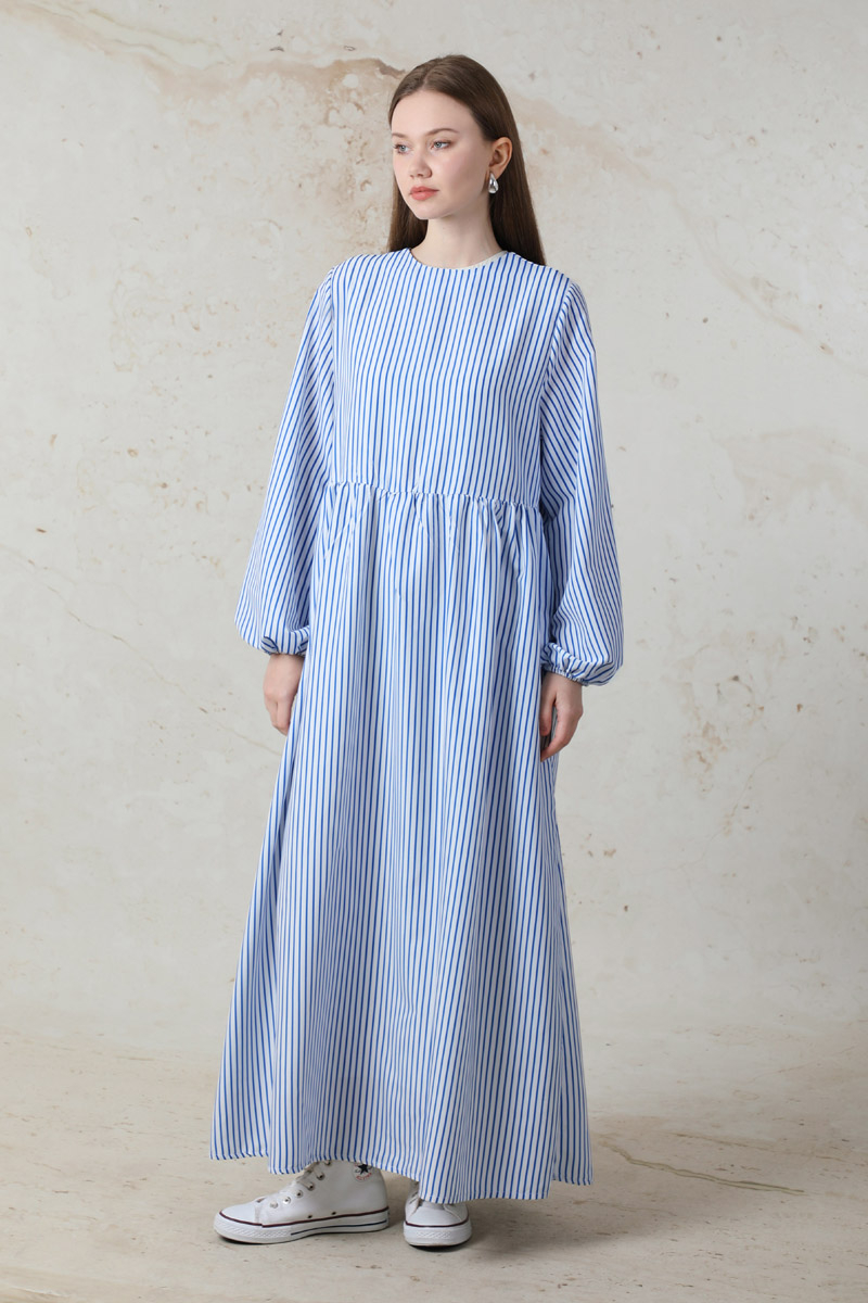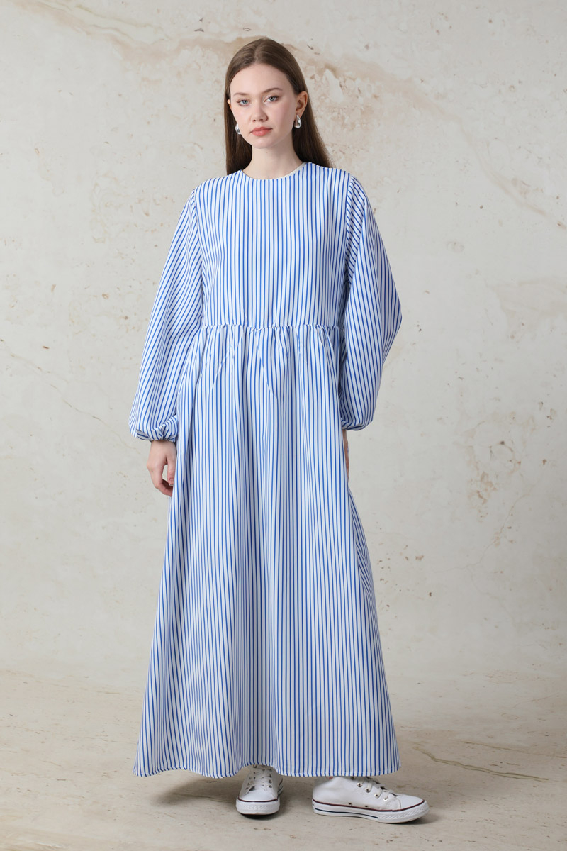 Balon Kol Çizgili Elbise Mavi. balon kolludur. Belden kesikli büzgü detaylıdır. Manşeti lastiklidir. Yandan ceplidir. Arkadan fermuarlıdır. Günlük kullanım ve özel günlerinizde tercih edebilirsiniz.