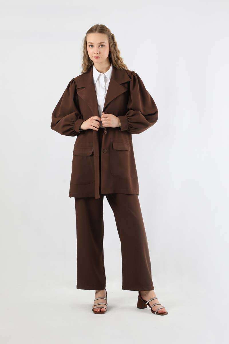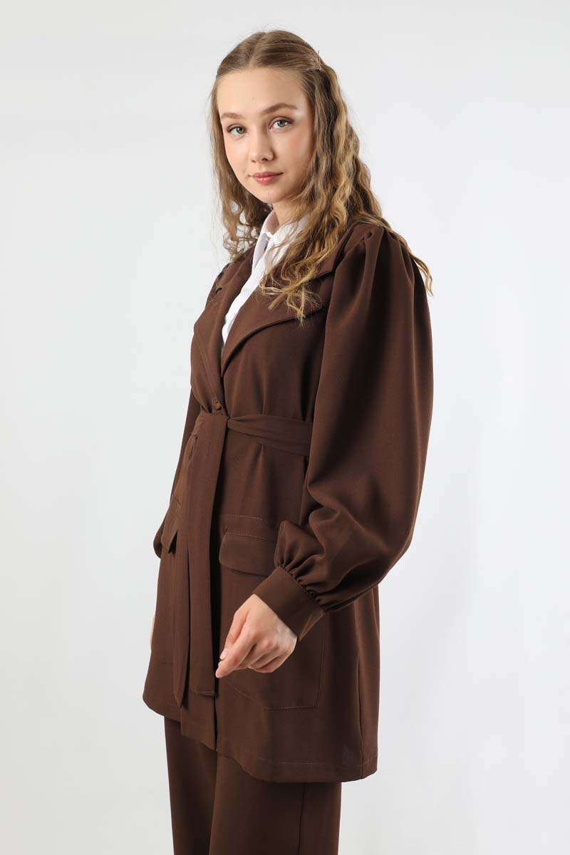 İngiliz yaka. Balon kol. Belden kuşaklı. Önden 3 düğmeli. Cepli. Astarsızdır. Pantolon beli lastiklidir. Pantolon bol paçadır.