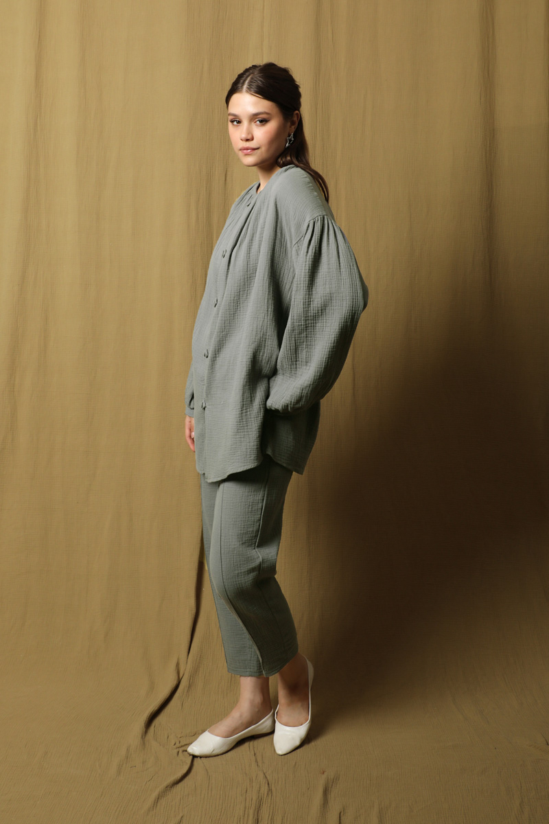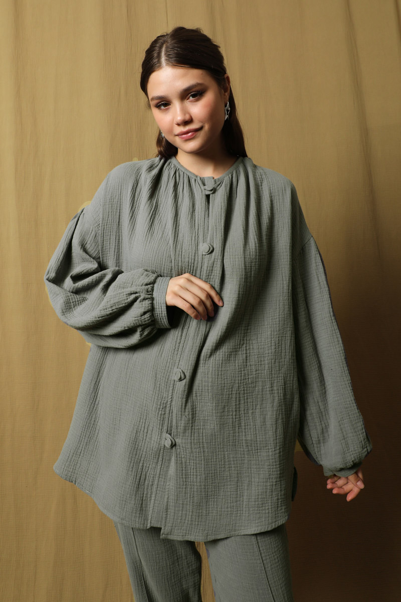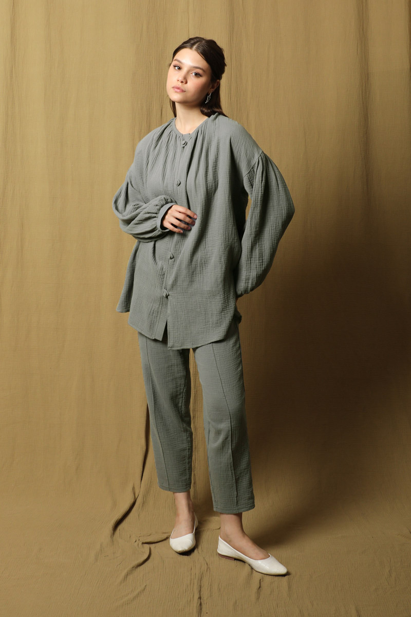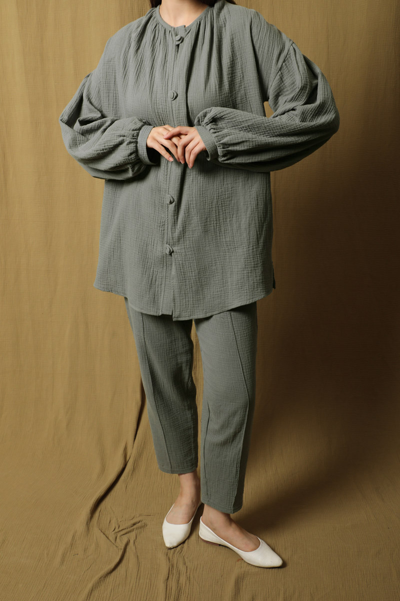 Balon Kol Müslin Takım Antrasit. Bisiklet büzgülü yaka, önden birit düğmeli,tunik yanı kısa yırtmaçlıdır, tuniğin yandan gizli cepleri mevcut, pantolon beli lastikli , yandan cepli, önden dikişlidir. Astarsızdır müslin kumaş olduğu için iç gösterebilir ürün içine body ürünlerimizden tercih edebilirsiniz. Yazlık ve günlük kullanım için uygundur.