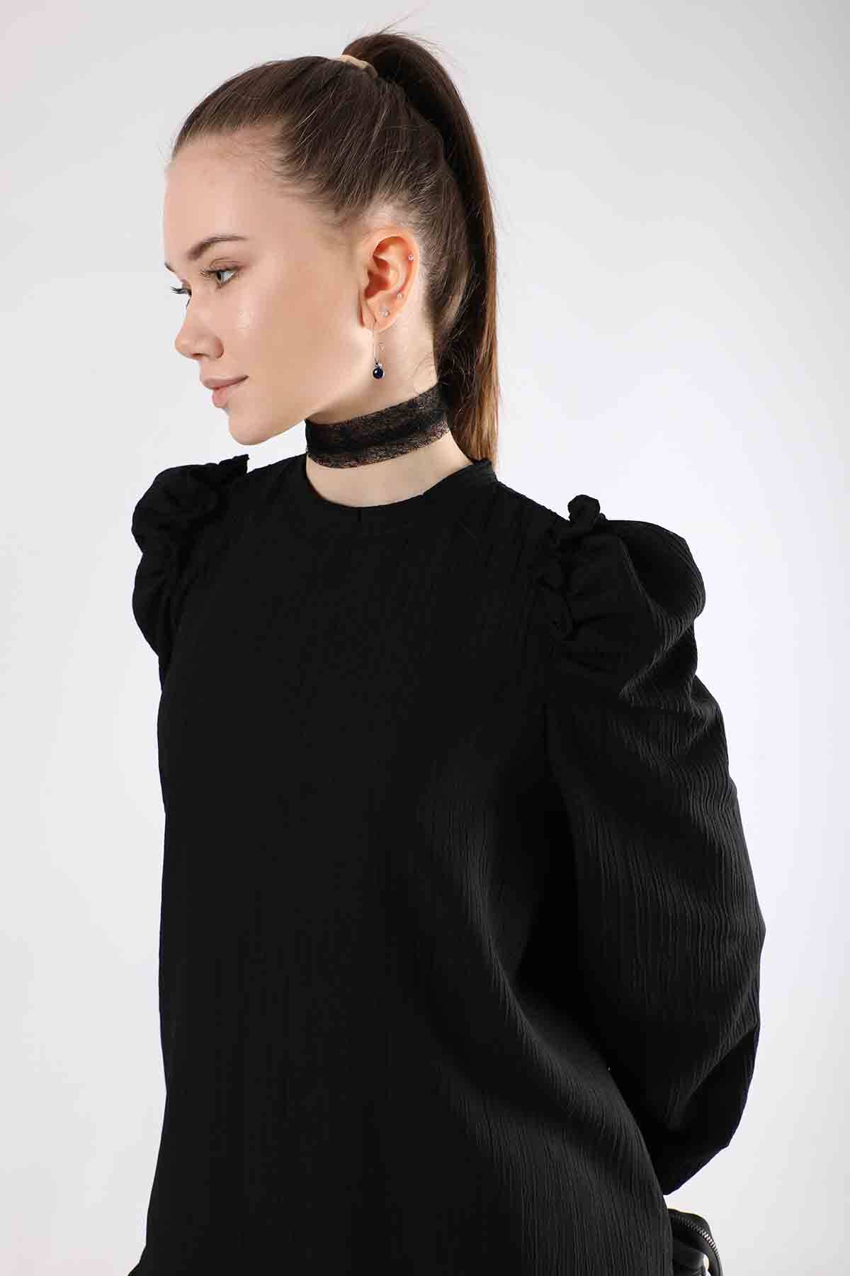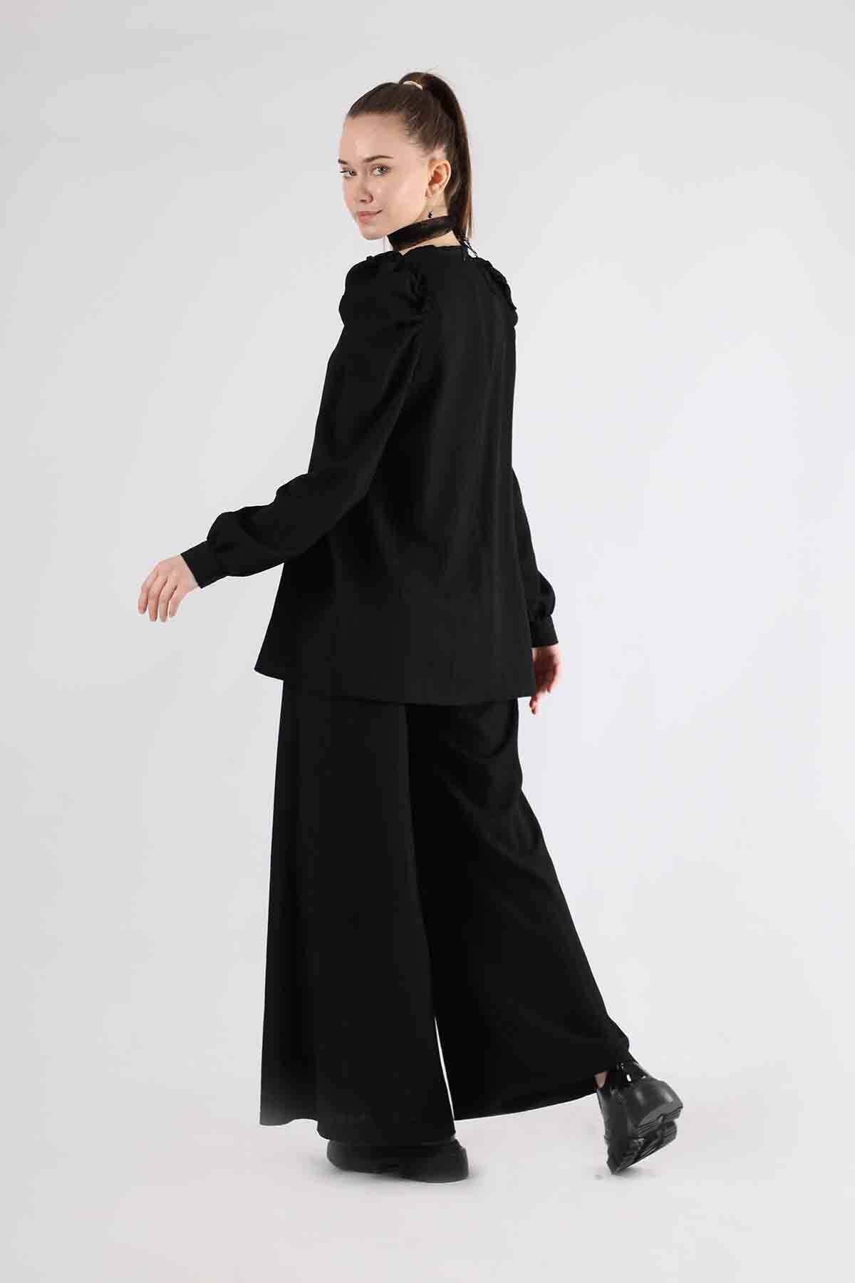 Balloon Sleeve Pants Suit Black. Tunic is frill detailed. The waist of the trousers is elastic. It's a normal pattern. Two Pants are sold as a set. Trend colors of the season are used. You can choose it on your special days.