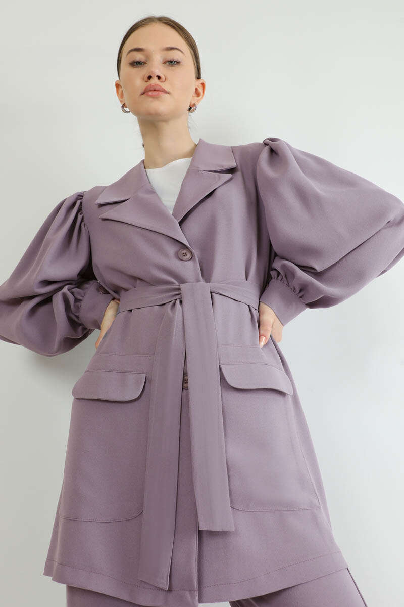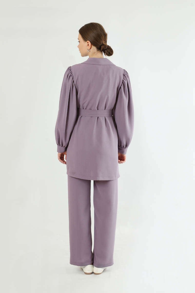 İngiliz yaka. Balon kol. Belden kuşaklı. Önden 3 düğmeli. Cepli. Astarsızdır. Pantolon beli lastiklidir. Pantolon bol paçadır.