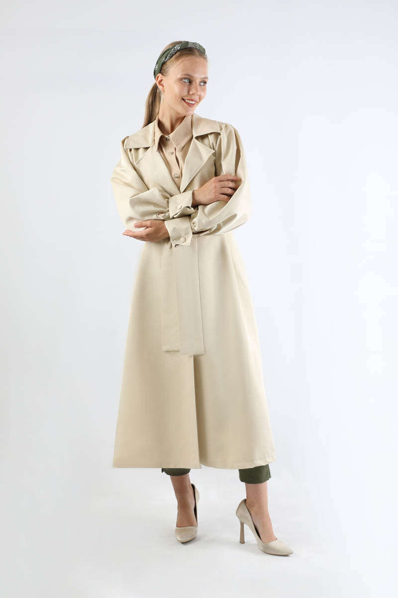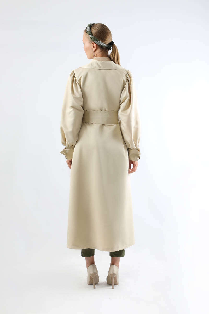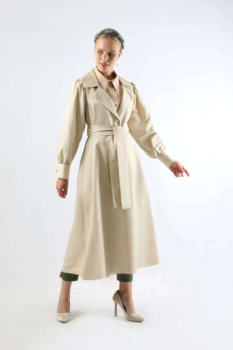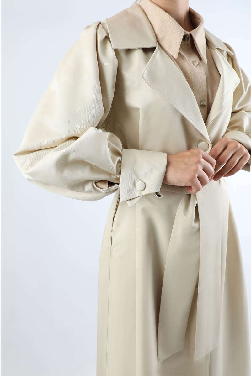 Balon Kol Trençkot Ekru. Çift manşetlidir. Omuz tepesi büzgülüdür. Yandan ceplidir. Kaplama düğme detaylıdır. Manşeti büzgü detaylıdır. Kuşaklıdır. Günlük kullanım ve özel günlerinizde tercih edebilirsiniz.
