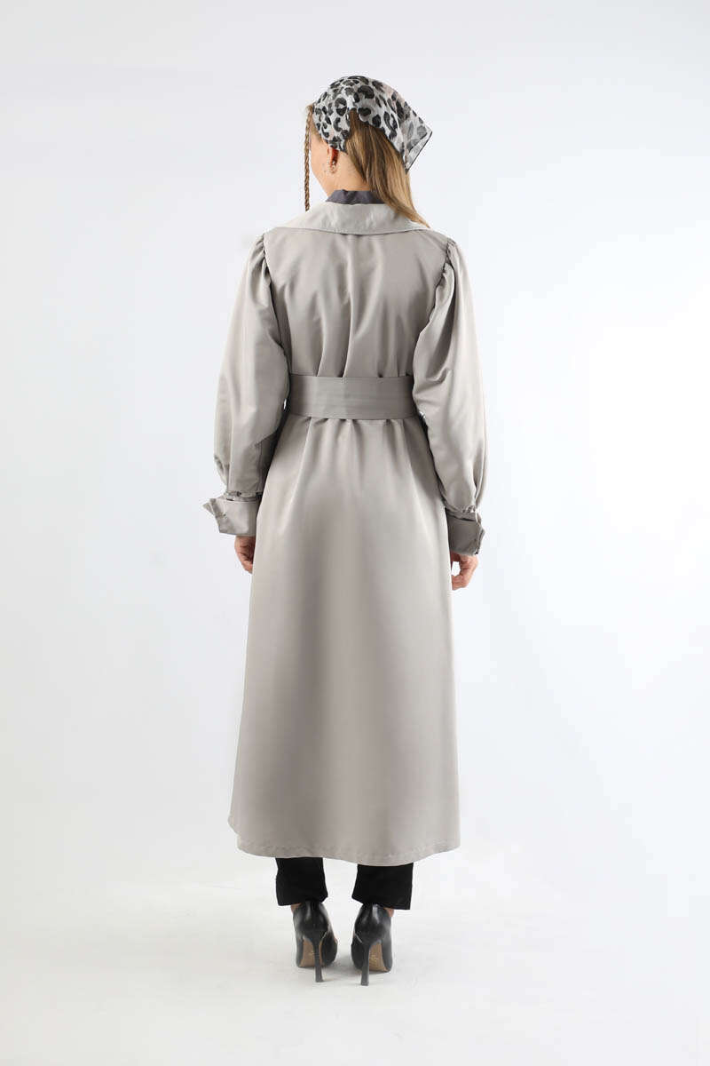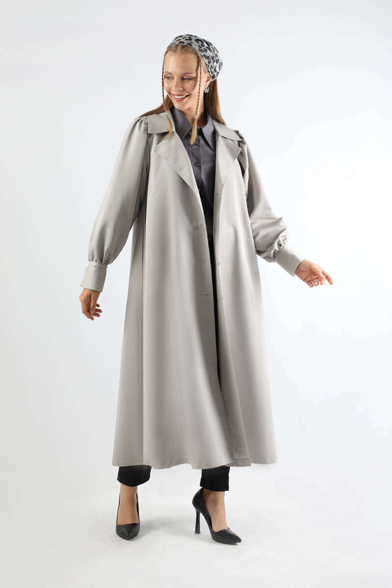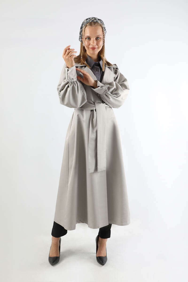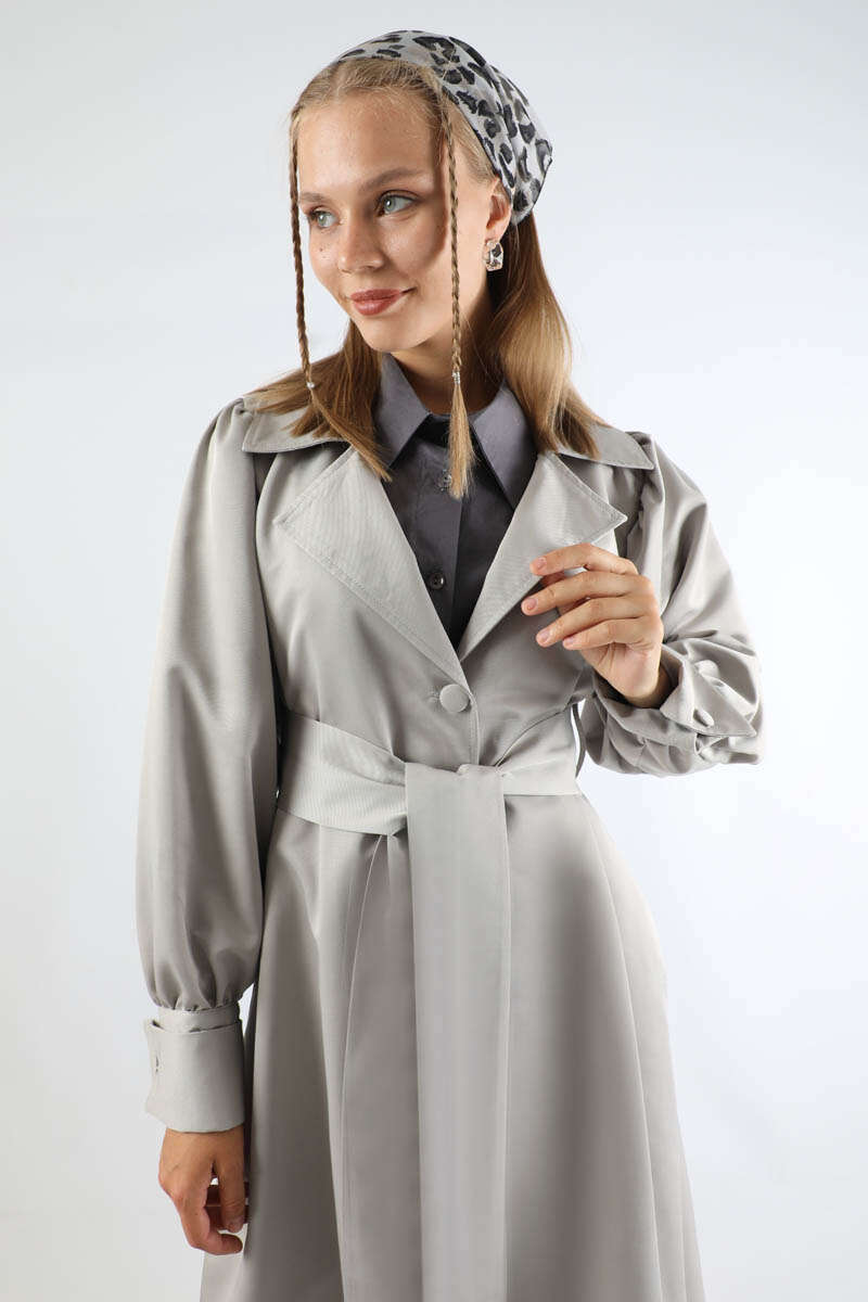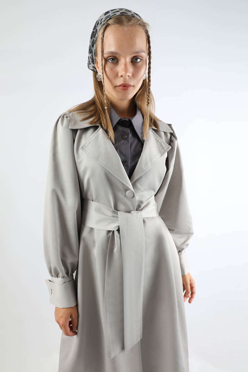 Balon Kol Trençkot Gri. Çift manşetlidir. Omuz tepesi büzgülüdür. Yandan ceplidir. Kaplama düğme detaylıdır. Manşeti büzgü detaylıdır. Kuşaklıdır. Günlük kullanım ve özel günlerinizde tercih edebilirsiniz.