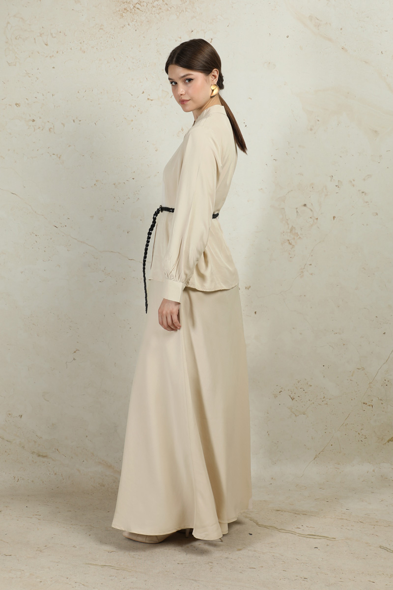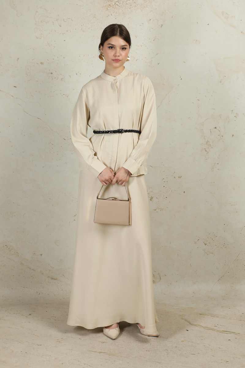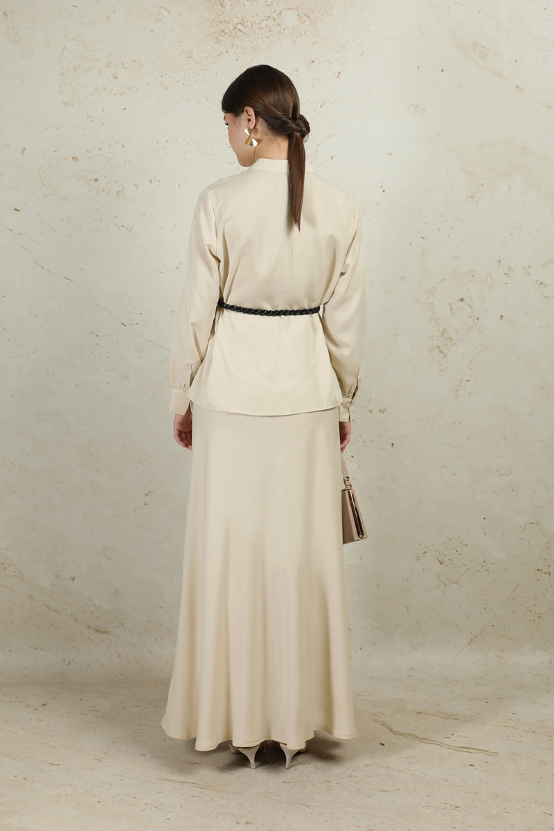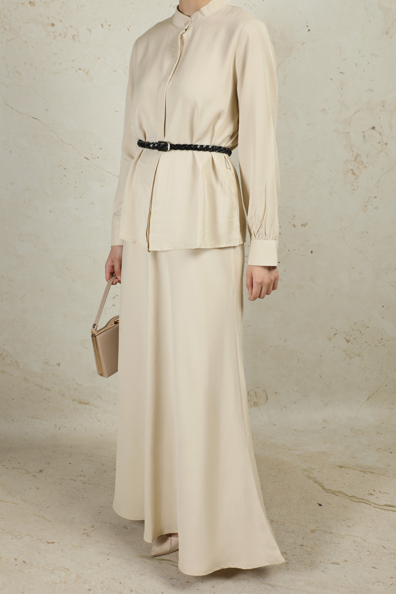 Basic Etek Takım Taş. Hakim yakalıdır. Gizli düğmelidir. Etek beli lastiklidir. Kemer aksesuarı vardır. Manşetlidir. Astarsızdır.