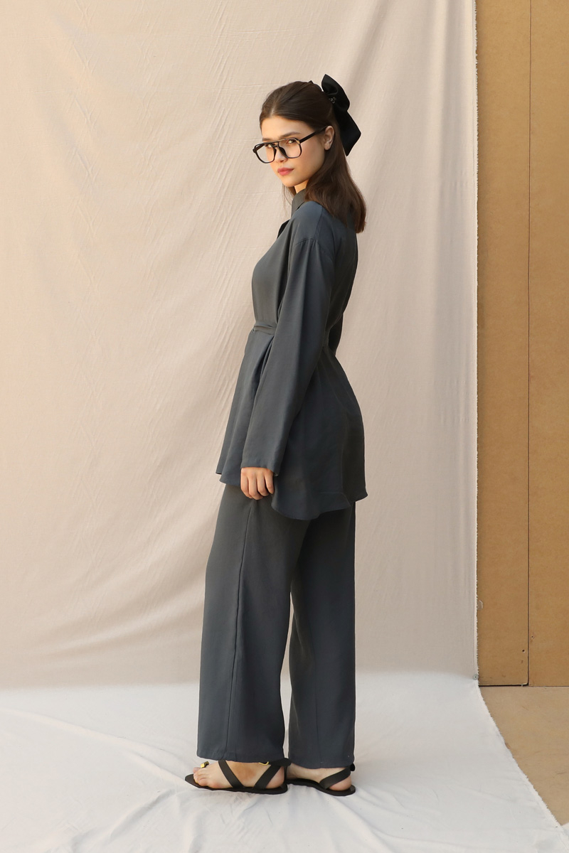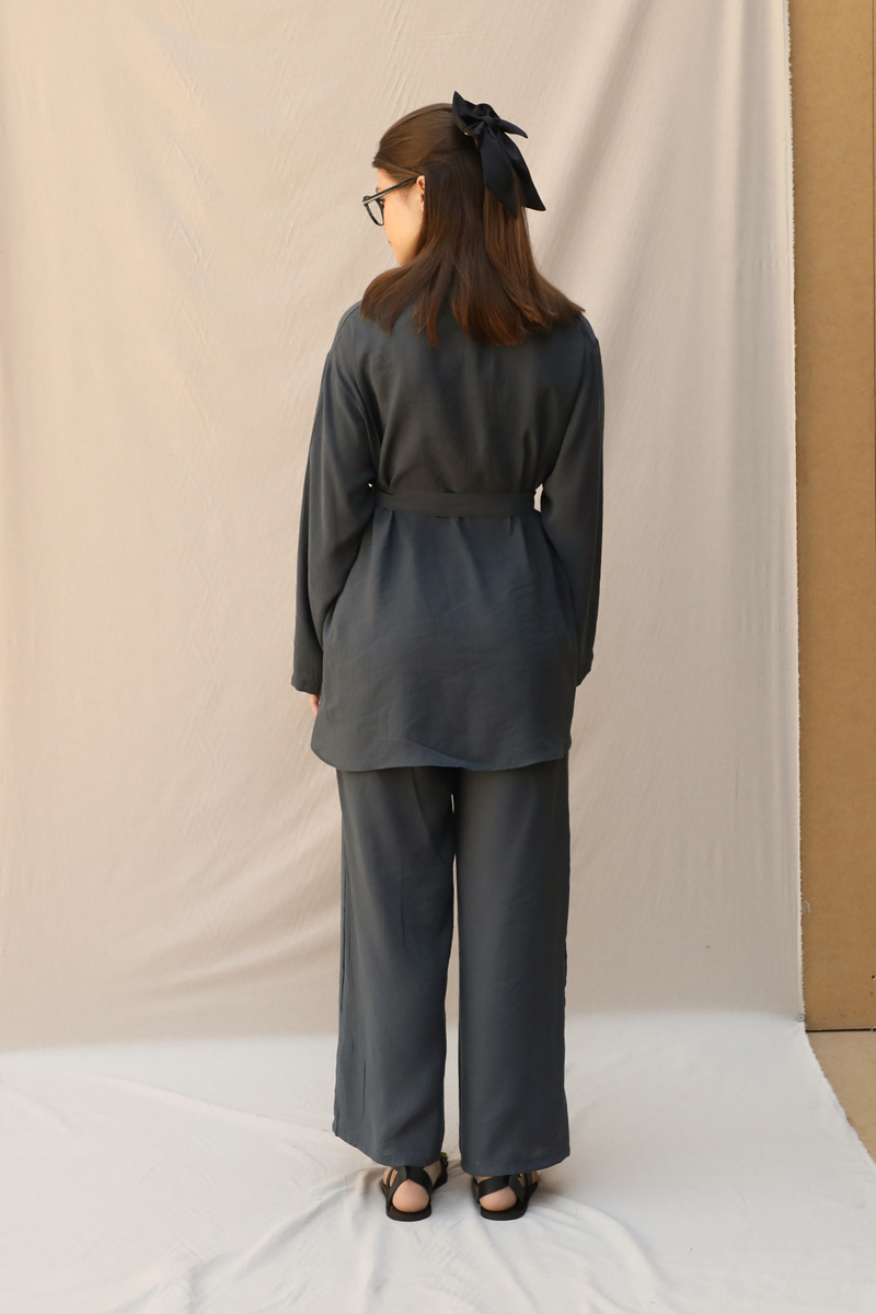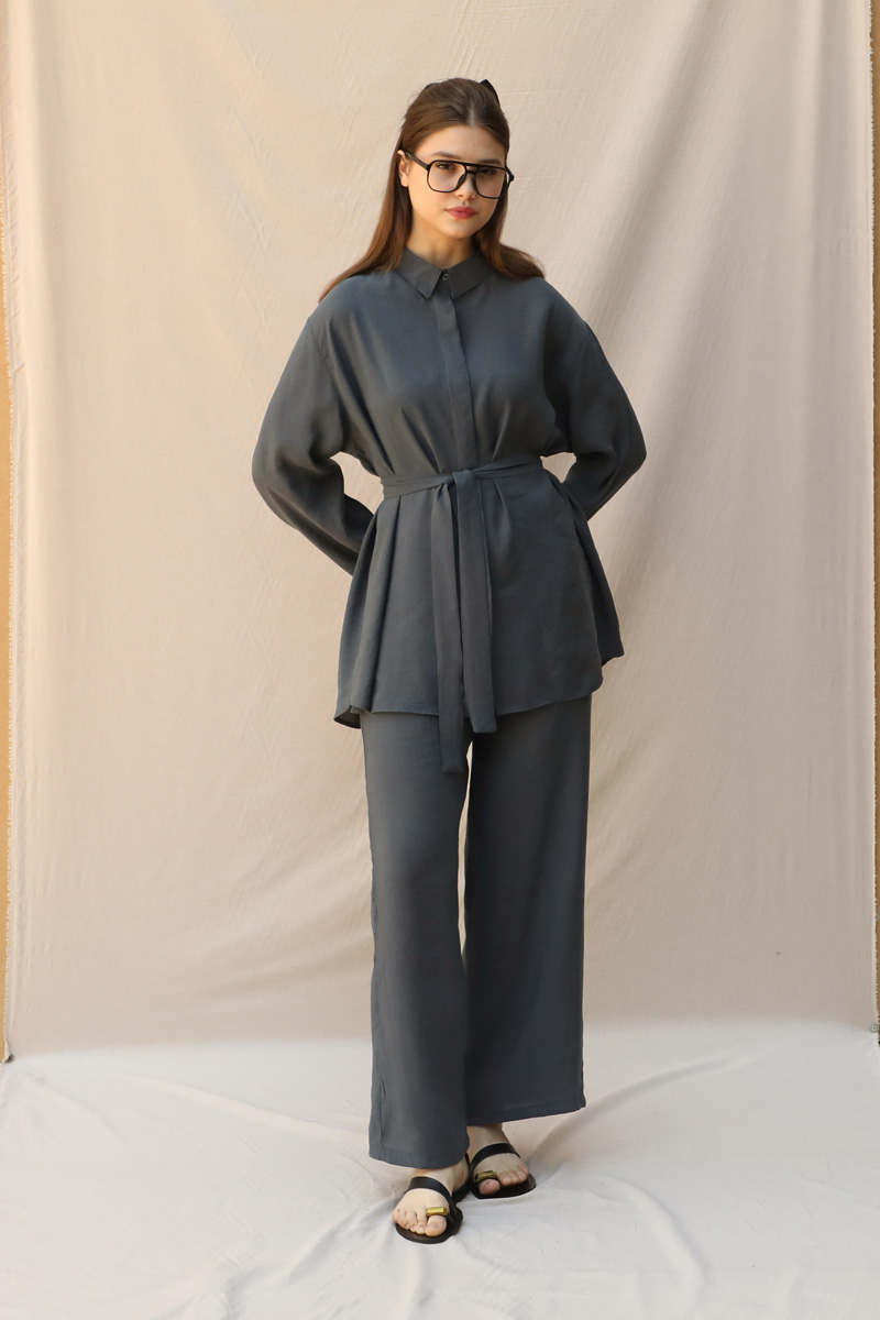 Basic Kuşaklı Gömlek Takım Füme