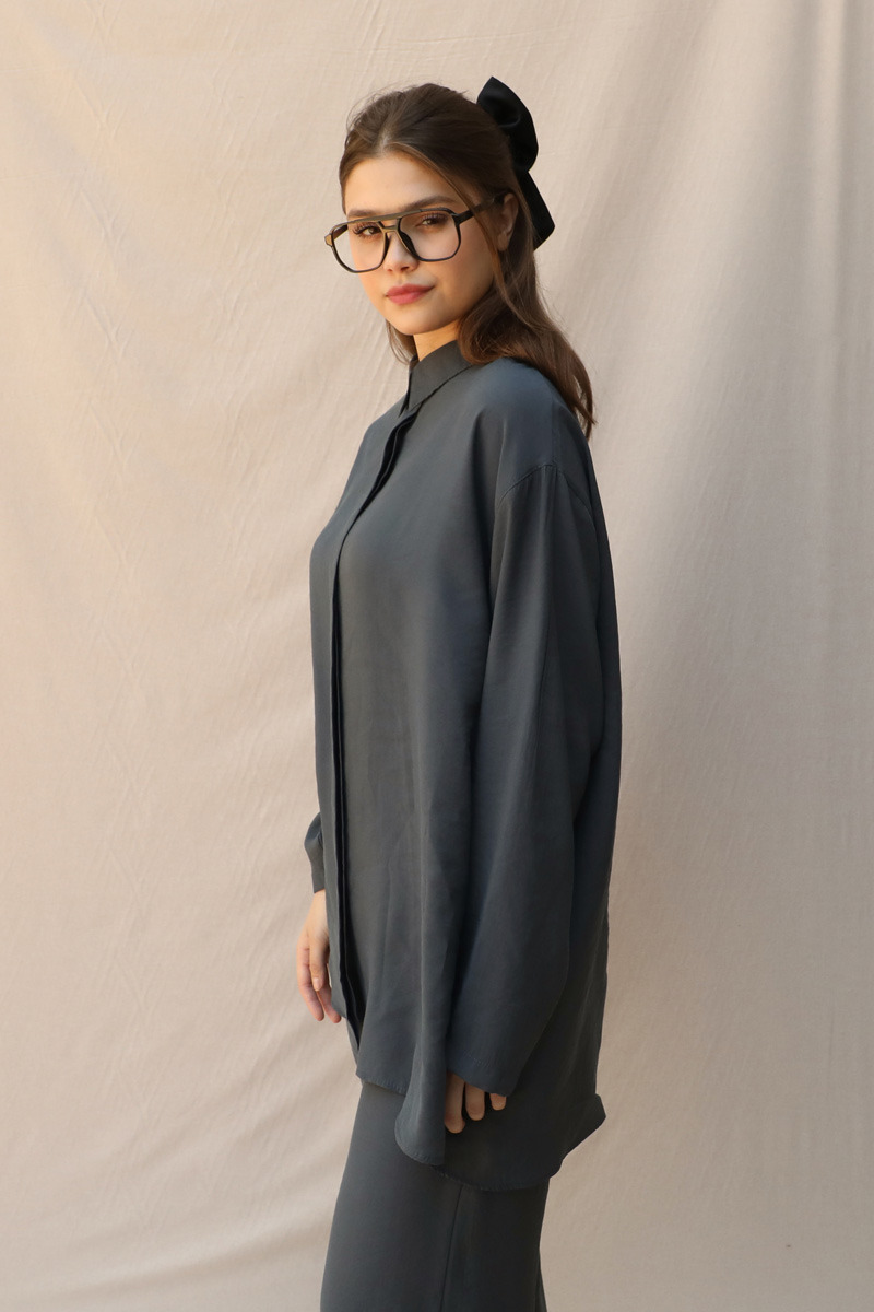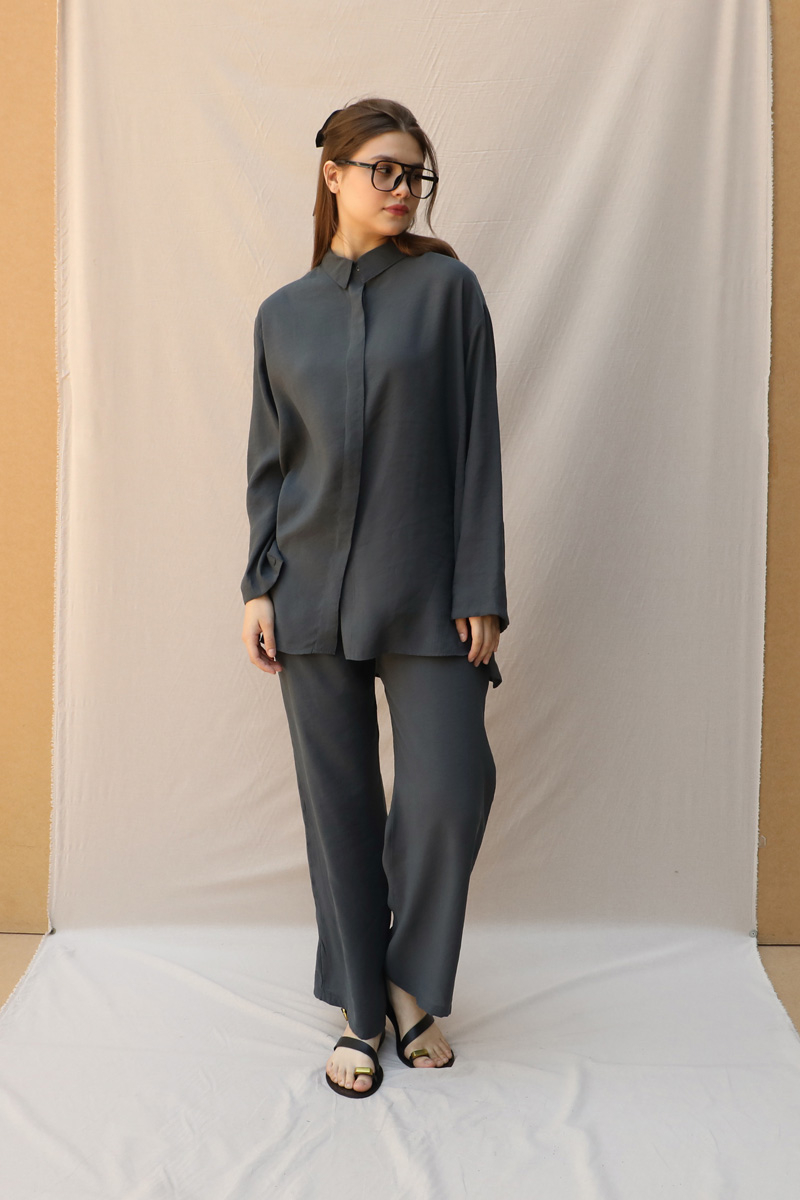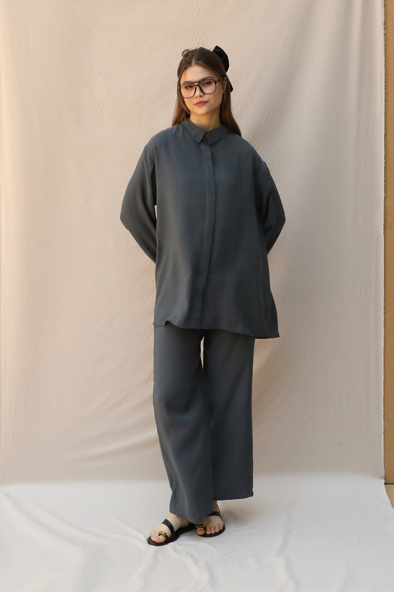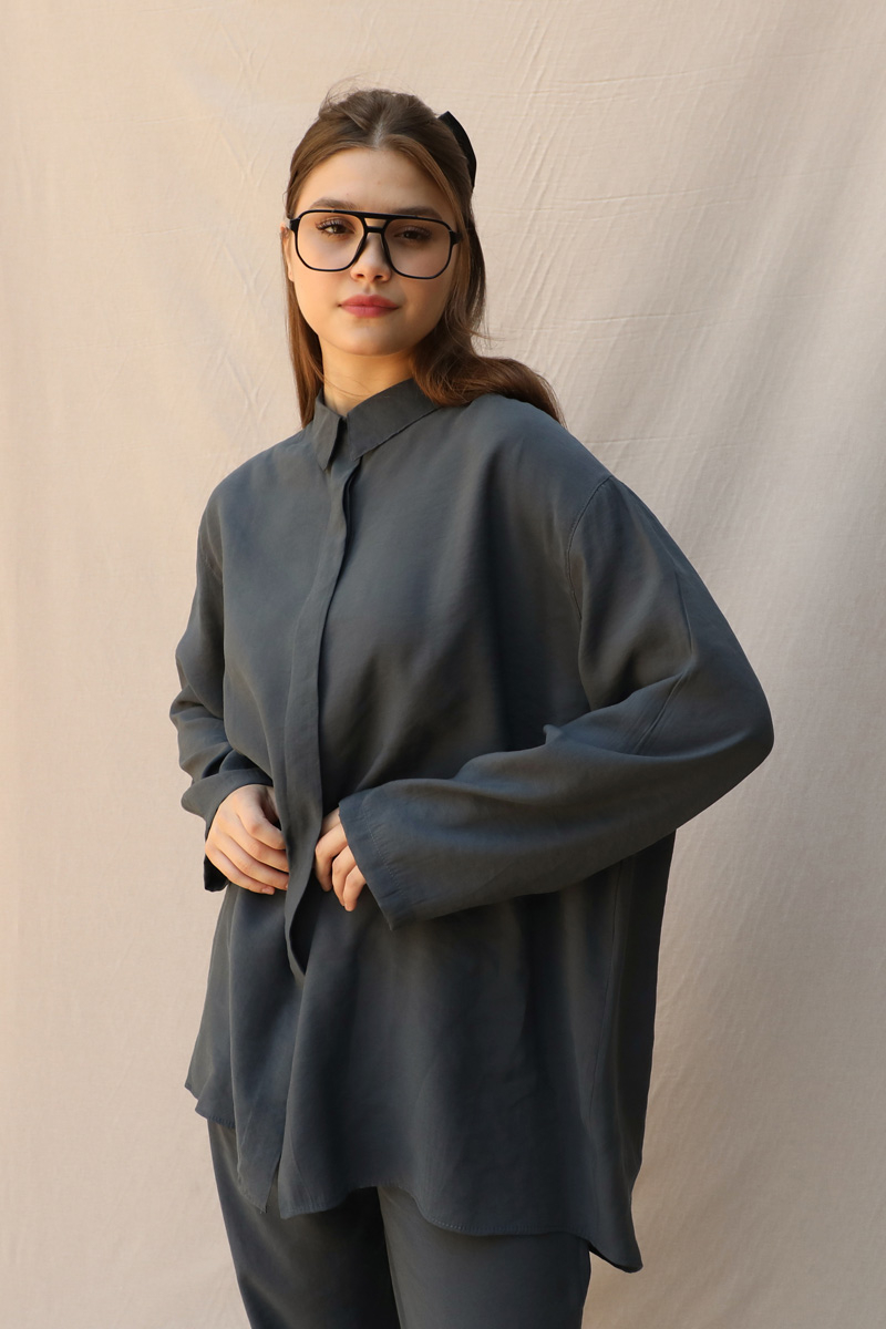Basic Kuşaklı Gömlek Takım Füme