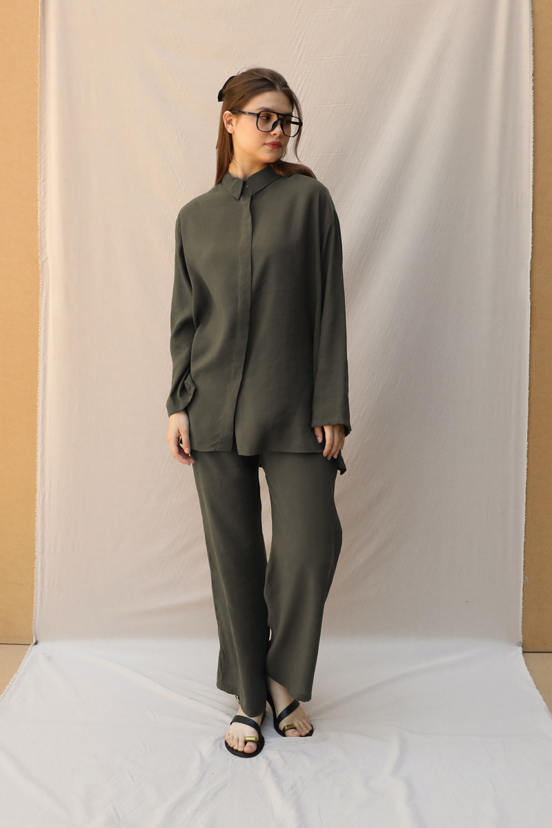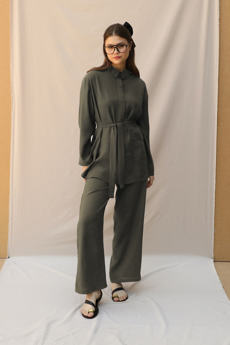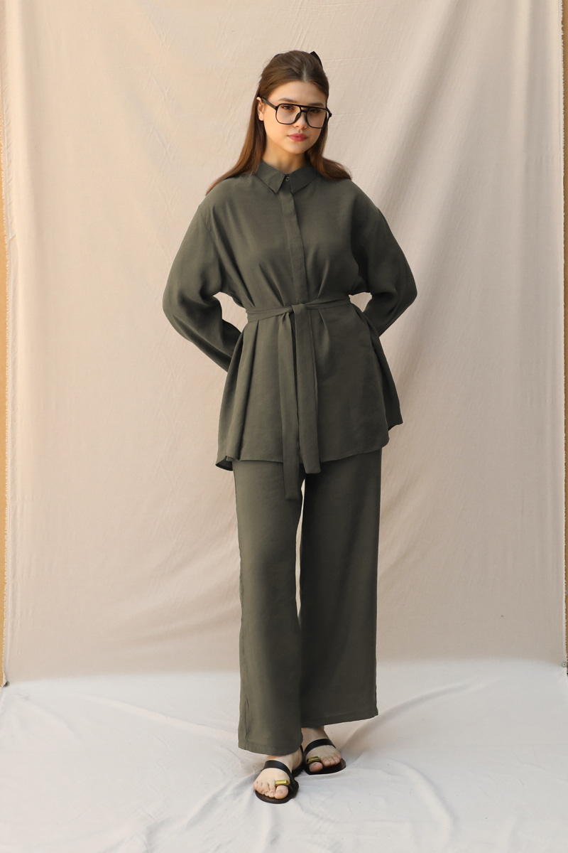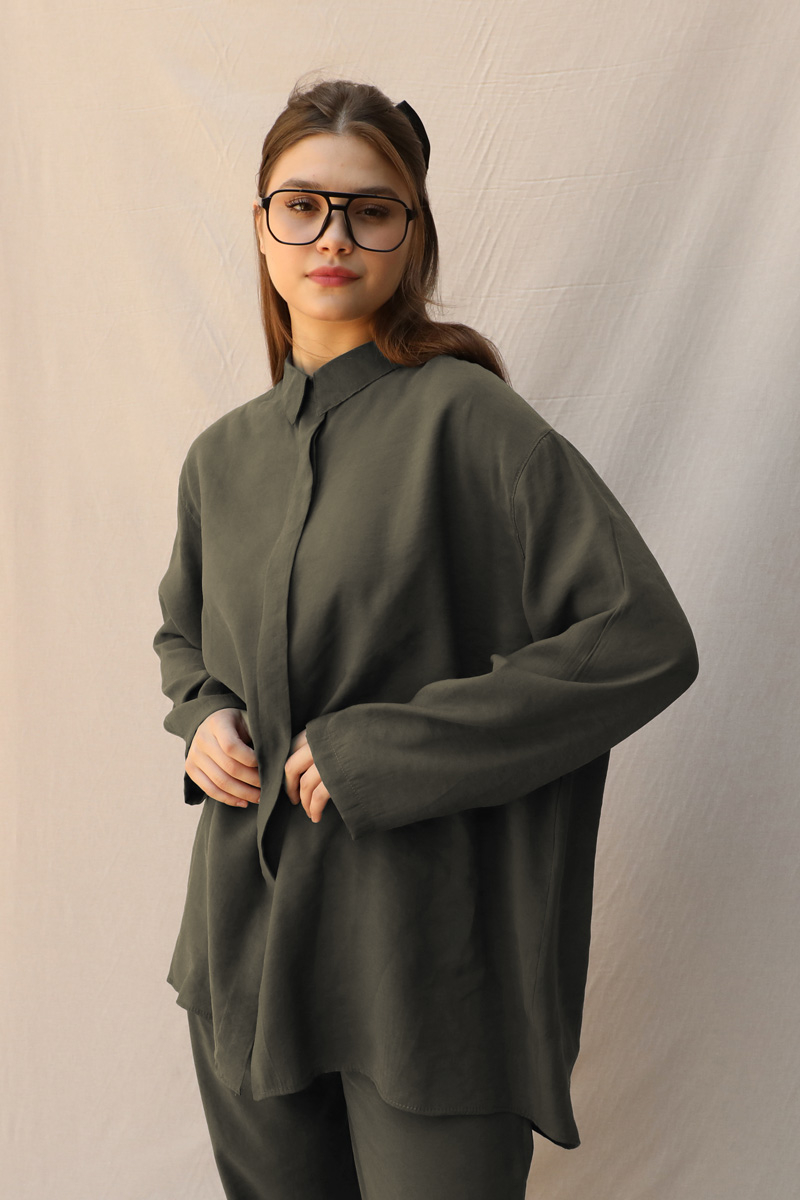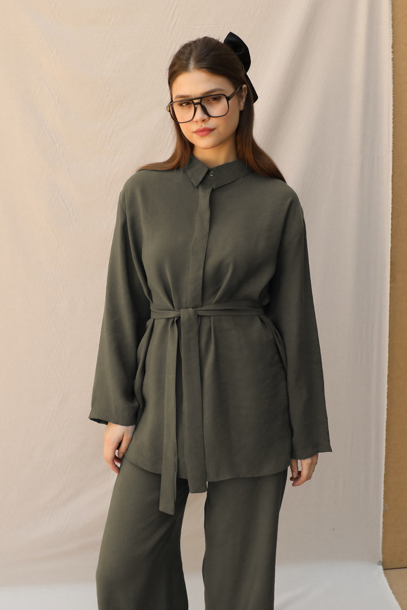 Basic Kuşaklı Gömlek Takım Haki. Gömlek yakalıdır.Gizli düğmelidir. Yarım yarasa kolludur. Kuşaklıdır. Pantolon beli lastiklidir ve yandan ceplidir. Astarsızdır. Özel günlerde ve günlük kullanımlara uygundur.