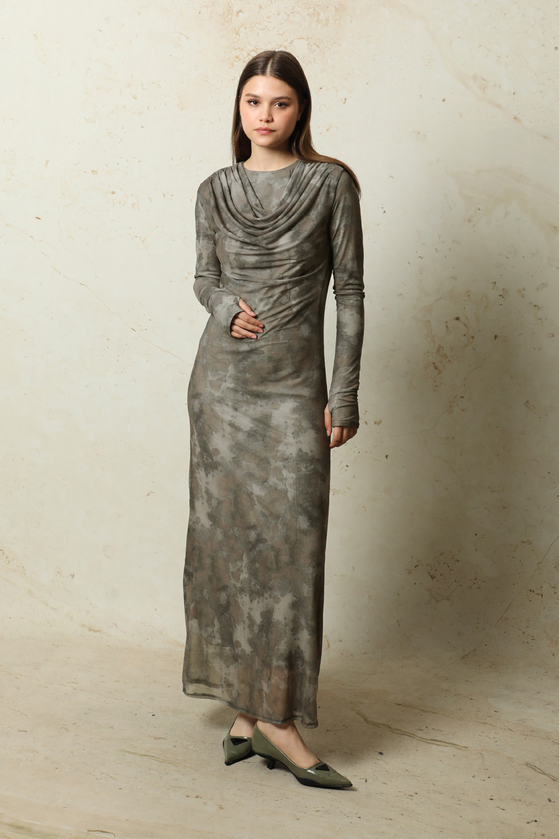 Batik Desen Tül Elbise Haki. Parmak geçirme detayı mevcuttur. Degaje yakalıdır.Uzun kolludur.Astarlıdır.Arka kısmında düğme detayı mevcuttur.Ürünümüzün kalıbı dar kalıptır.