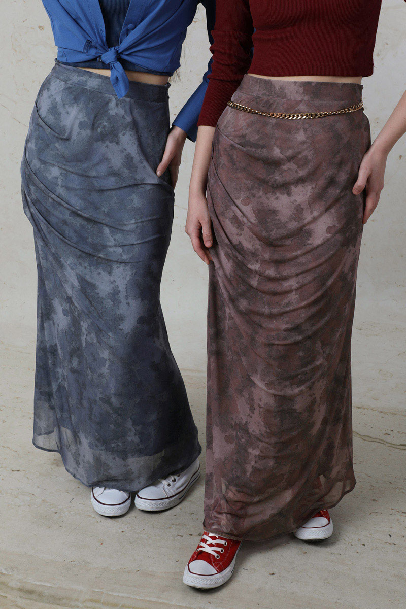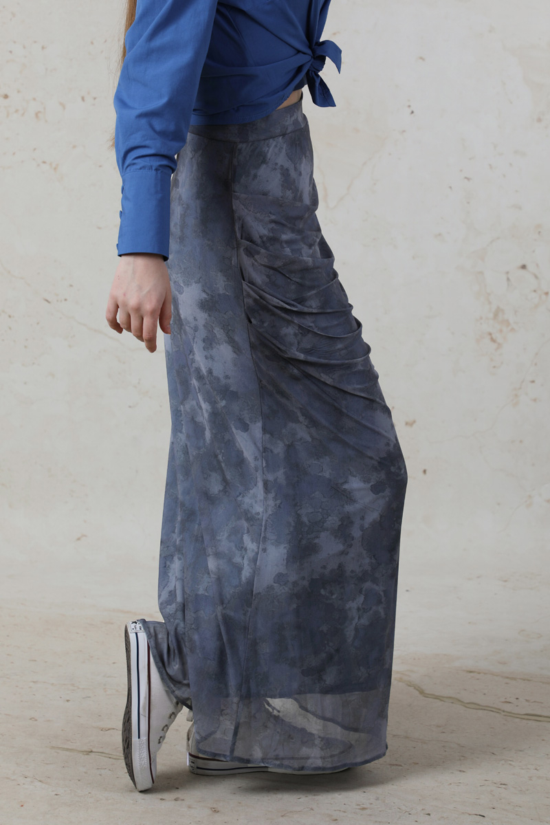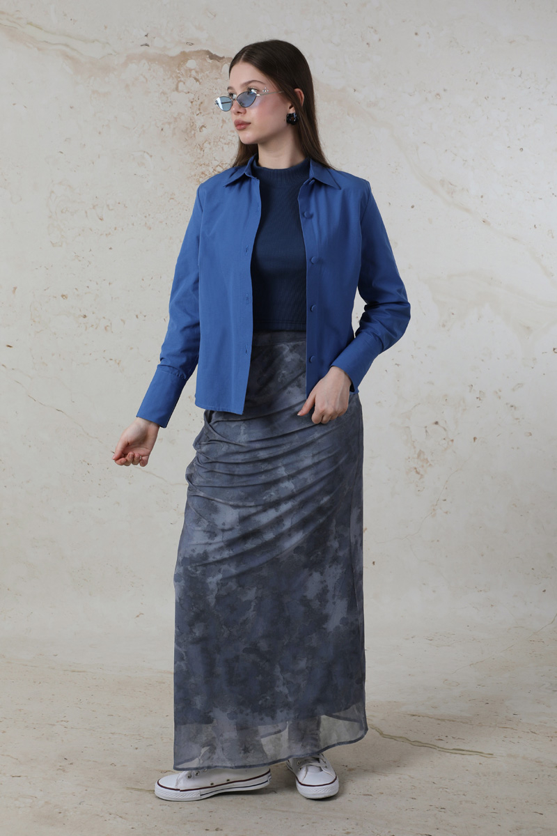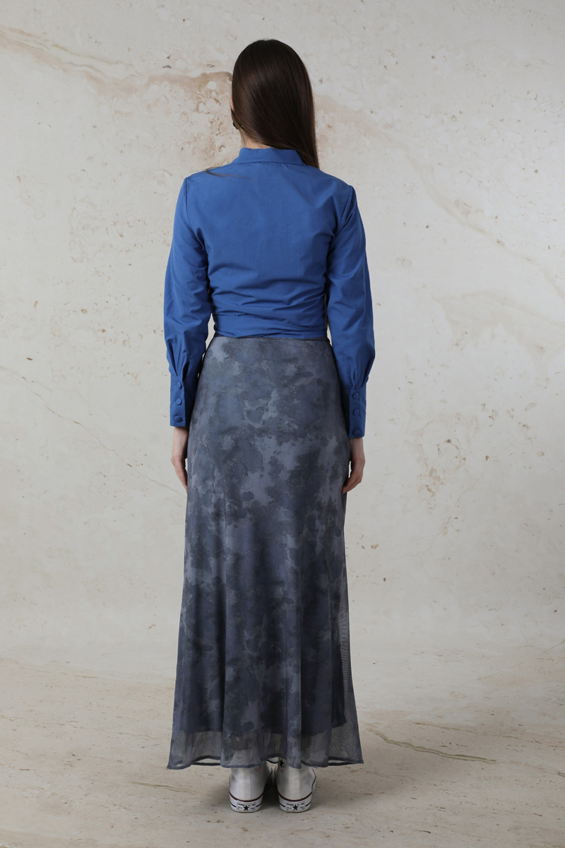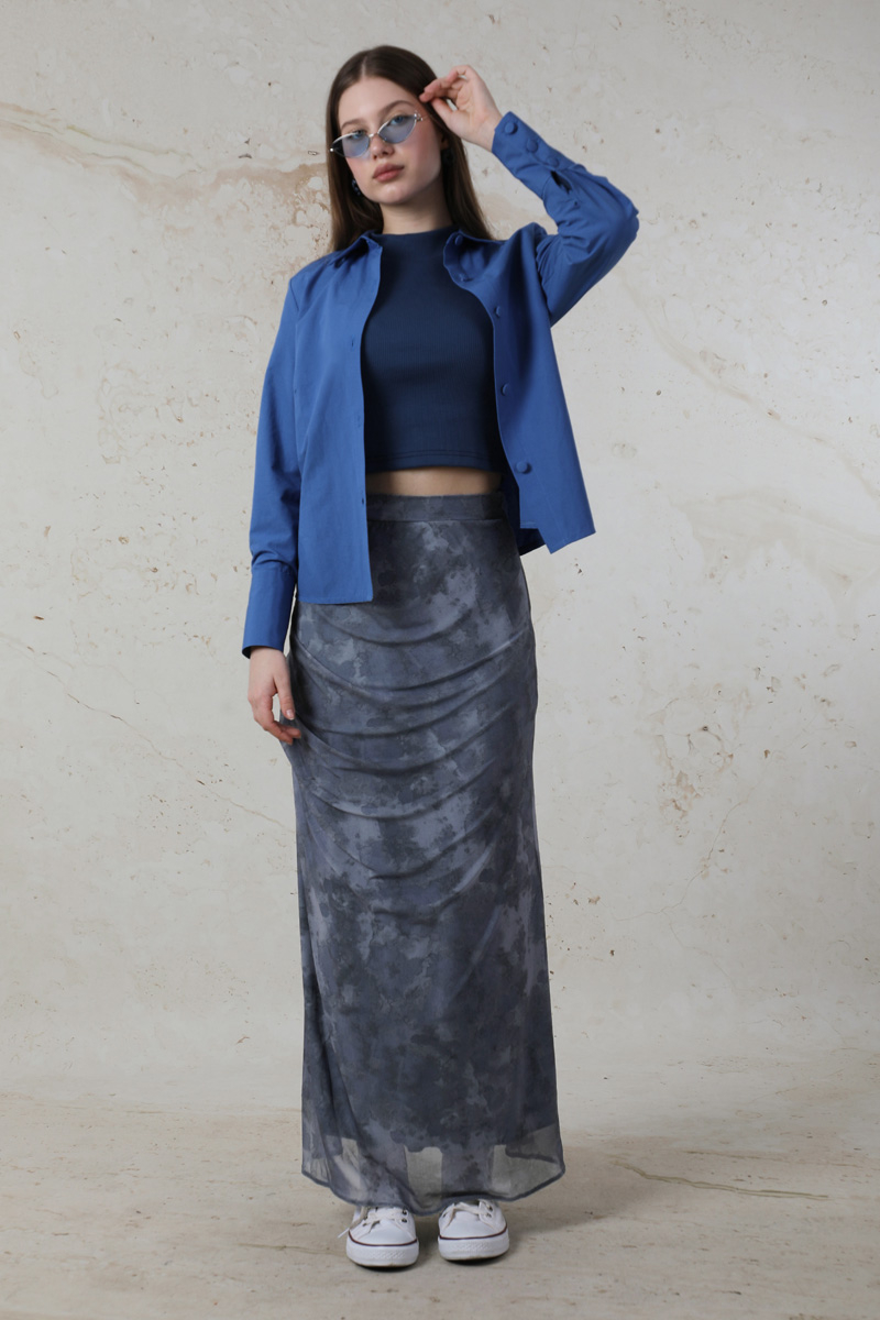 Batik Desenli Tül Etek Mavi. Yandan gizli fermuar detaylıdır. Önden büzgülüdür. Astarlıdır. Tam boy. Günlük kullanım ve özel günlerinizde tercih edebilirsiniz.