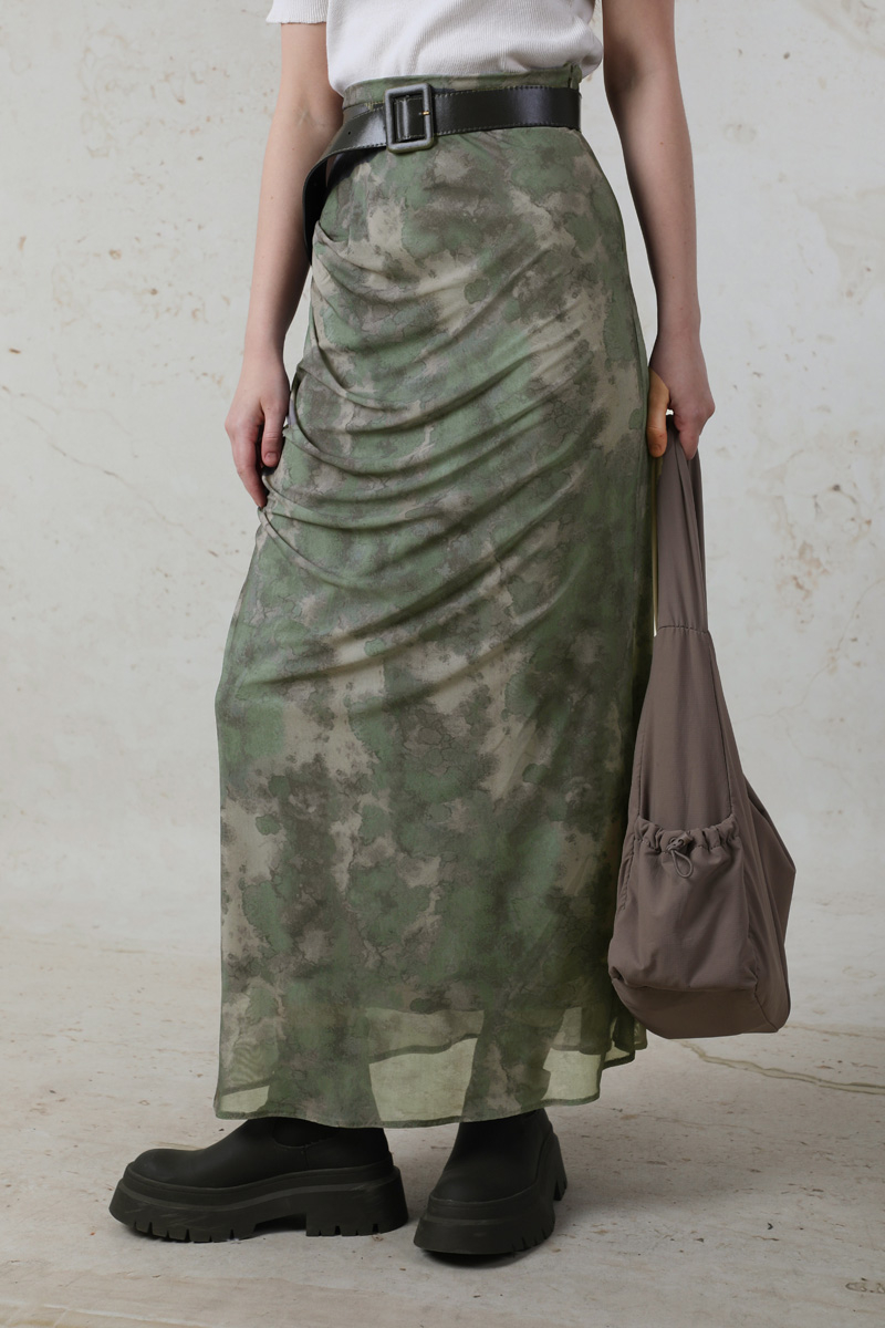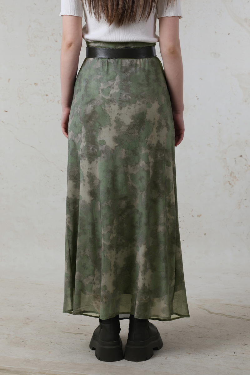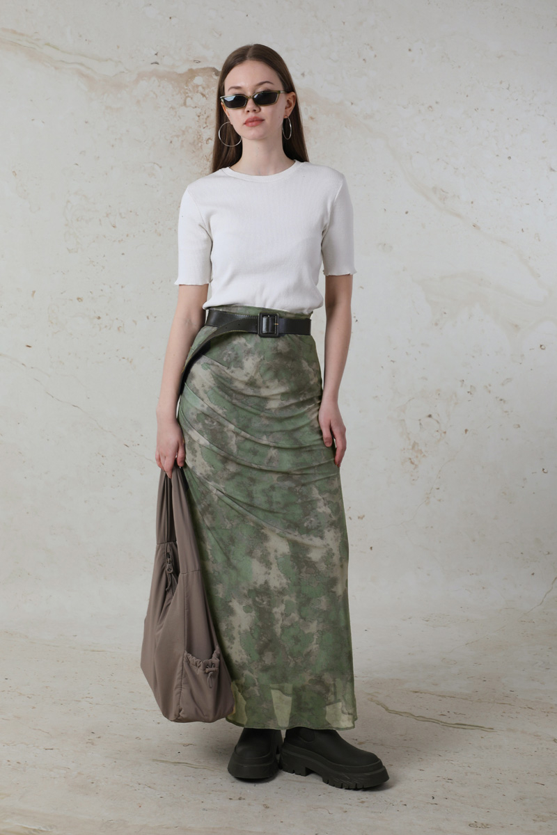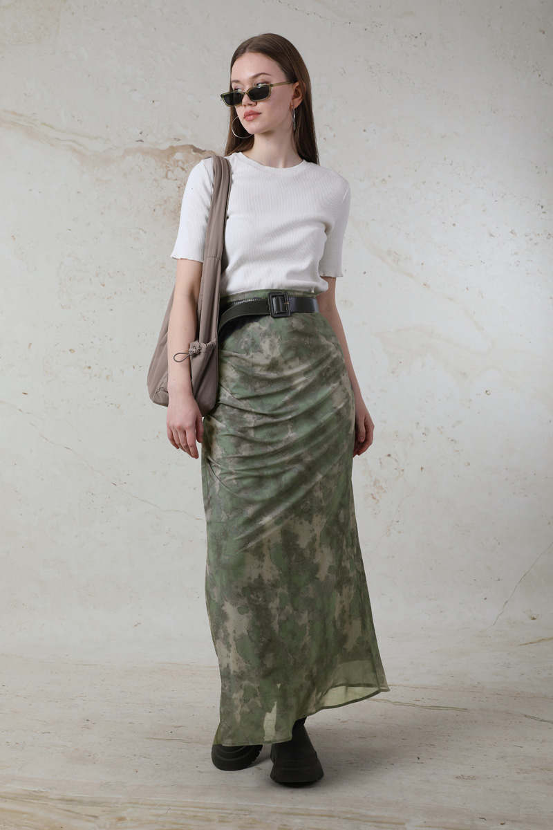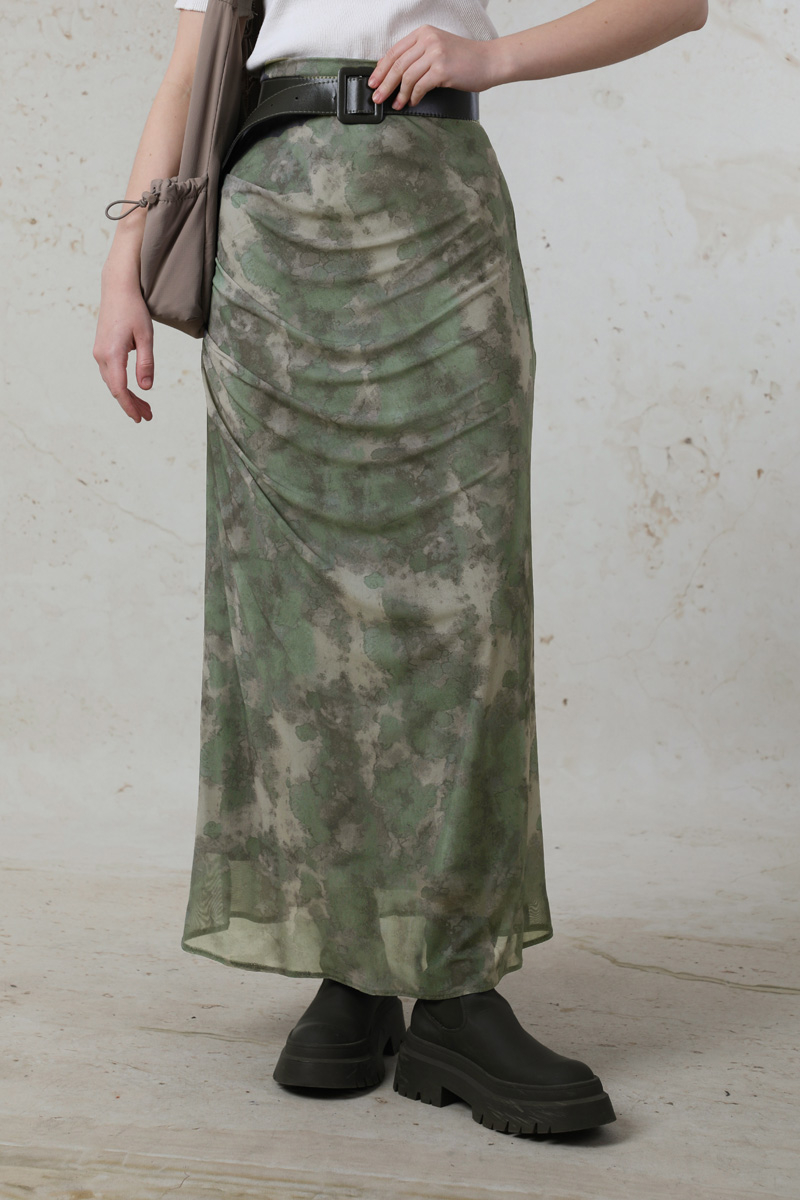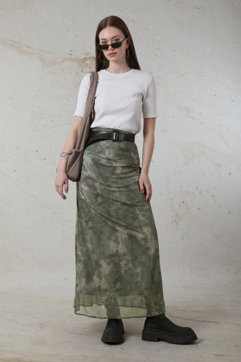 Batik Desenli Tül Etek Yeşil. Yandan gizli fermuar detaylıdır. Önden büzgülüdür. Astarlıdır. Tam boy. Günlük kullanım ve özel günlerinizde tercih edebilirsiniz.
