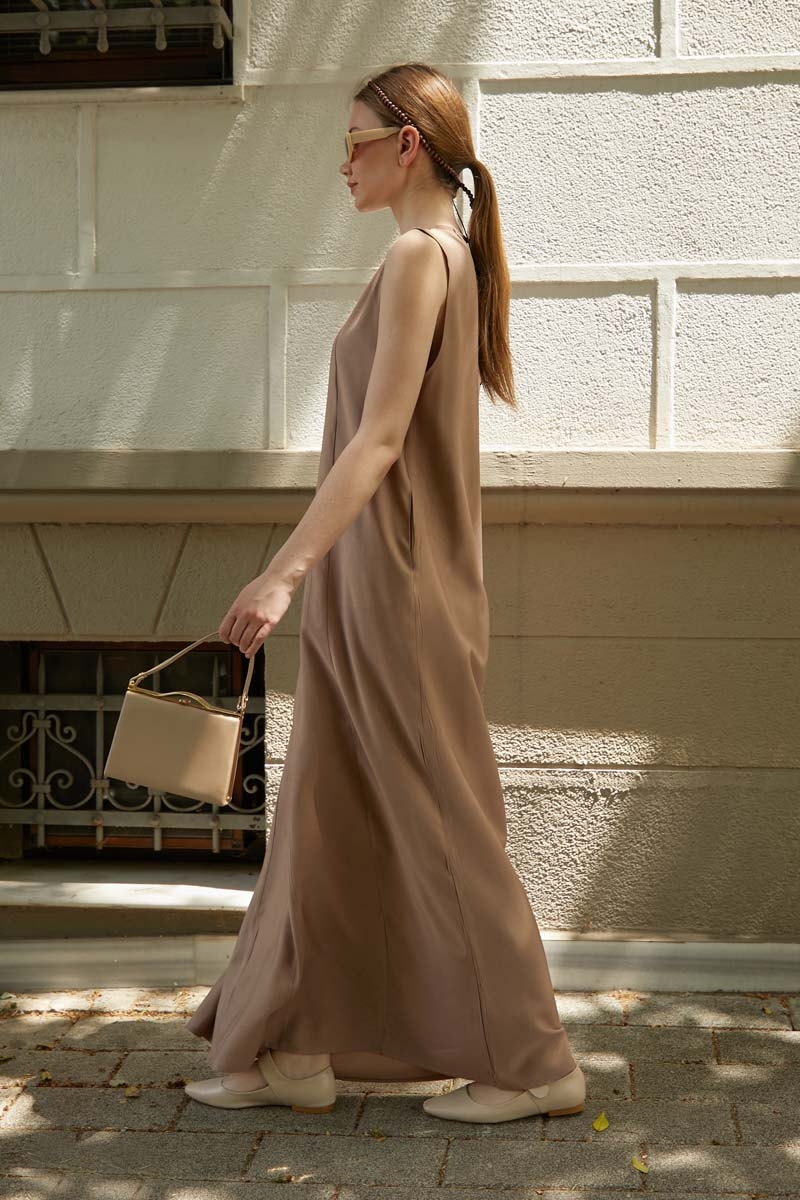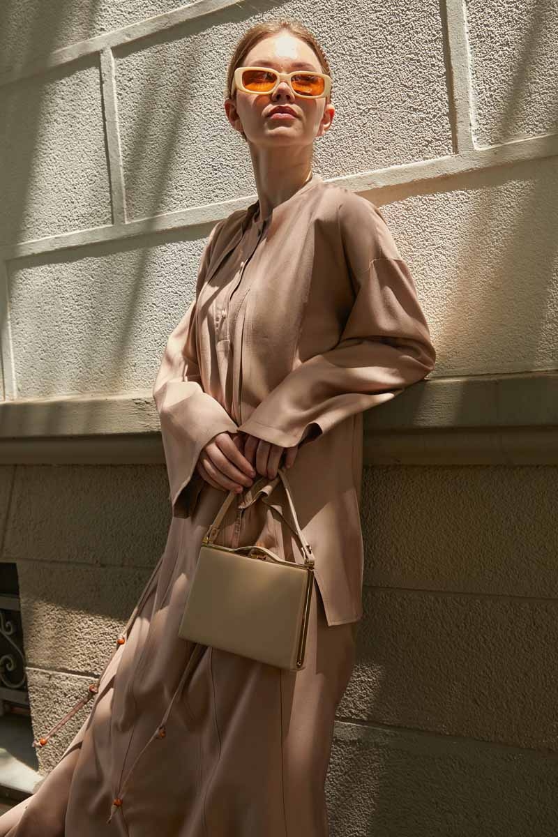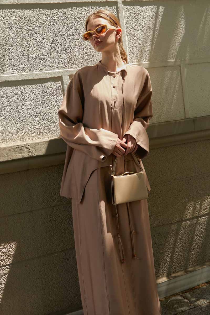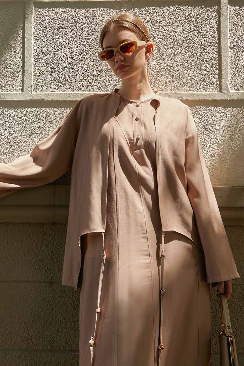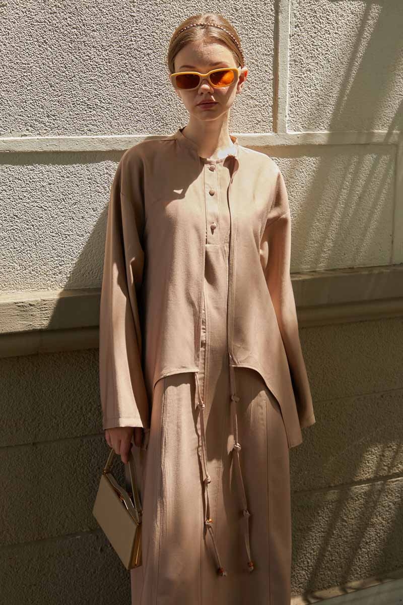 The kimono-style outer piece features an asymmetrical front cut, dropped shoulders, tie-up cuffs, and wooden bead details on the front. The inner dress has a crew neck, a partial button closure at the front, side pockets, no lining, and a relaxed fit. Suitable for daily wear.
