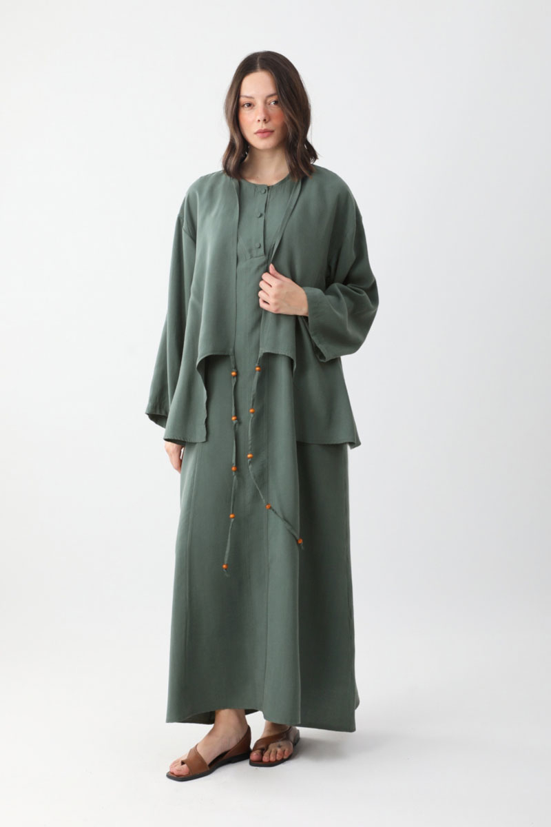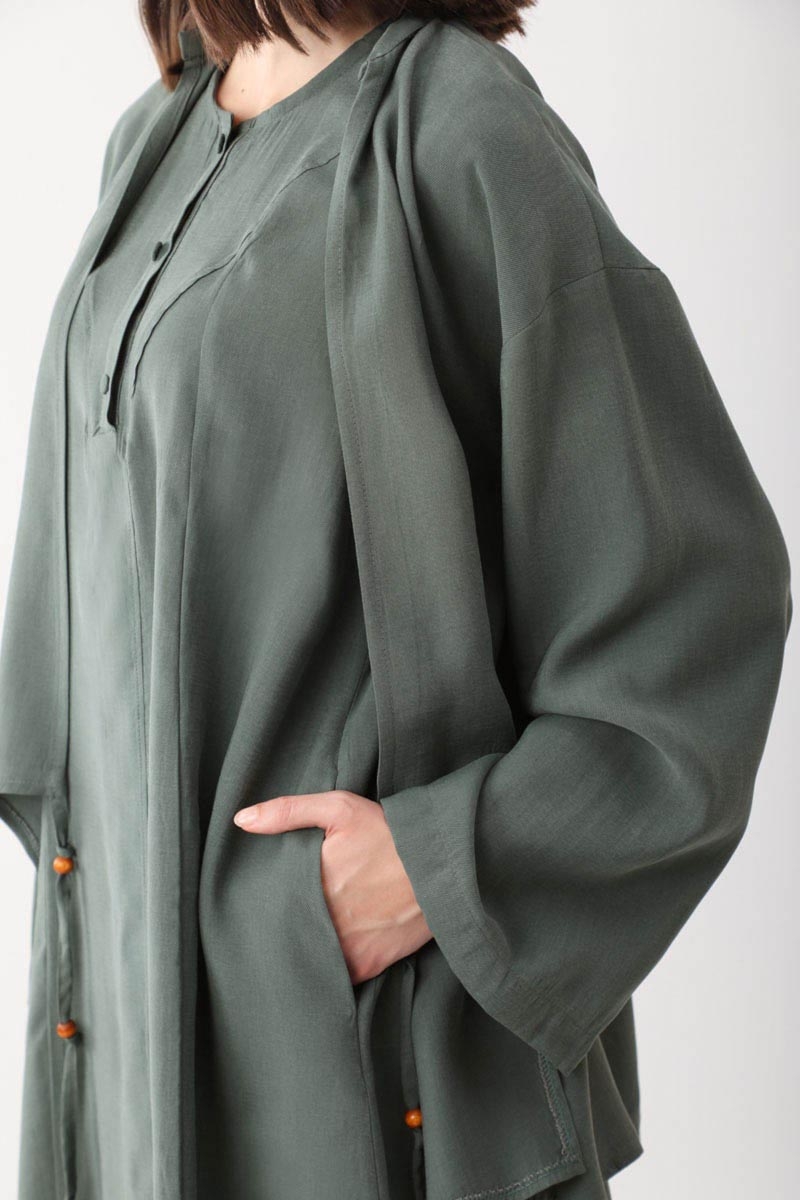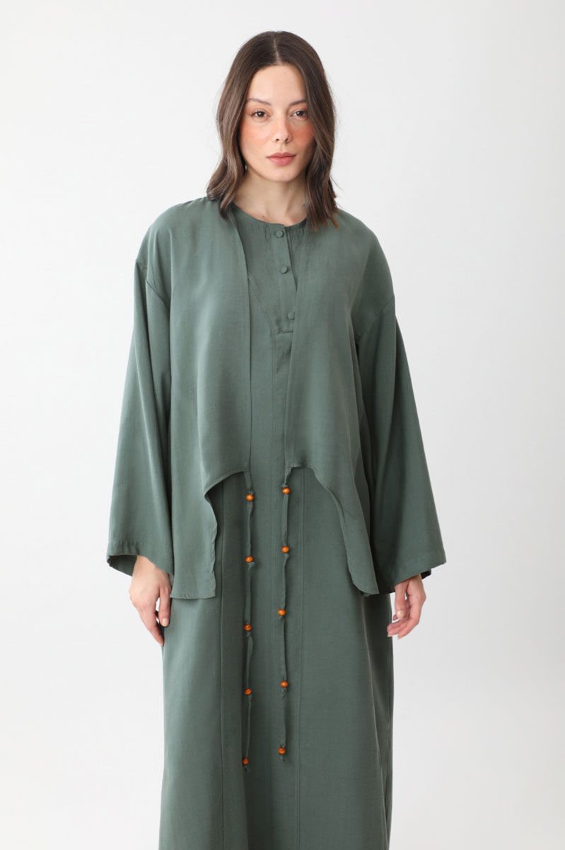 The kimono-style outer piece features an asymmetrical front cut, dropped shoulders, tie-up cuffs, and wooden bead details on the front. The inner dress has a crew neck, a partial button closure at the front, side pockets, no lining, and a relaxed fit. Suitable for daily wear.