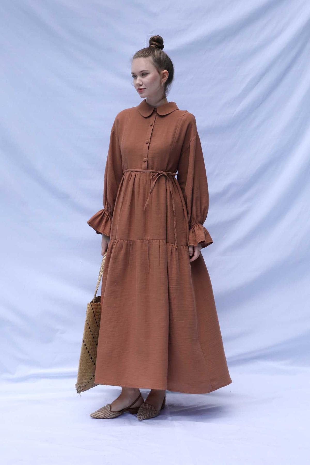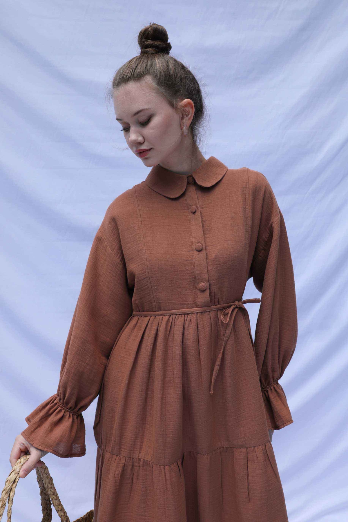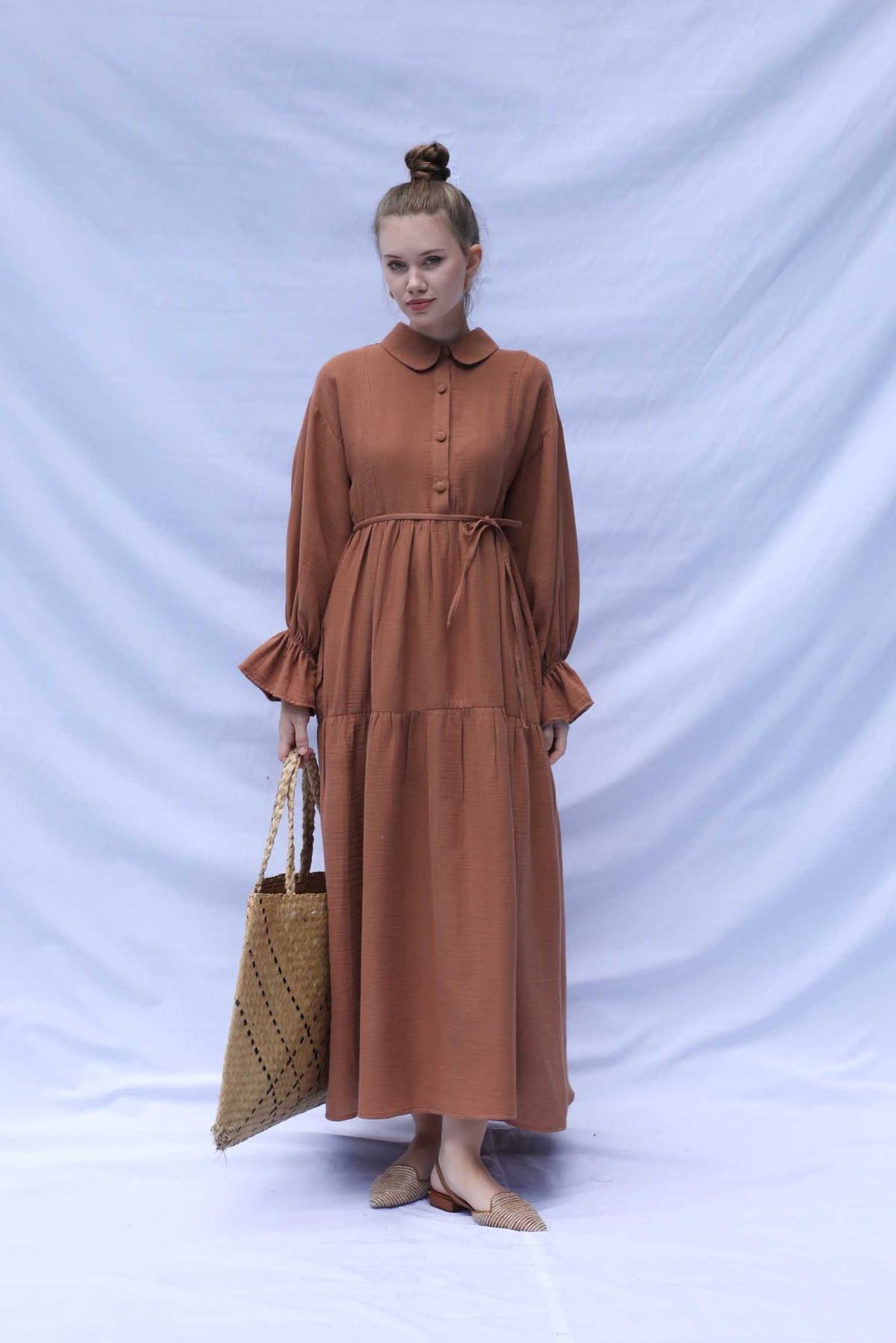 Bebe Yaka Katlı Elbise Kiremit. Bebe Yakalıdır, önden yarım düğmelidir, belden ve eteğinden katlıdır. İnce biye kuşaklıdır. Bilekten Lastikli ve volanlıdır, astarsızdır.