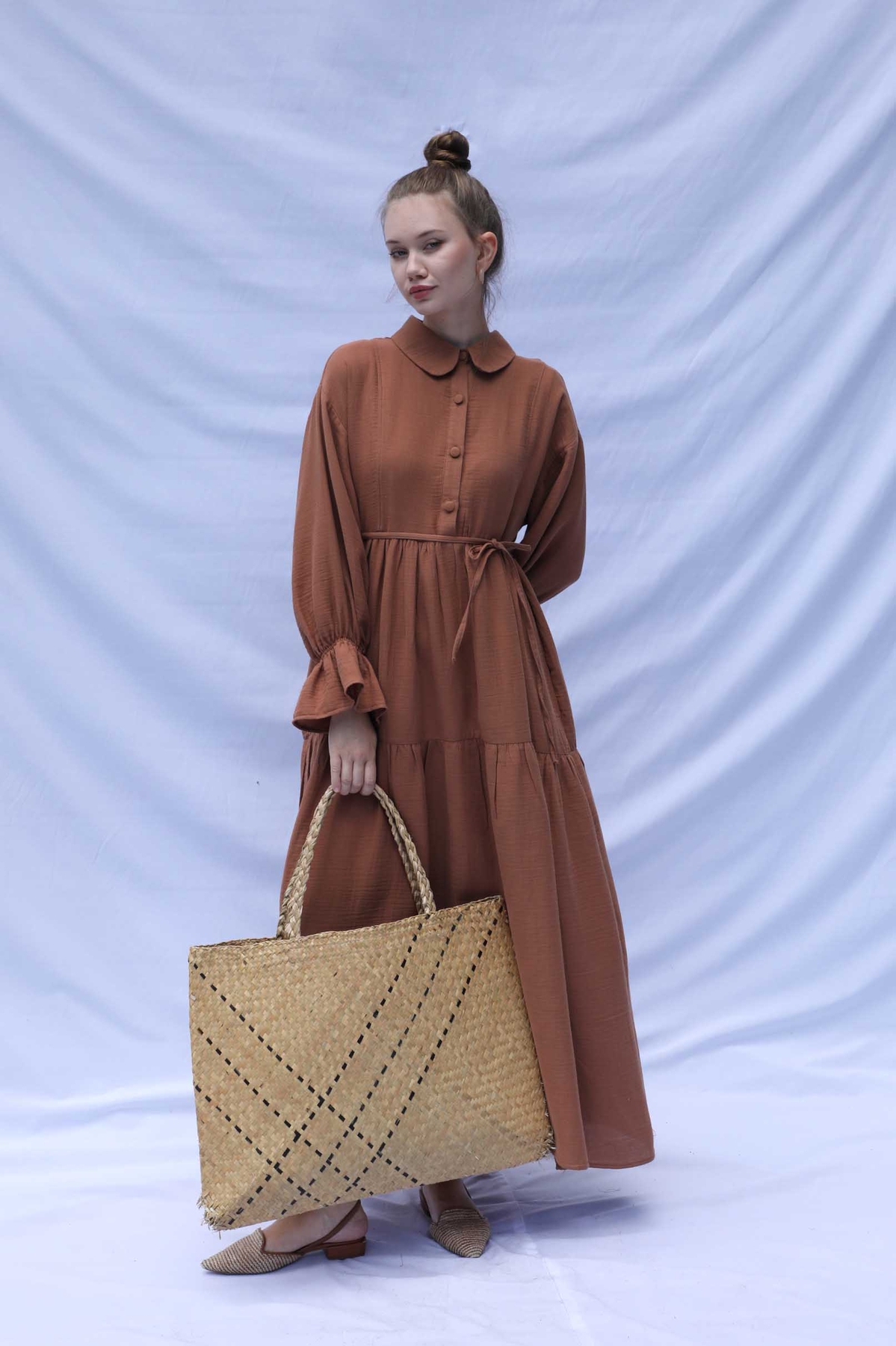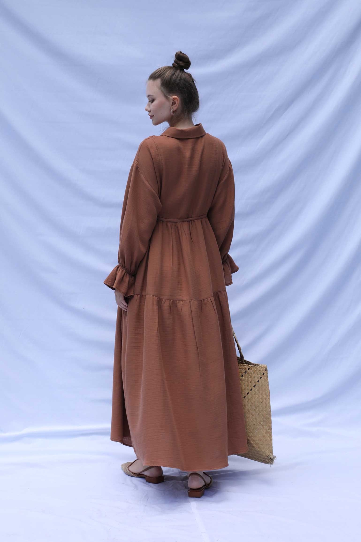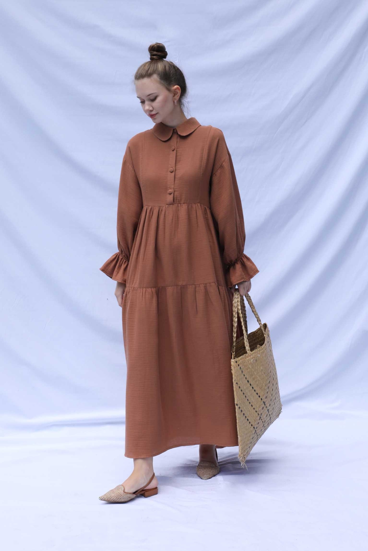 Bebe Yaka Katlı Elbise Kiremit. Bebe Yakalıdır, önden yarım düğmelidir, belden ve eteğinden katlıdır. İnce biye kuşaklıdır. Bilekten Lastikli ve volanlıdır, astarsızdır.