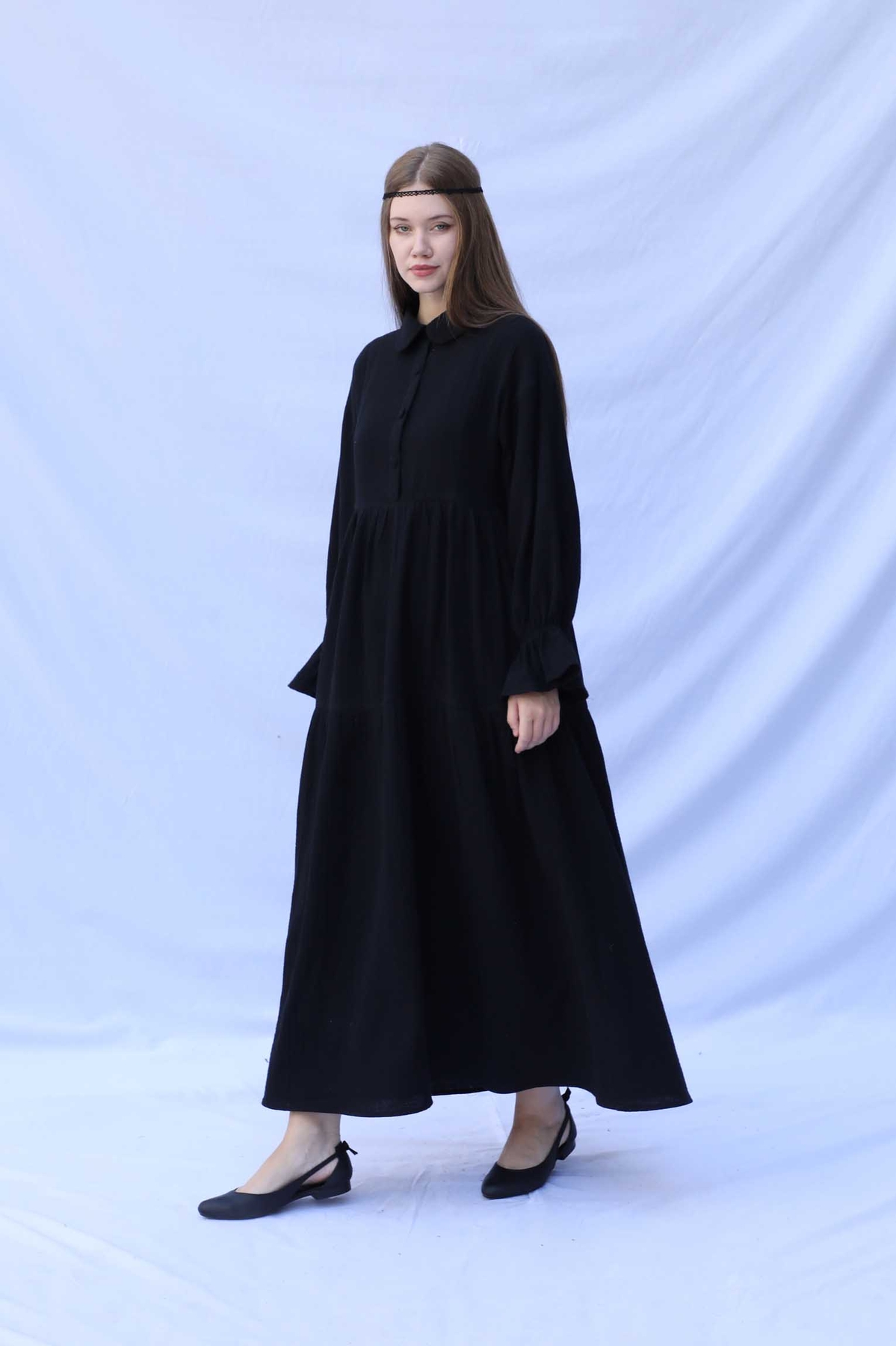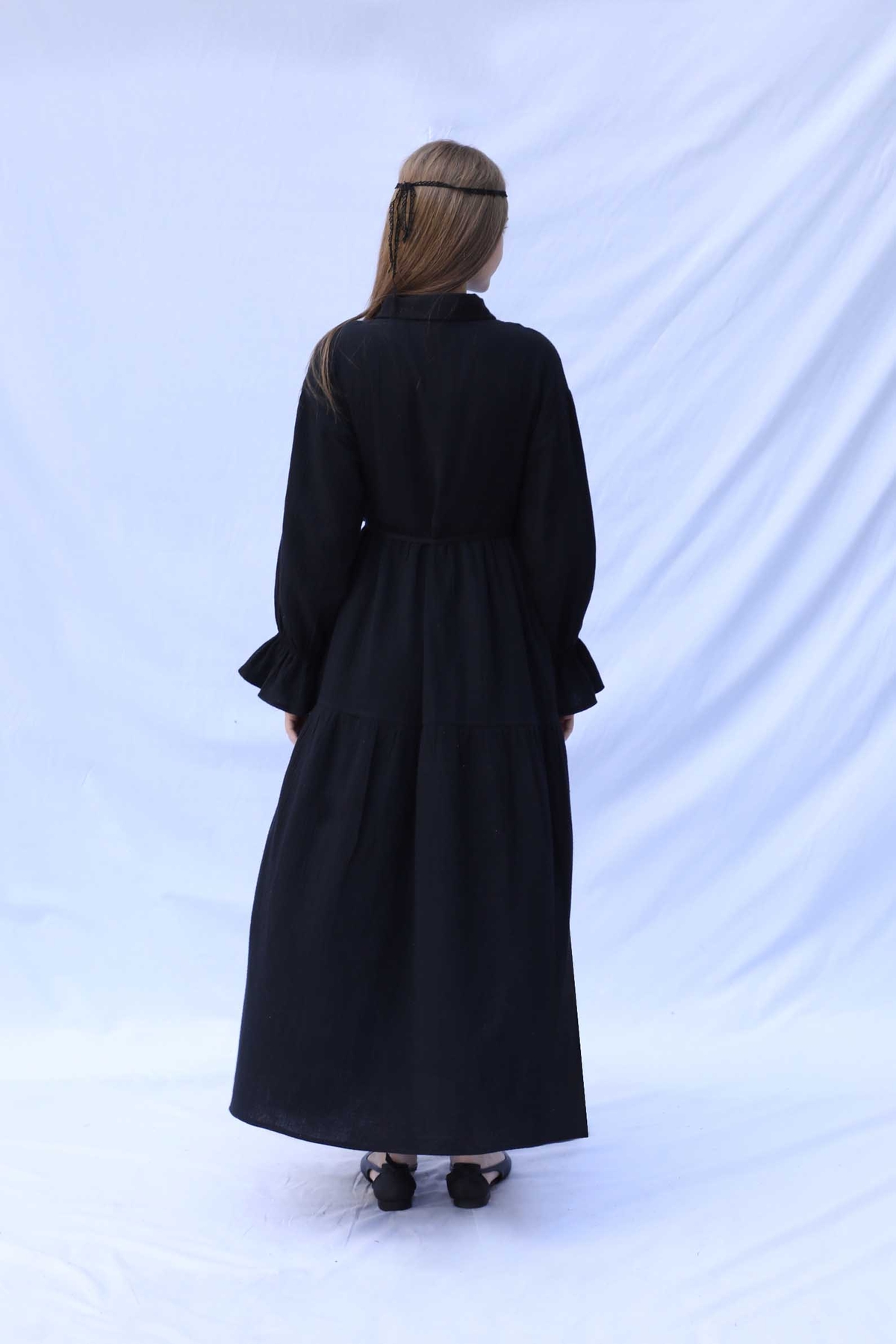 Bebe Yaka Katlı Elbise Siyah. Bebe Yakalıdır, önden yarım düğmelidir, belden ve eteğinden katlıdır. İnce biye kuşaklıdır. Bilekten Lastikli ve volanlıdır, astarsızdır.