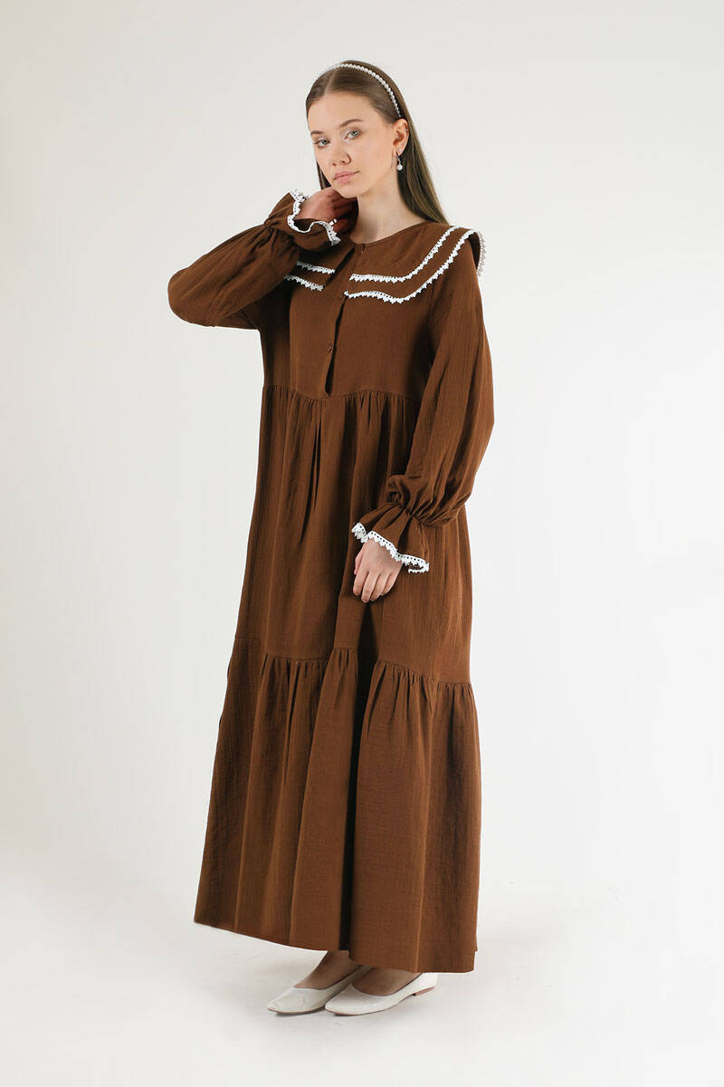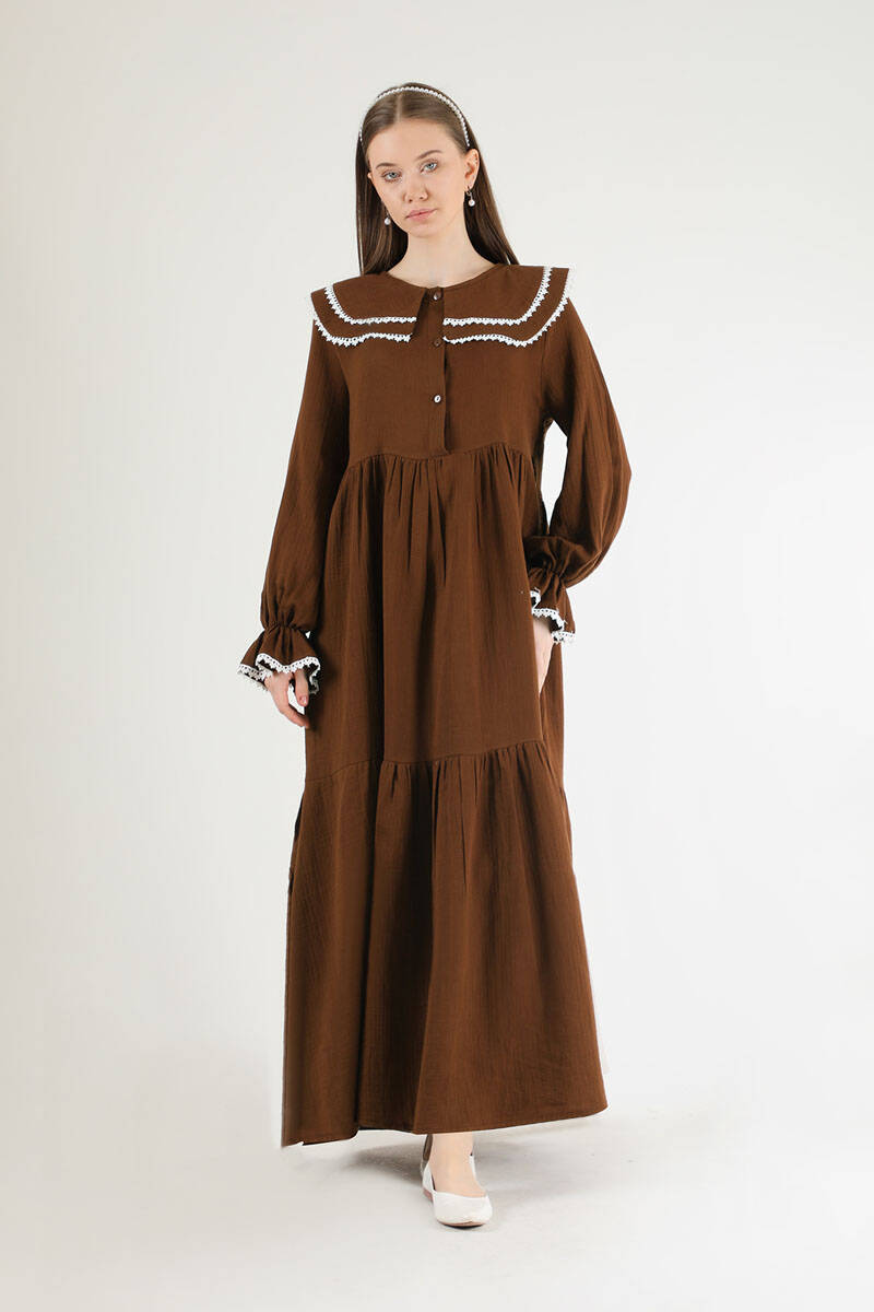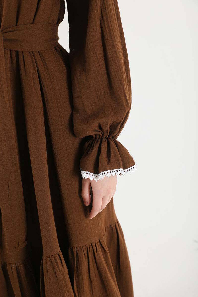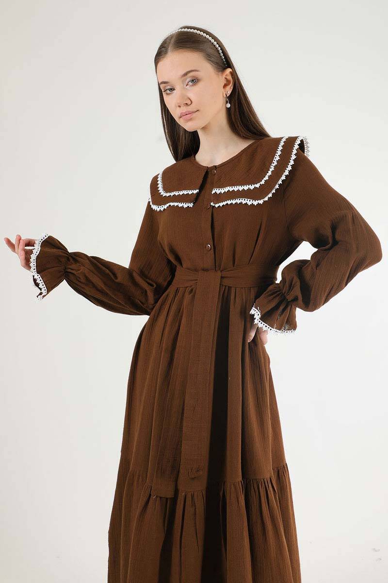 Bebe Yaka Kuşaklı Elbise Kahve