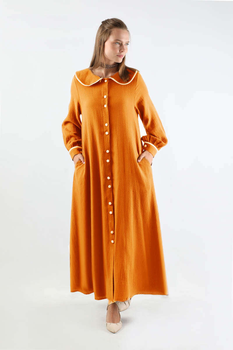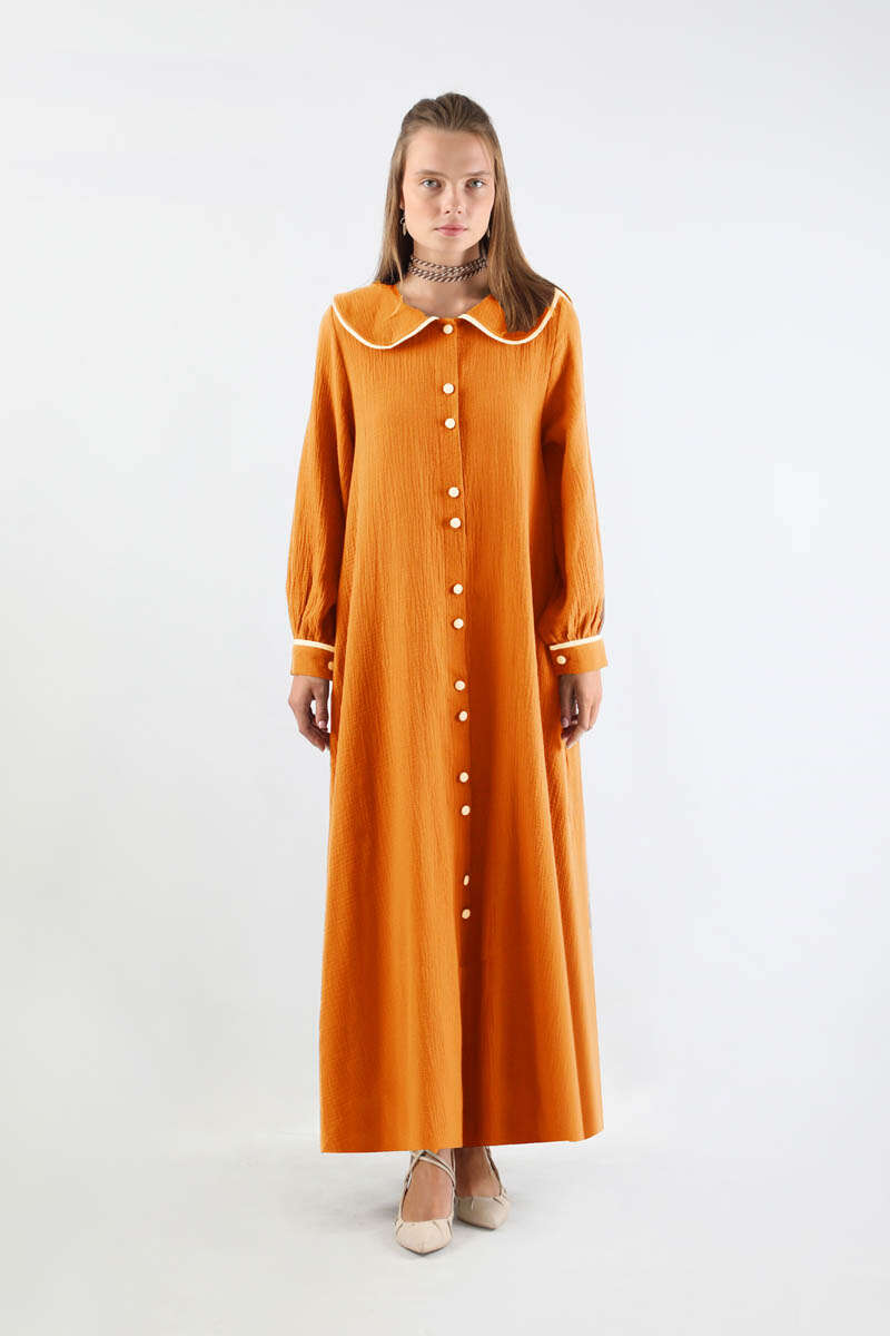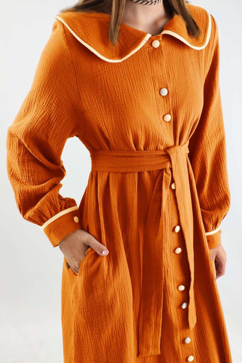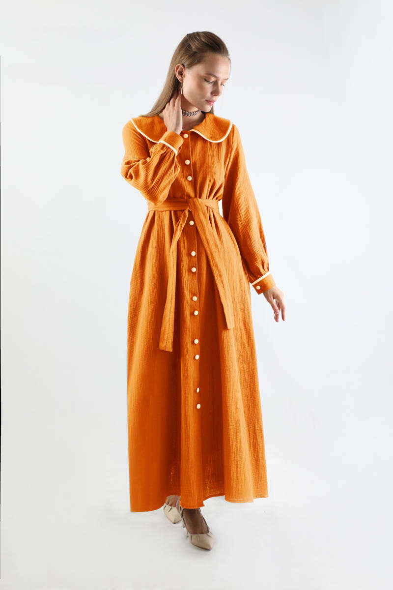 Bebe Yaka Müslin Elbise Oranj. Garnili bebe yakalıdır. Önü çift düğmelidir. Manşetinde garni detayı mevcuttur. Kuşaklıdır. Astarsızdır. Günlük kullanım ve özel günlerinizde tercih edebilirsiniz.