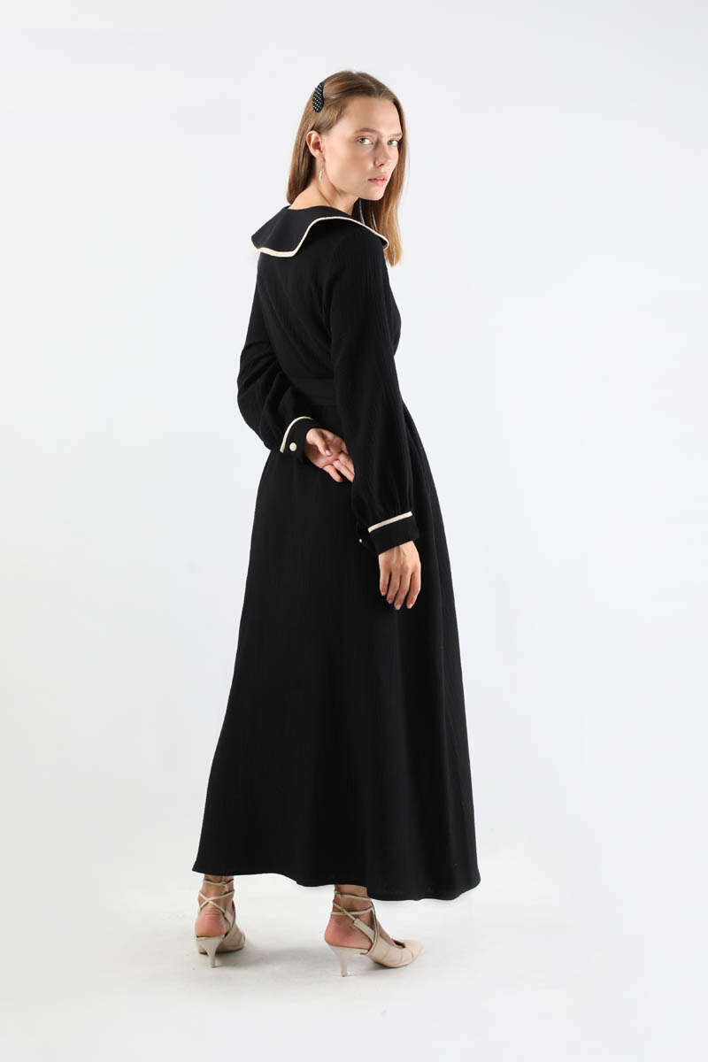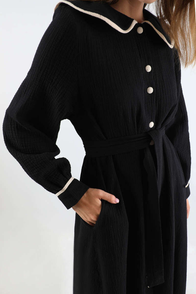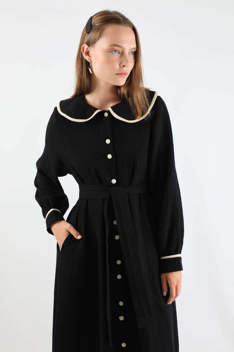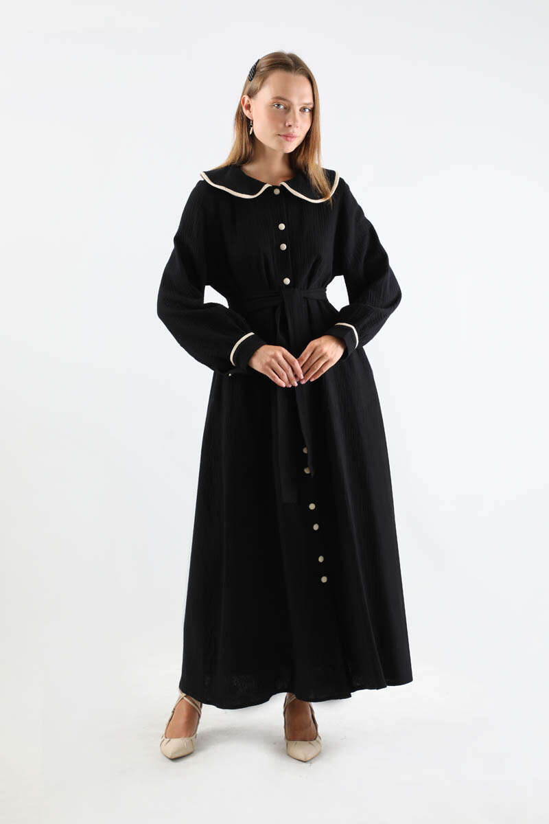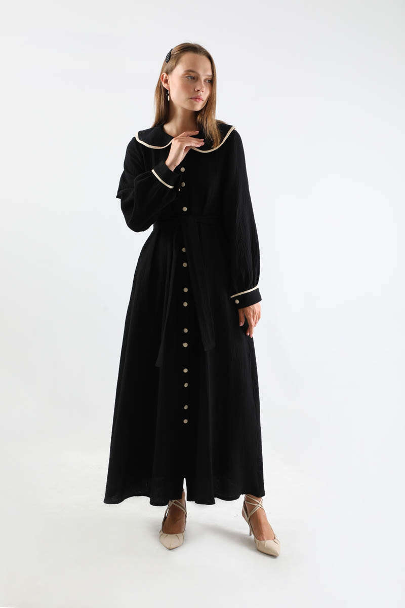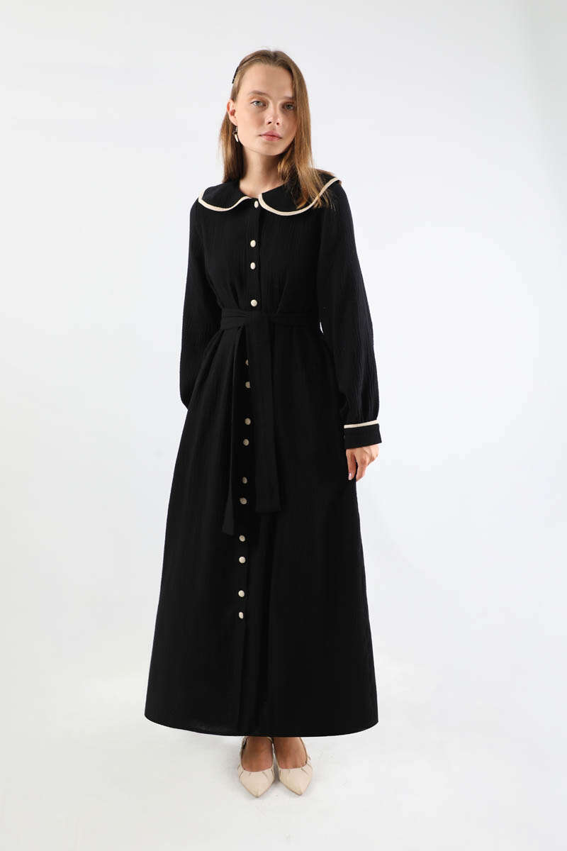 Bebe Yaka Müslin Elbise Siyah. Garnili bebe yakalıdır. Önü çift düğmelidir. Manşetinde garni detayı mevcuttur. Kuşaklıdır. Astarsızdır. Günlük kullanım ve özel günlerinizde tercih edebilirsiniz.
