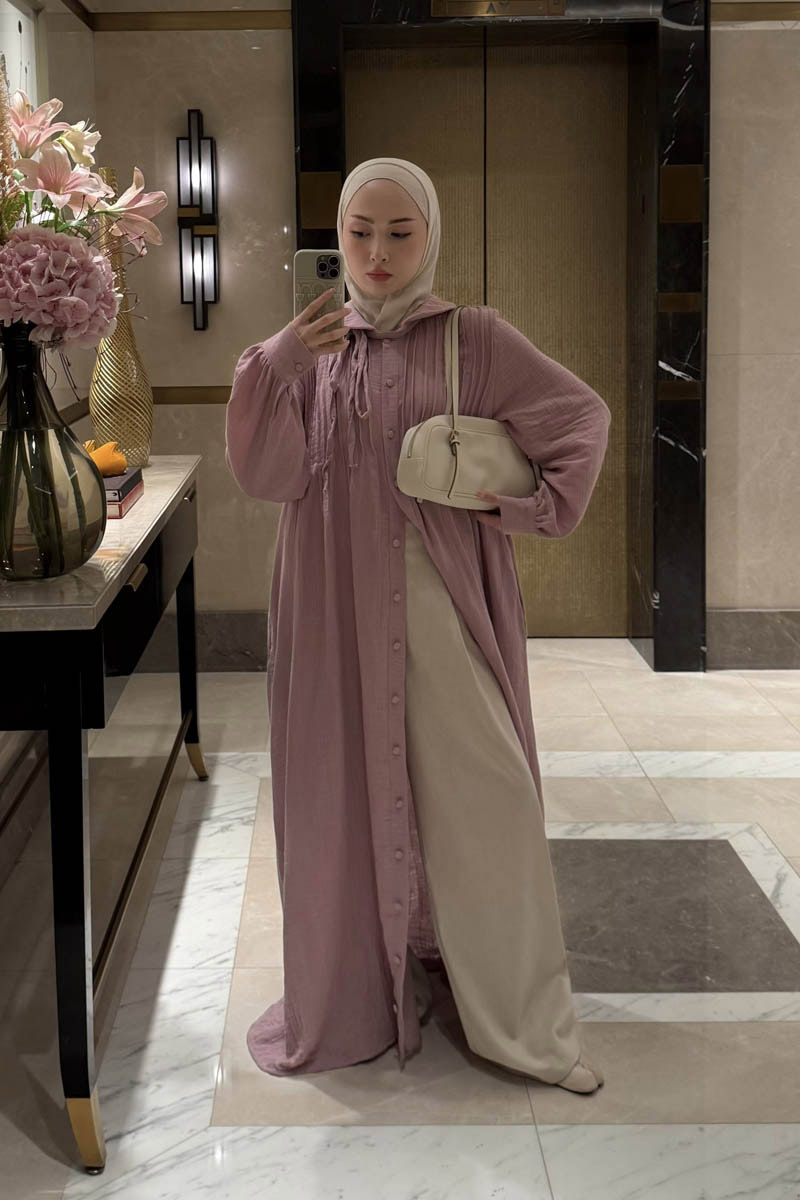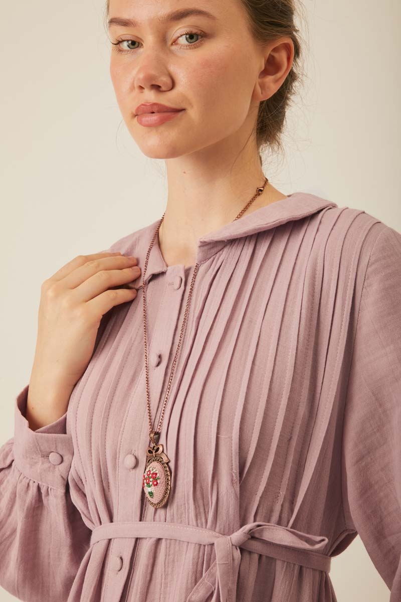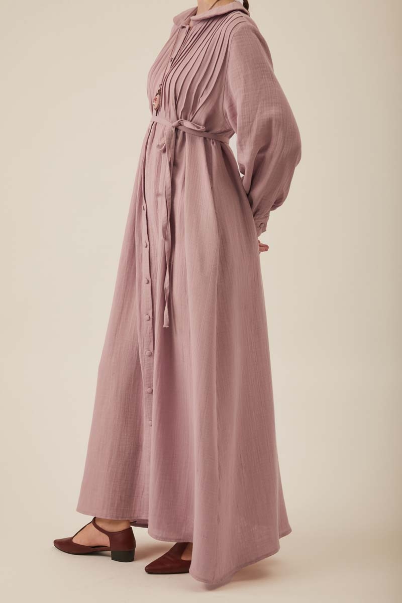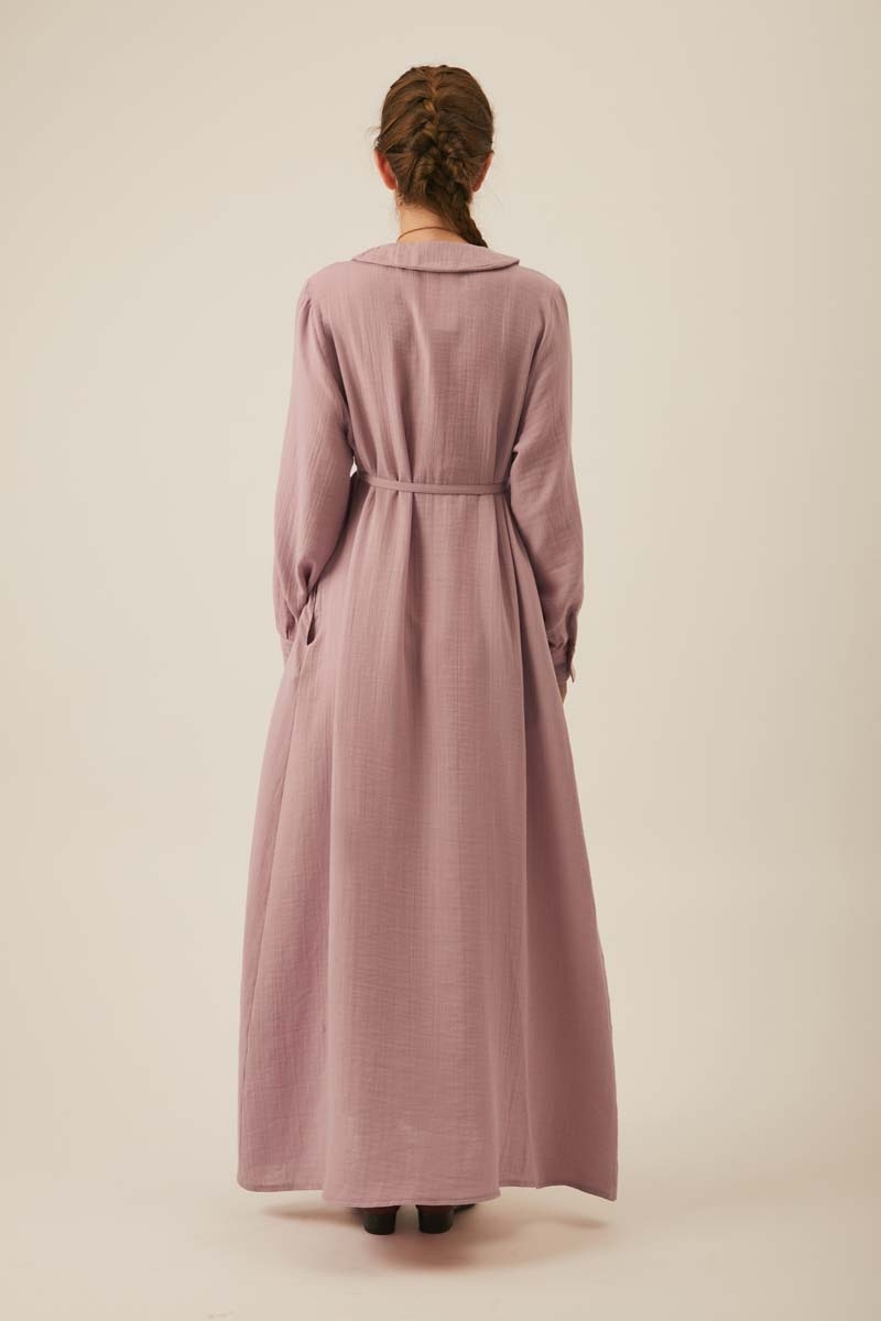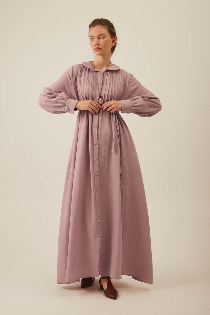 Crafted from natural, breathable muslin fabric, this dress offers all-day comfort. The classic Peter Pan collar adds a sweet, elegant touch, while the vertical pintuck details on the front bring depth and sophistication to the design. A slim waist tie gently hugs the silhouette, creating a feminine shape. The long, flowy skirt promises ease of movement and coolness on warm summer days, while maintaining a timeless elegance.